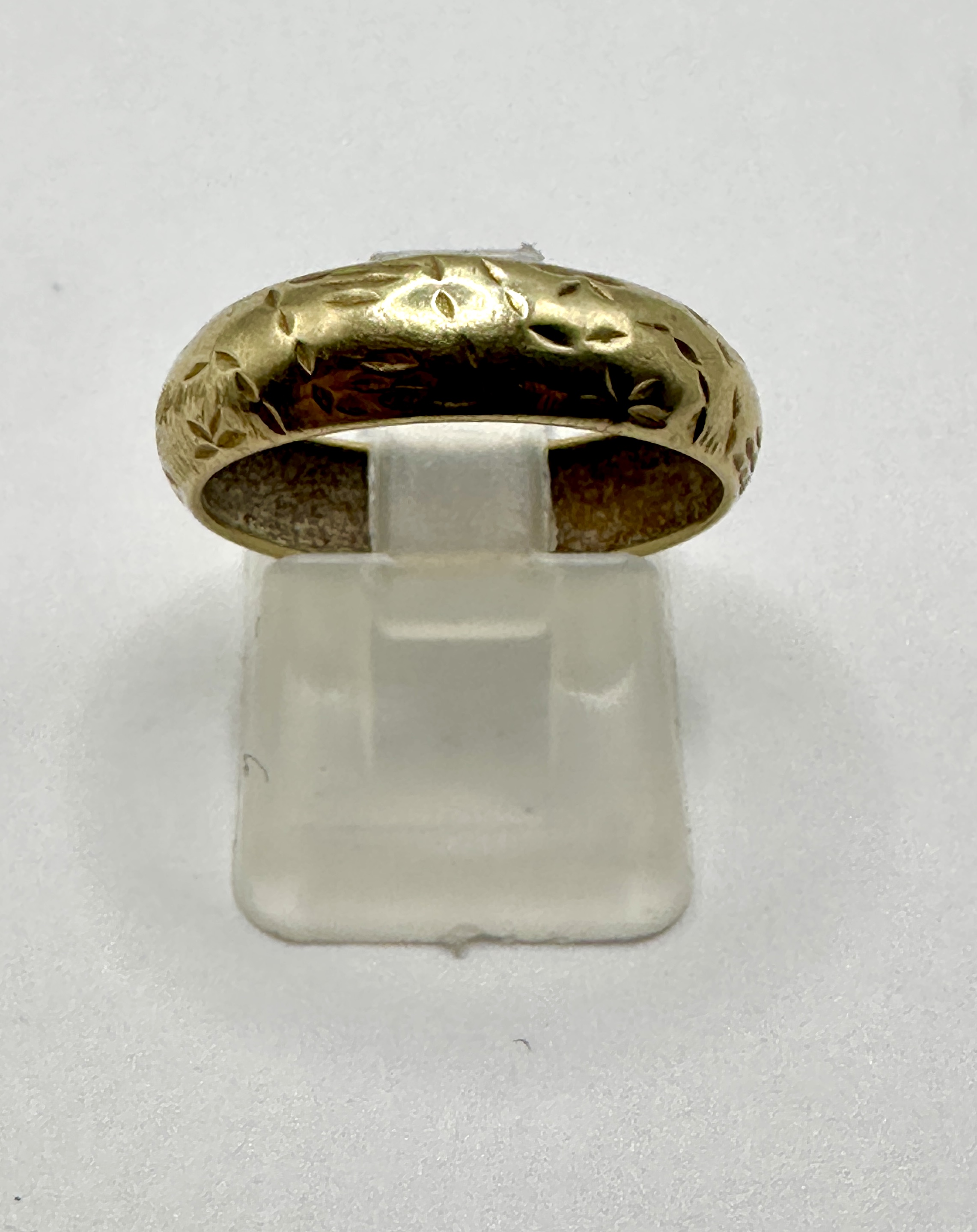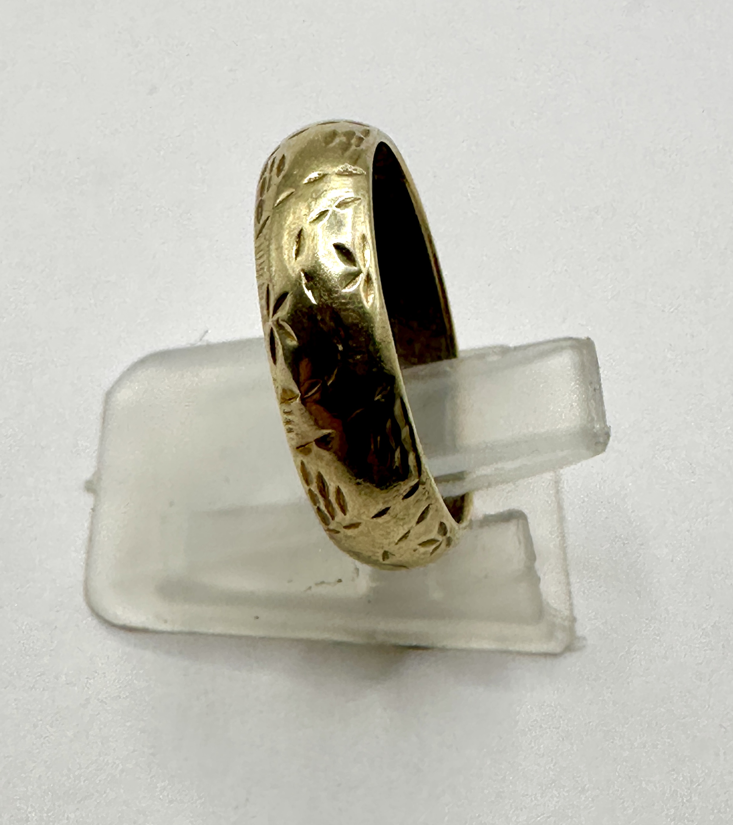 A 9k gold band ring featuring a rounded D-shaped profile. The exterior of the band is decorated with an all-over engraved motif of stylised leaves and floral elements. No internal hallmarks or maker’s marks are clearly visible on the interior of the piece.