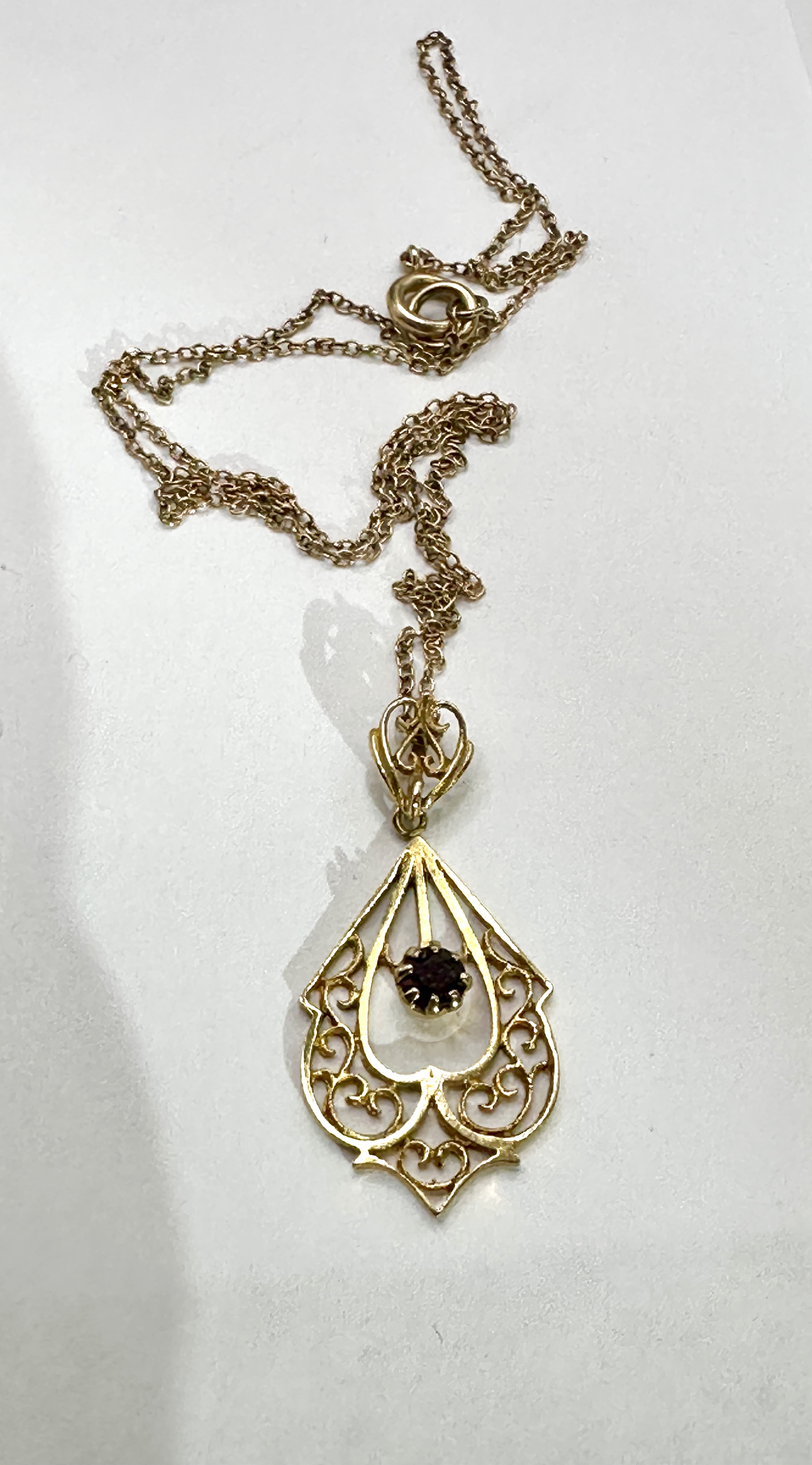 An 18k gold necklace featuring a teardrop-shaped pendant. The pendant is constructed with intricate openwork filigree scroll designs and is centrally set with a single round-cut dark red gemstone in a multi-prong setting. The pendant is suspended from a fine-link chain. The chain is secured with a spring-ring clasp.