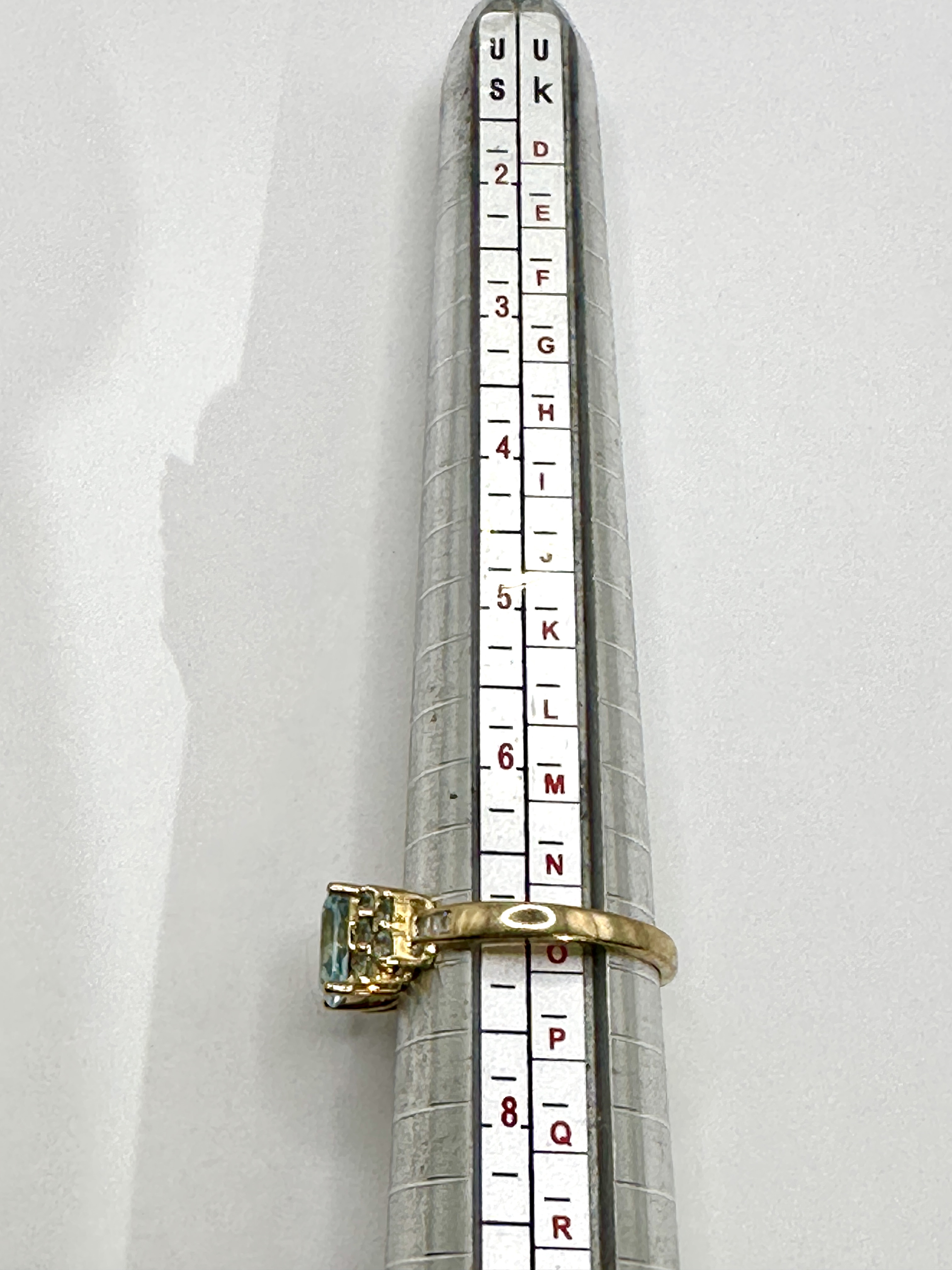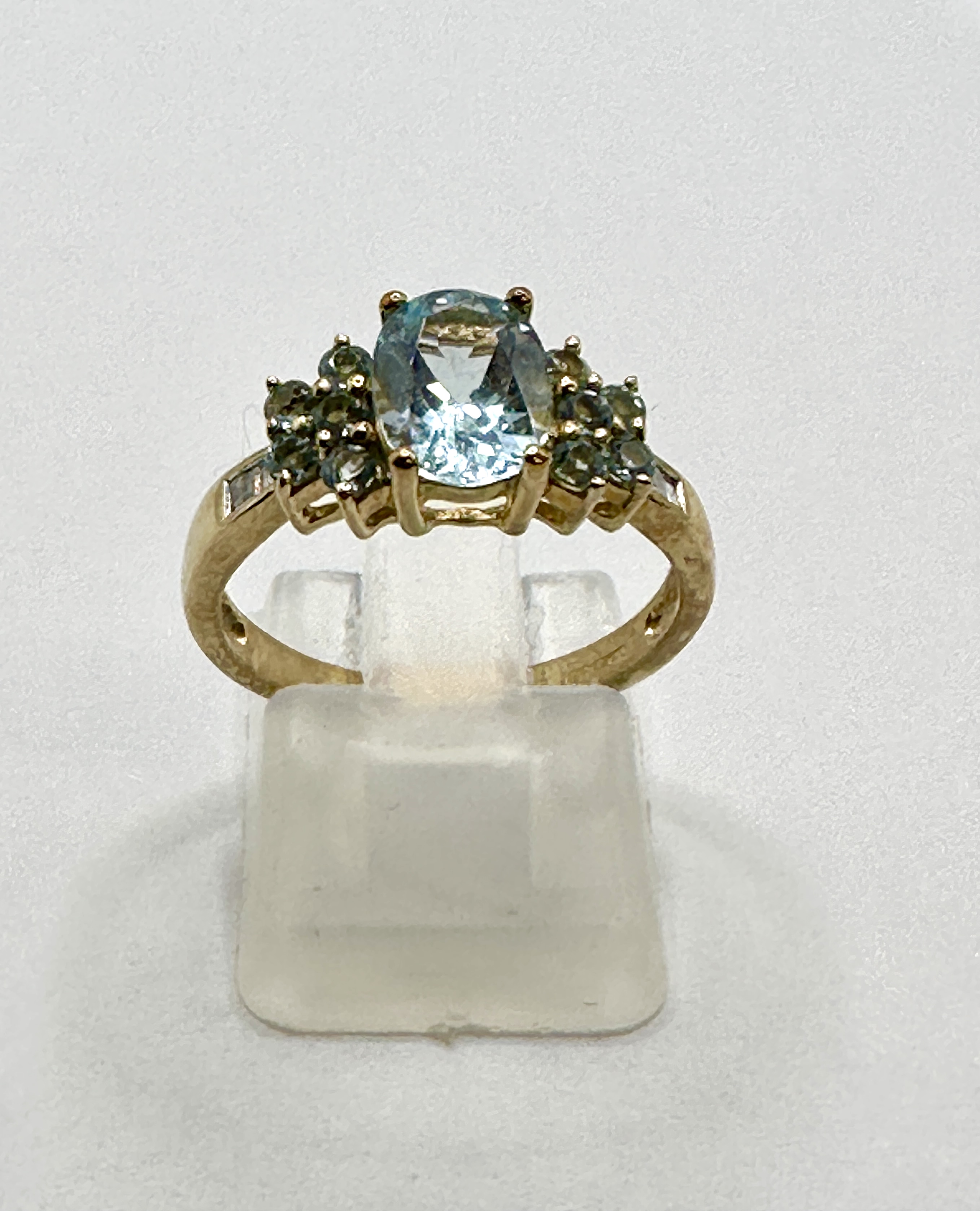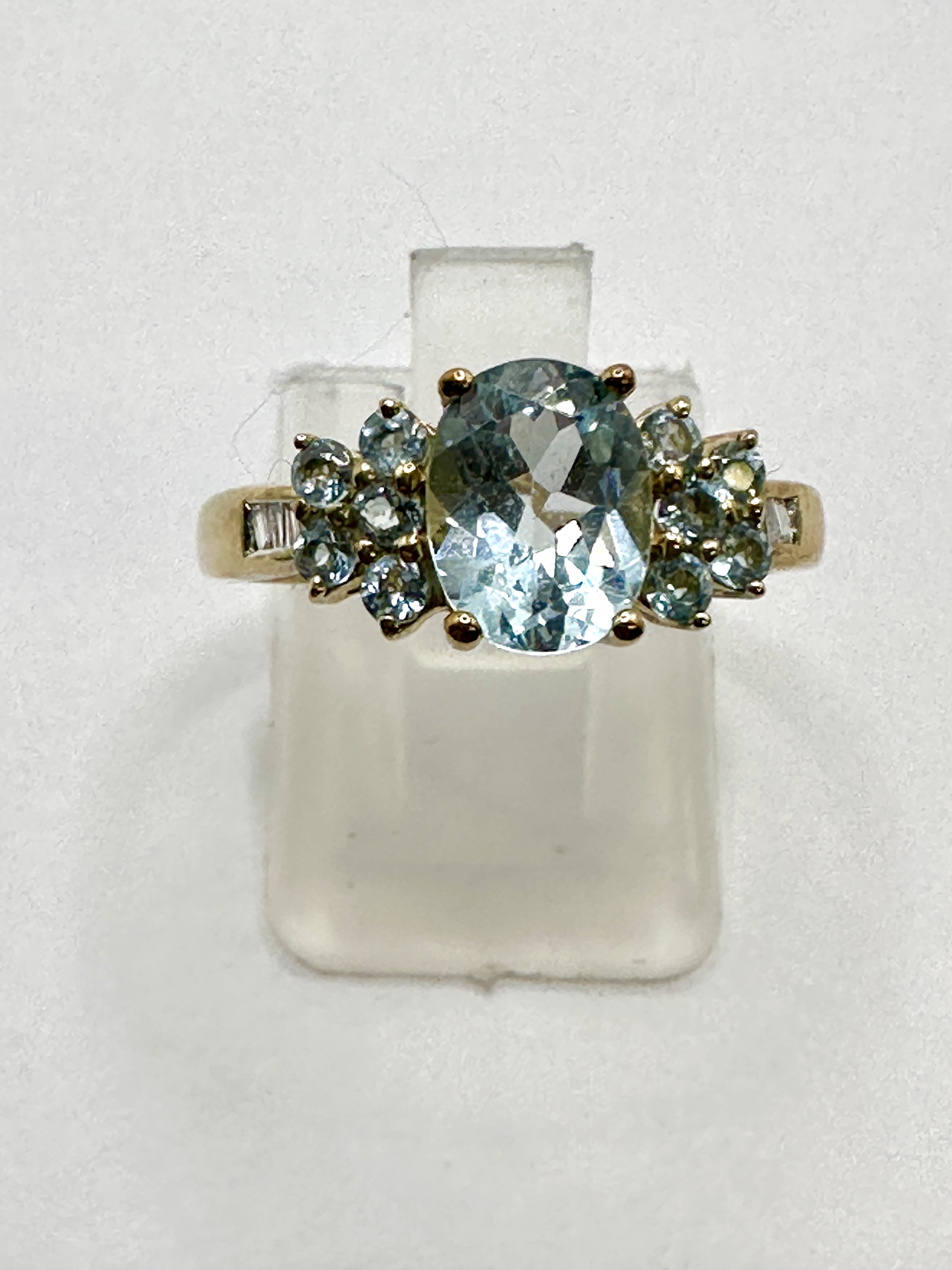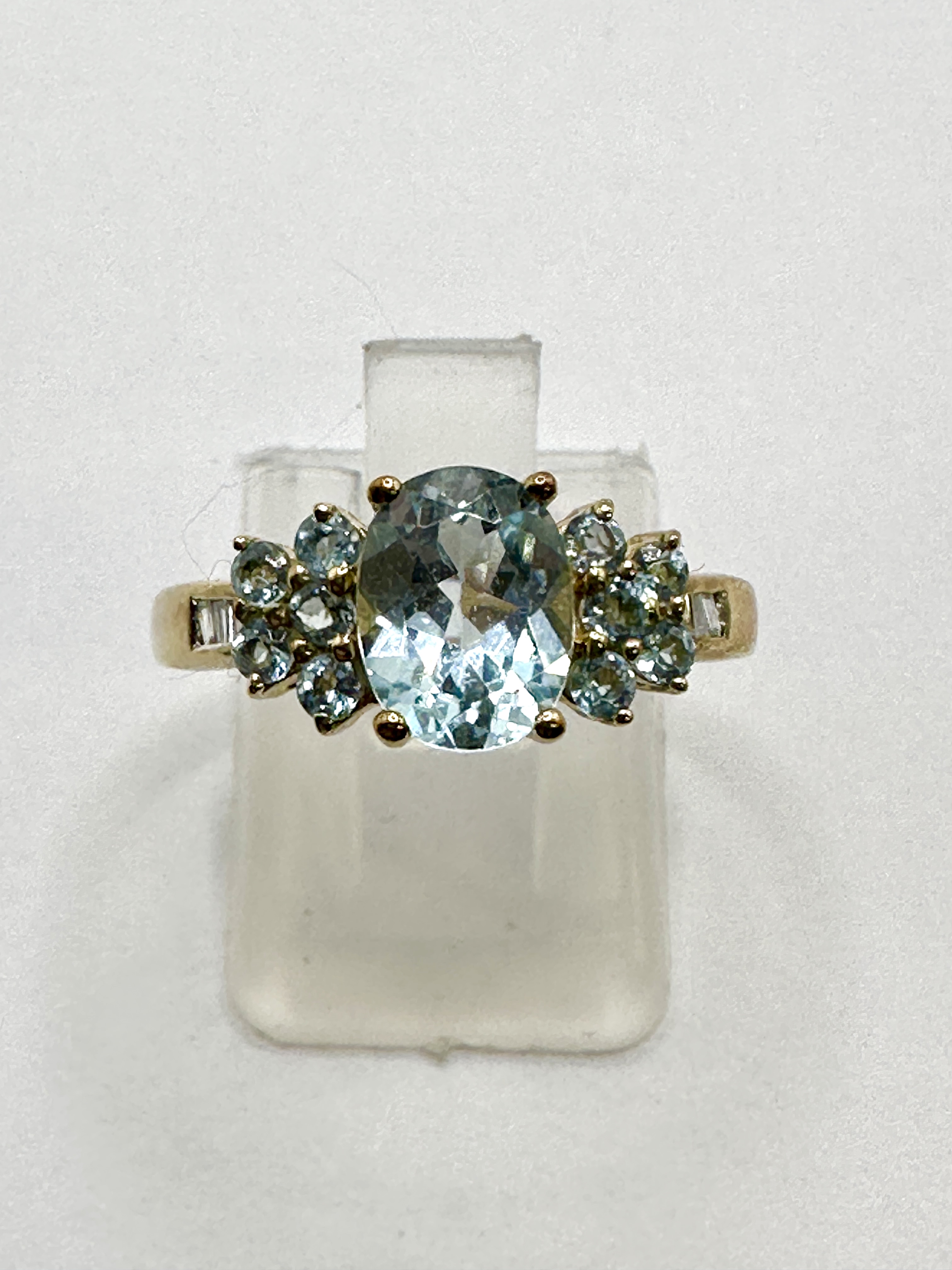 A 9k yellow gold ring featuring a central four-prong set oval-cut blue topaz. The centre stone is flanked by two clusters of small round-cut gemstones in a similar light blue-green hue. The shoulders of the band are further accented by small baguette-cut colourless diamonds. The band is constructed from polished 9k yellow gold.