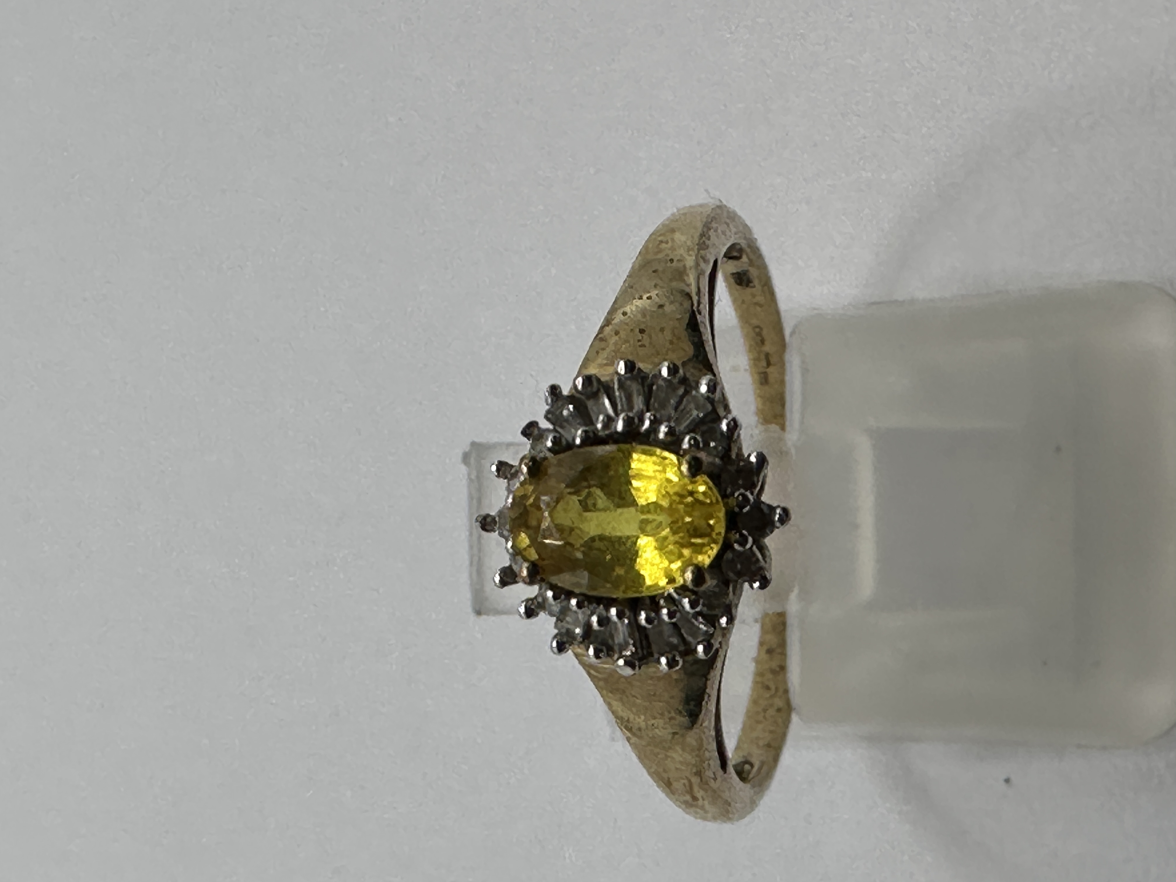 An STS Jewels 9k yellow gold cluster ring featuring a centrally set oval-cut yellow citrine. The central stone is surrounded by a tiered halo of round-cut and baguette-cut white topaz stones. The gemstones are secured in a raised basket setting atop a tapered 9k yellow gold band. The interior of the band contains small, indistinct hallmarks.