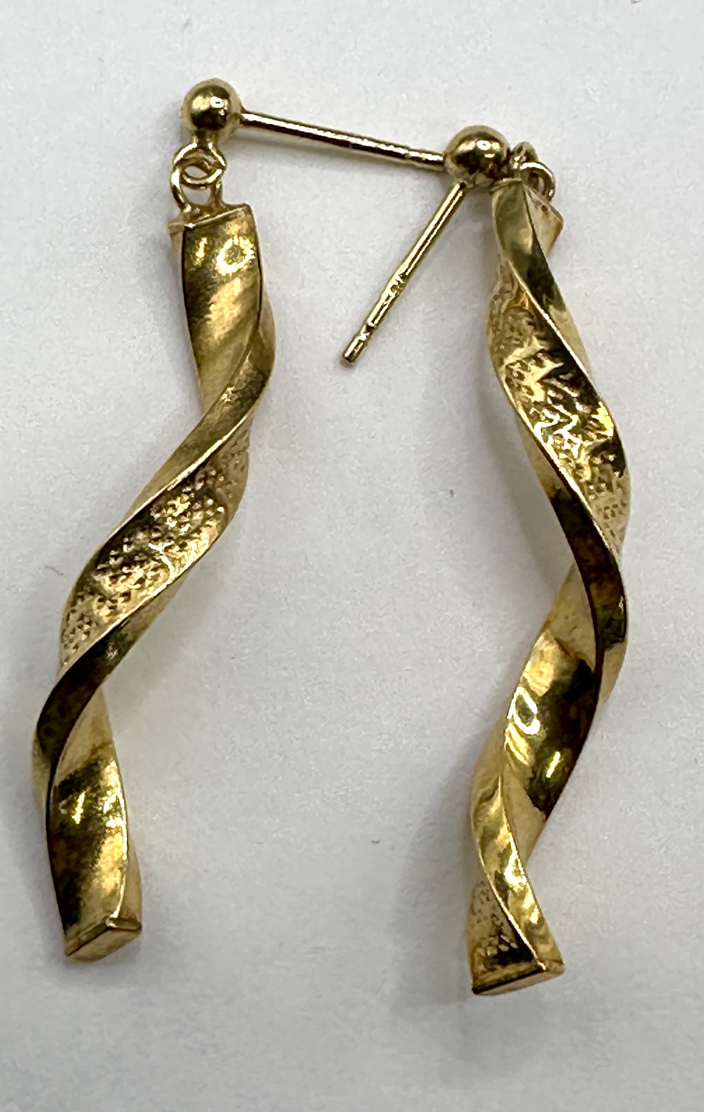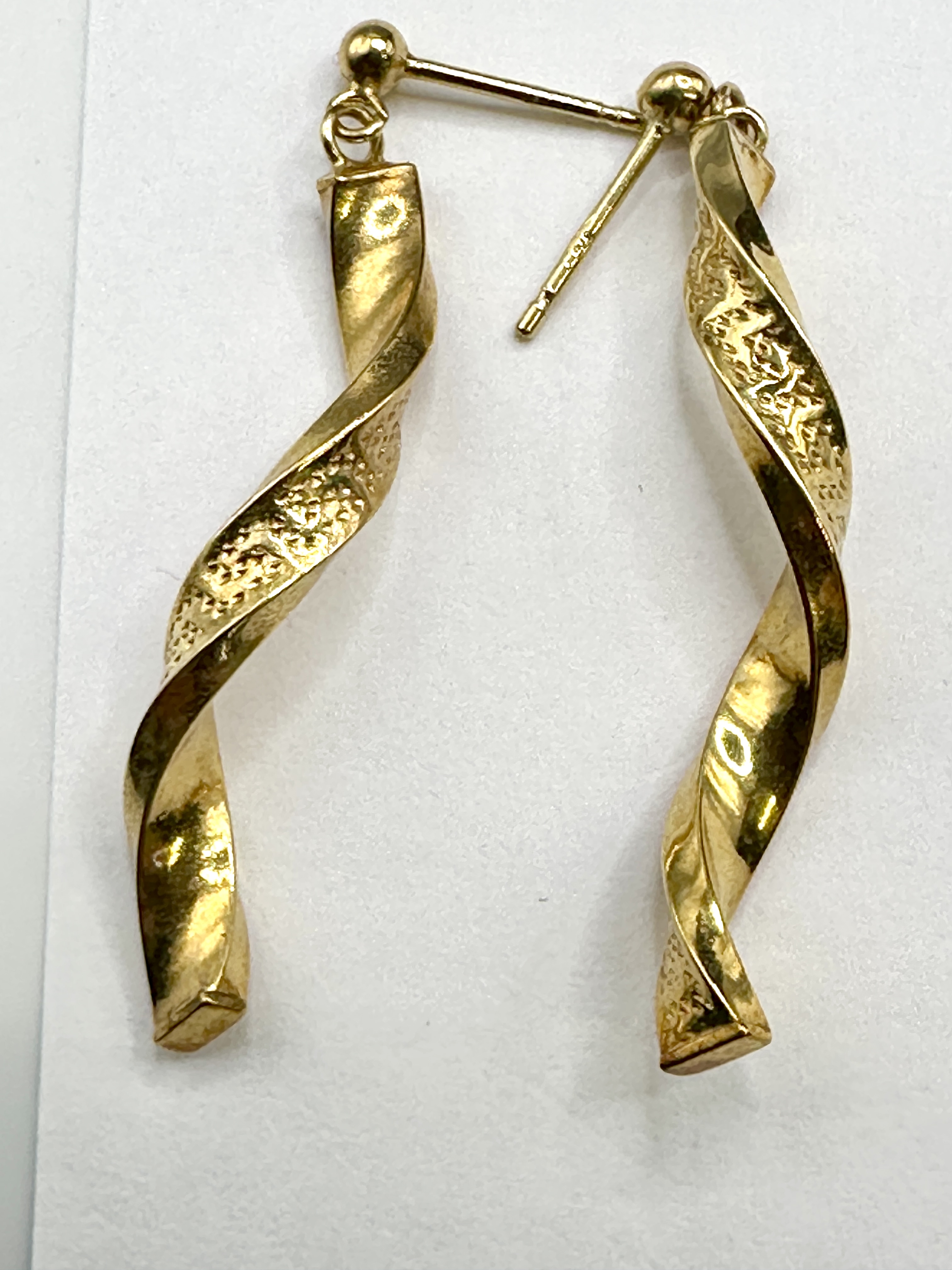 A pair of 9k yellow gold drop earrings featuring a contemporary twisted ribbon design. Each earring consists of a spiralling metal band that exhibits a dual-textured finish, with one surface highly polished and the opposing side featuring a contrasting stippled texture. The drops are suspended from simple ball posts. A hallmark is visible on the earring post.