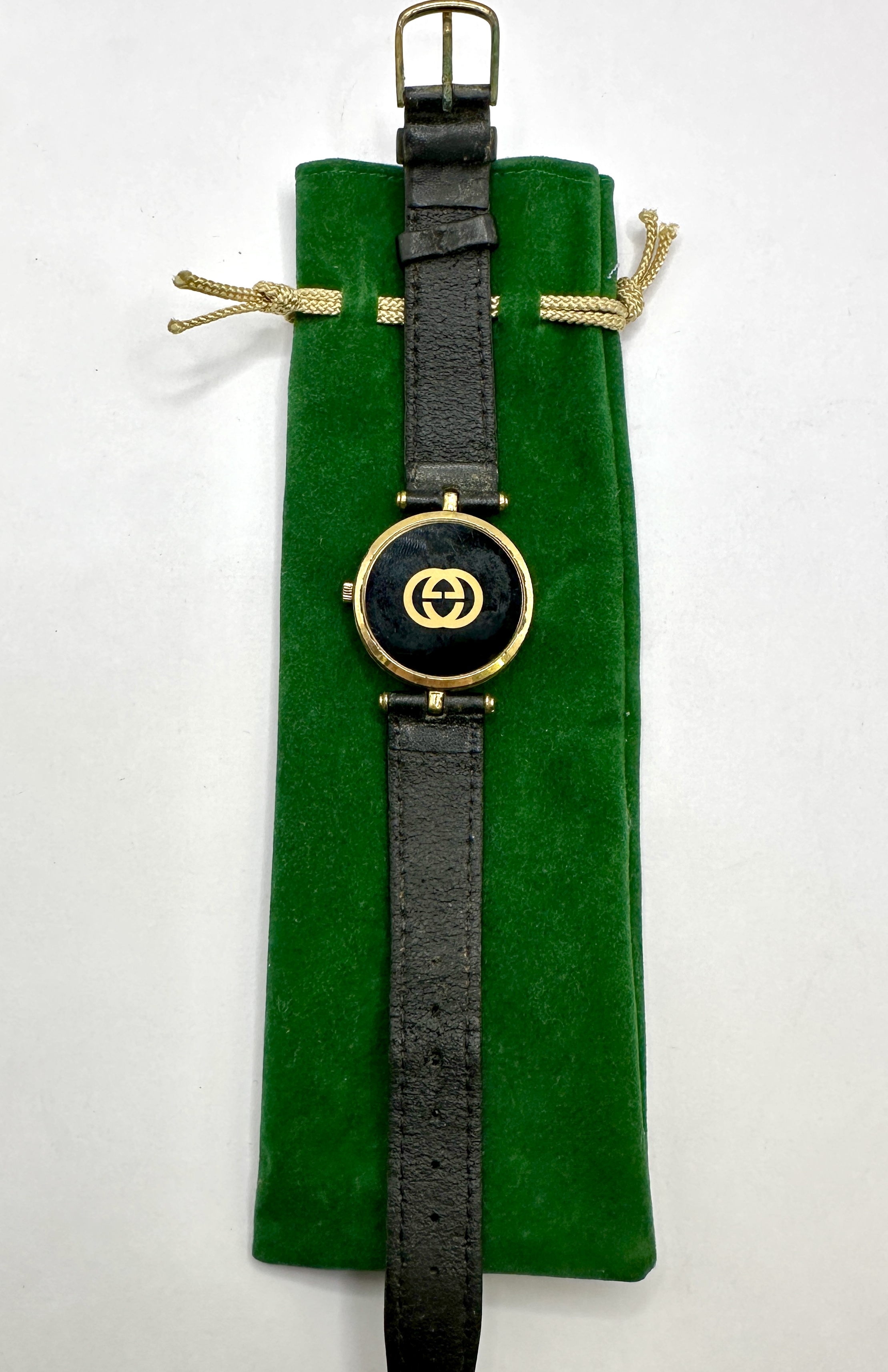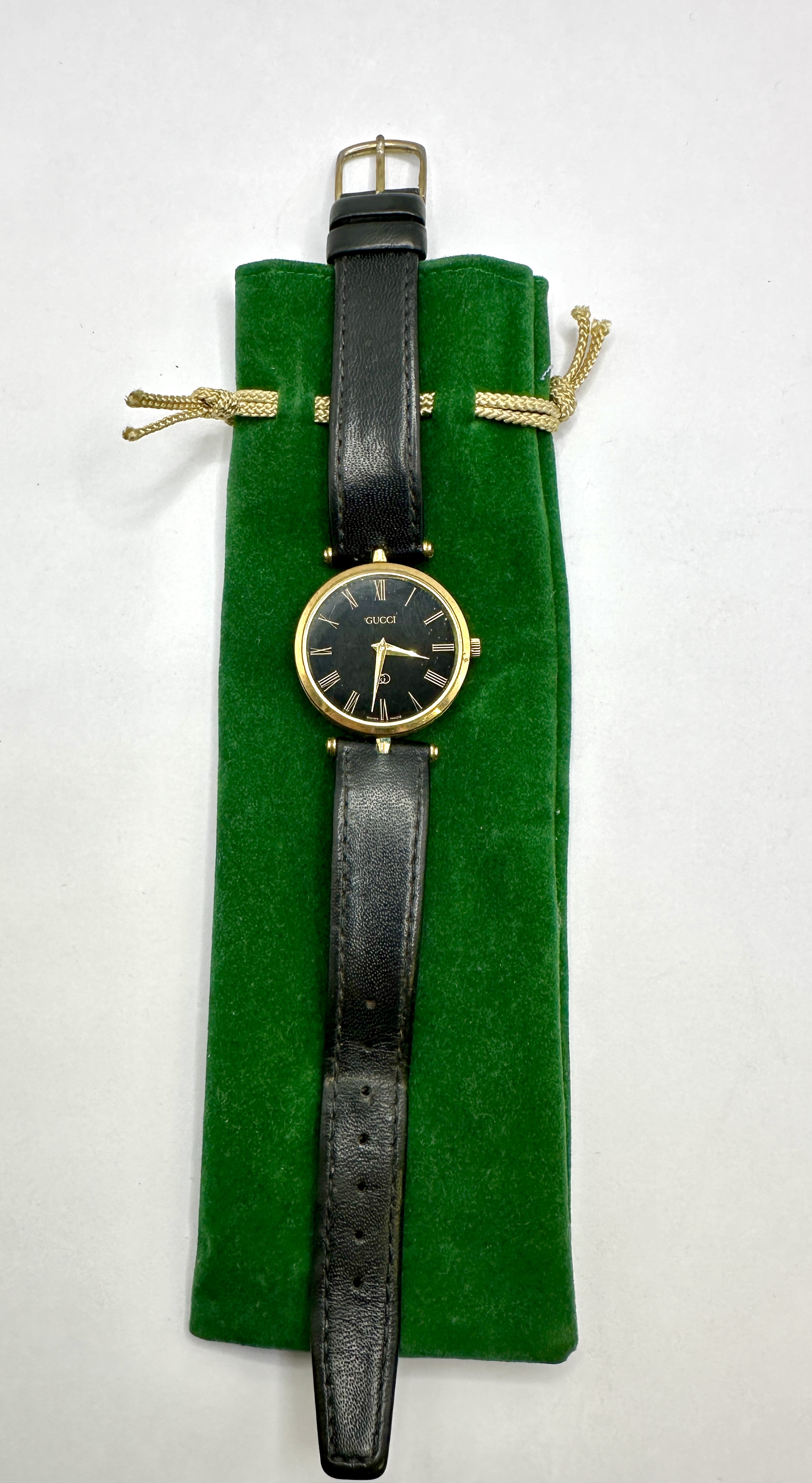 A Gucci Sherry Line wristwatch featuring a round gold-toned case and a black dial with gold-toned Roman numeral indices and three hands. The dial is signed GUCCI and SWISS MADE with an interlocking GG logo positioned above the six o’clock mark. The reverse features a gold-toned interlocking GG logo on the case back. The watch is mounted on a black leather strap with a gold-toned buckle. Included is a green velvet-style drawstring pouch with gold-coloured cords.