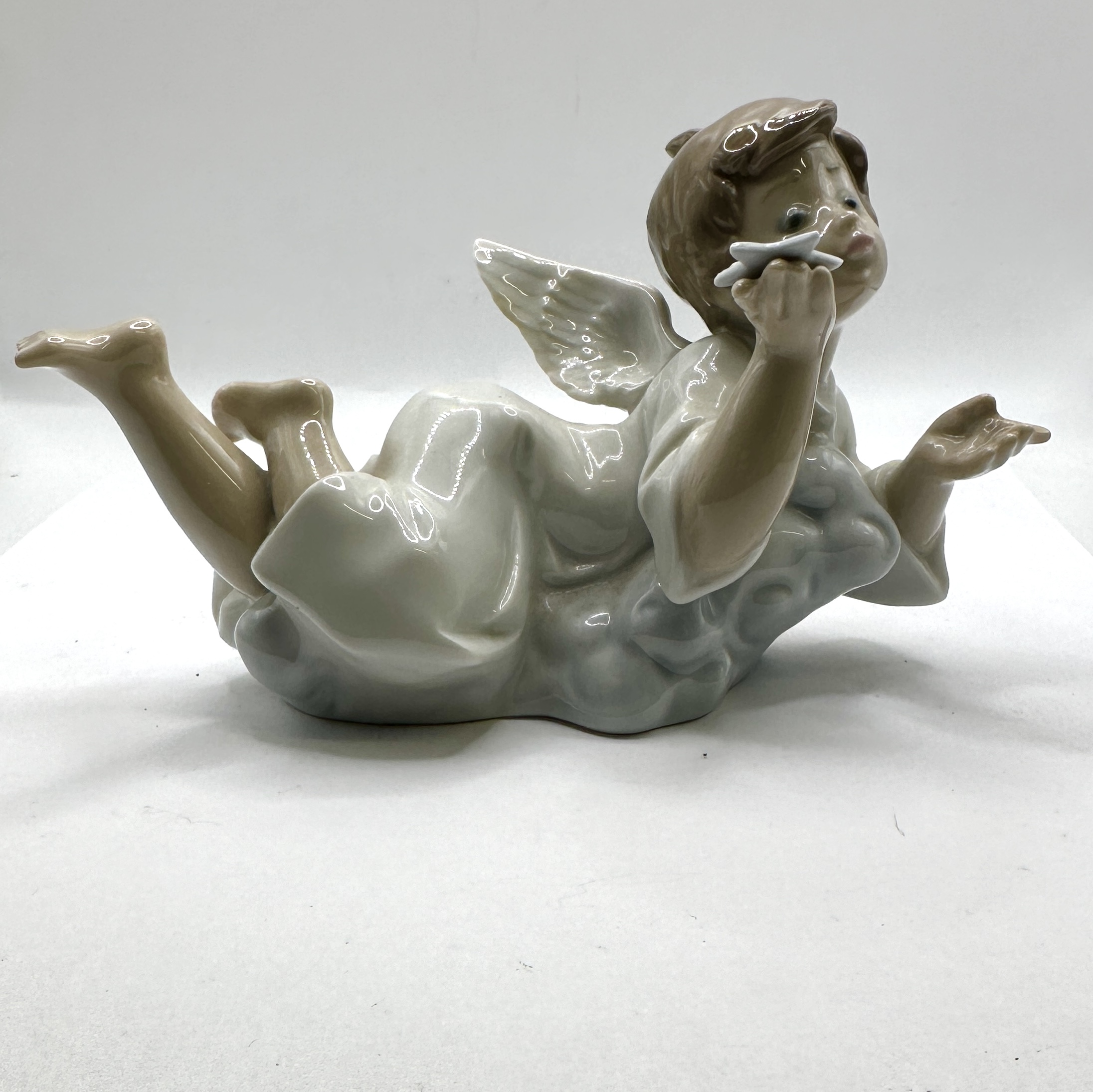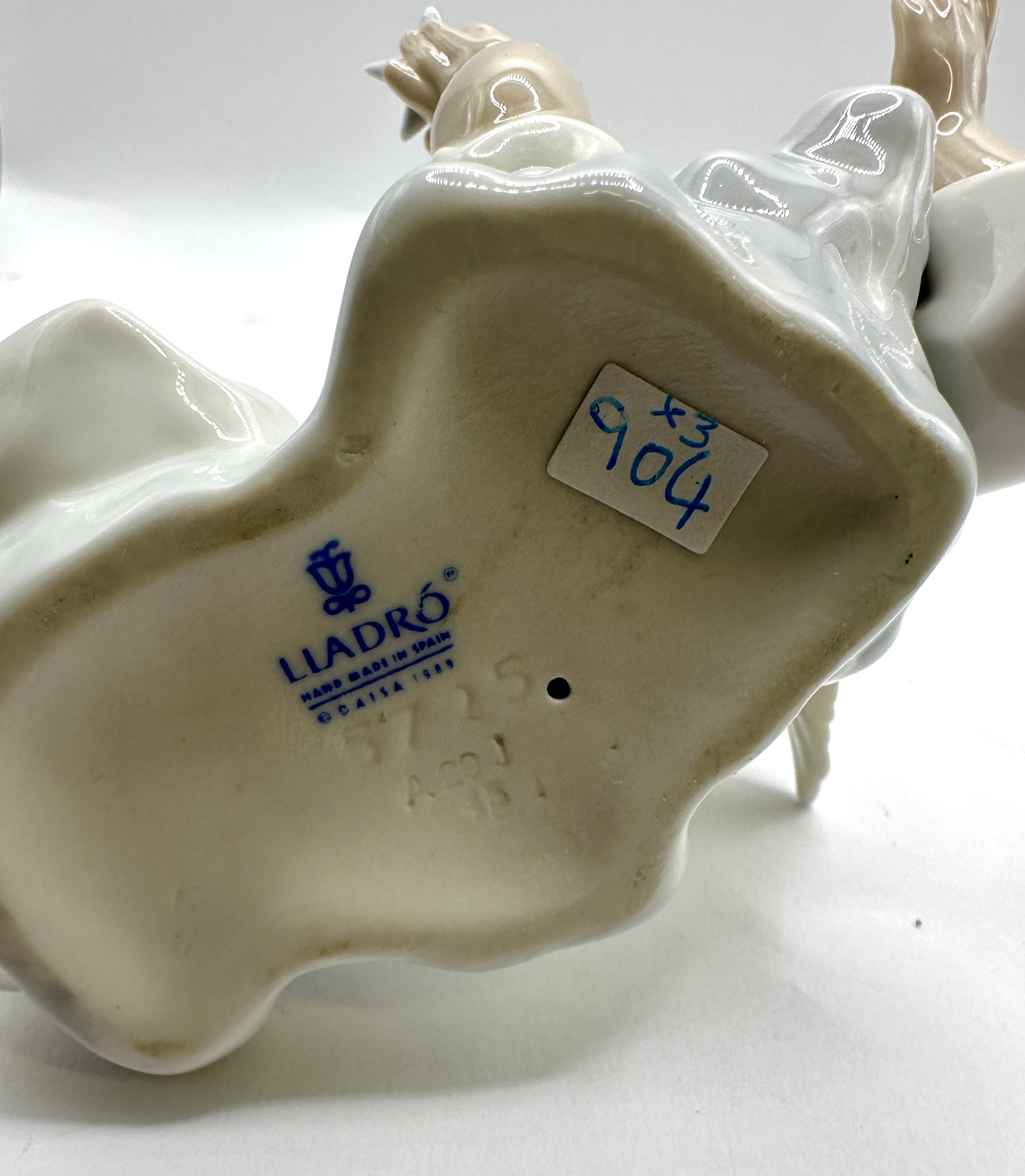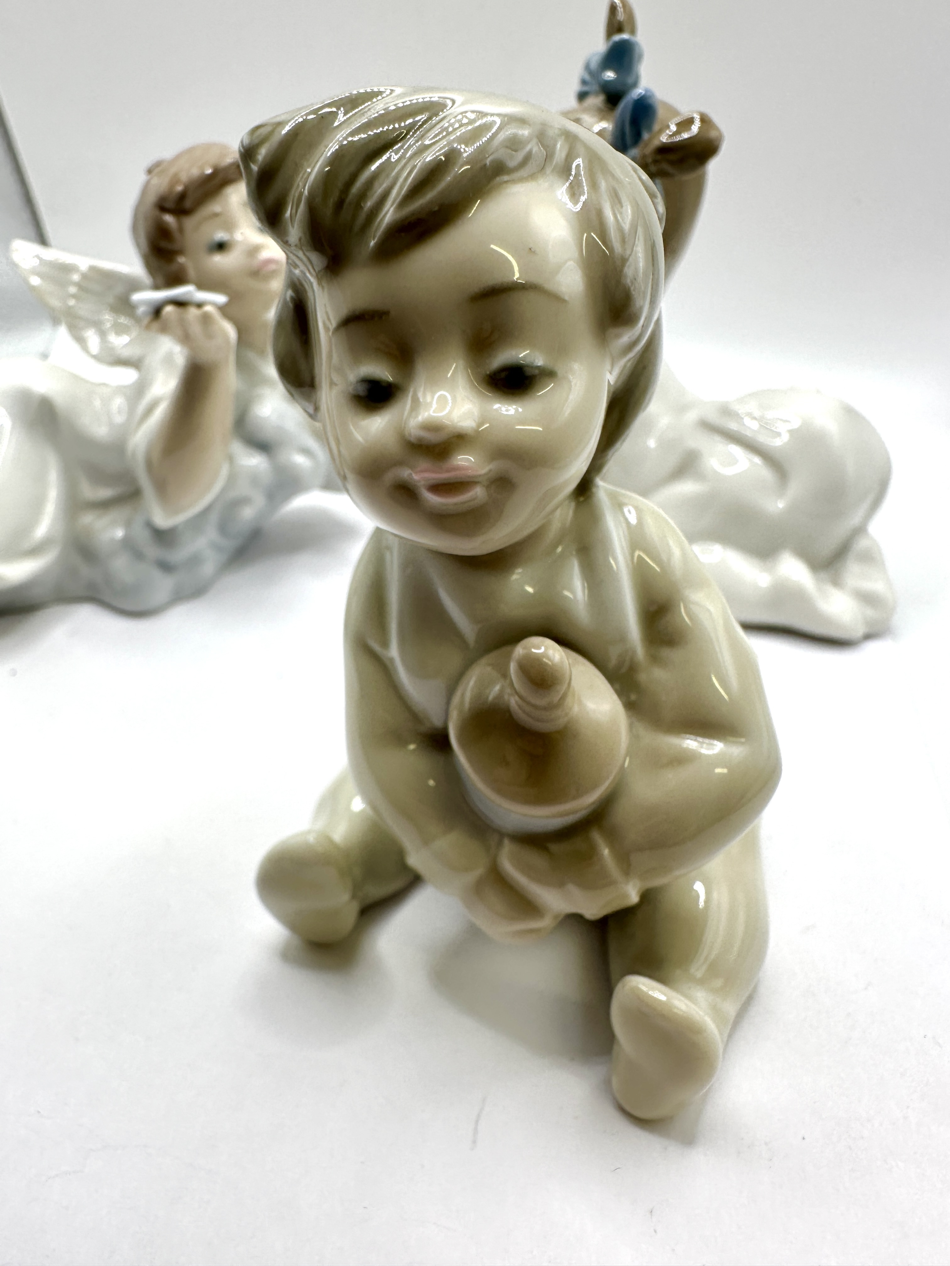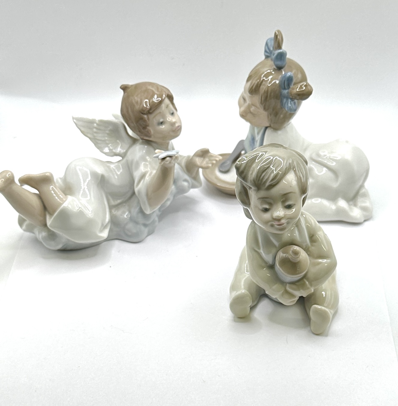 A trio of glazed porcelain figurines by Lladró, handmade in Spain. The collection features a reclining angel figure resting on a cloud and holding a small white star, identified as the Angel Lying Down model. Also included is a seated infant holding a baby bottle and a young girl with blue bows in her hair leaning over a bowl. Each piece is constructed from porcelain and finished with a high-gloss glaze in a muted colour palette. The underside of the angel figurine bears the blue underglaze Lladró maker mark, the copyright inscription © DAISA 1989, and the impressed model number 5725.