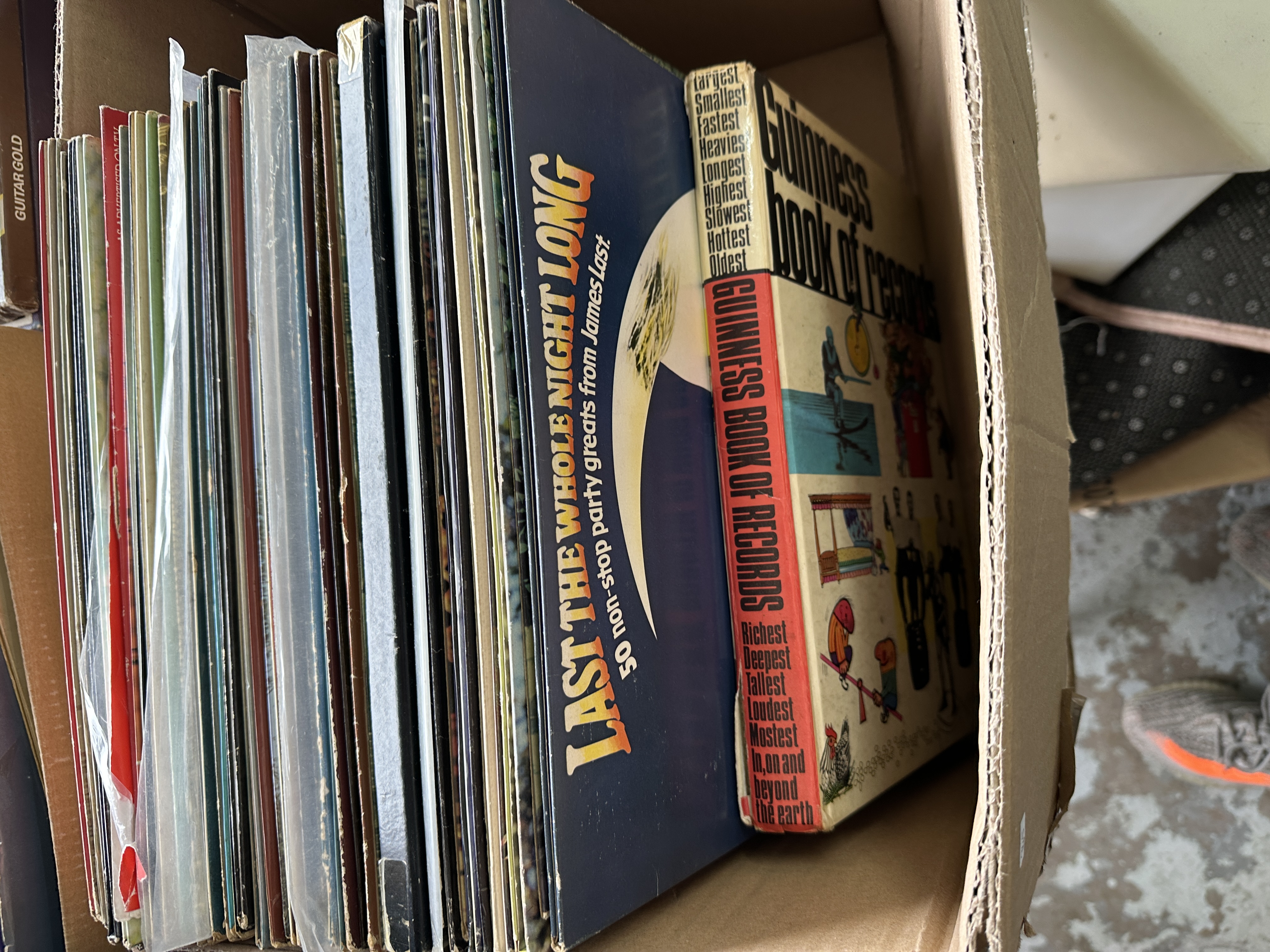 This collection comprises an assortment of vintage vinyl records and a single hardcover book, housed within a cardboard box. The media includes a James Last LP titled Last the Whole Night Long (50 non-stop party greats) and a vintage edition of the Guinness Book of Records featuring a multi-coloured spine. The records are contained within printed cardboard sleeves, some of which are fitted with protective plastic outer covers. The collection represents various musical genres and reference material from the mid-to-late 20th century.