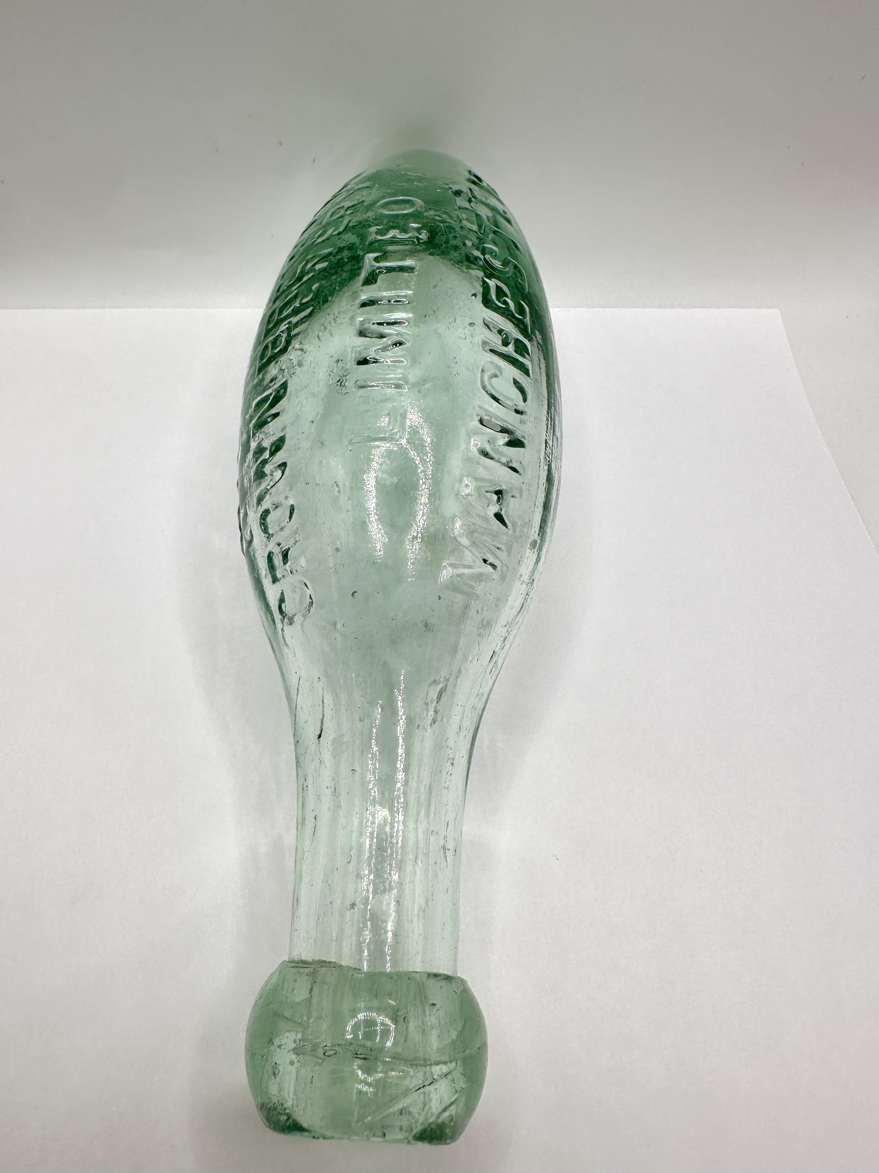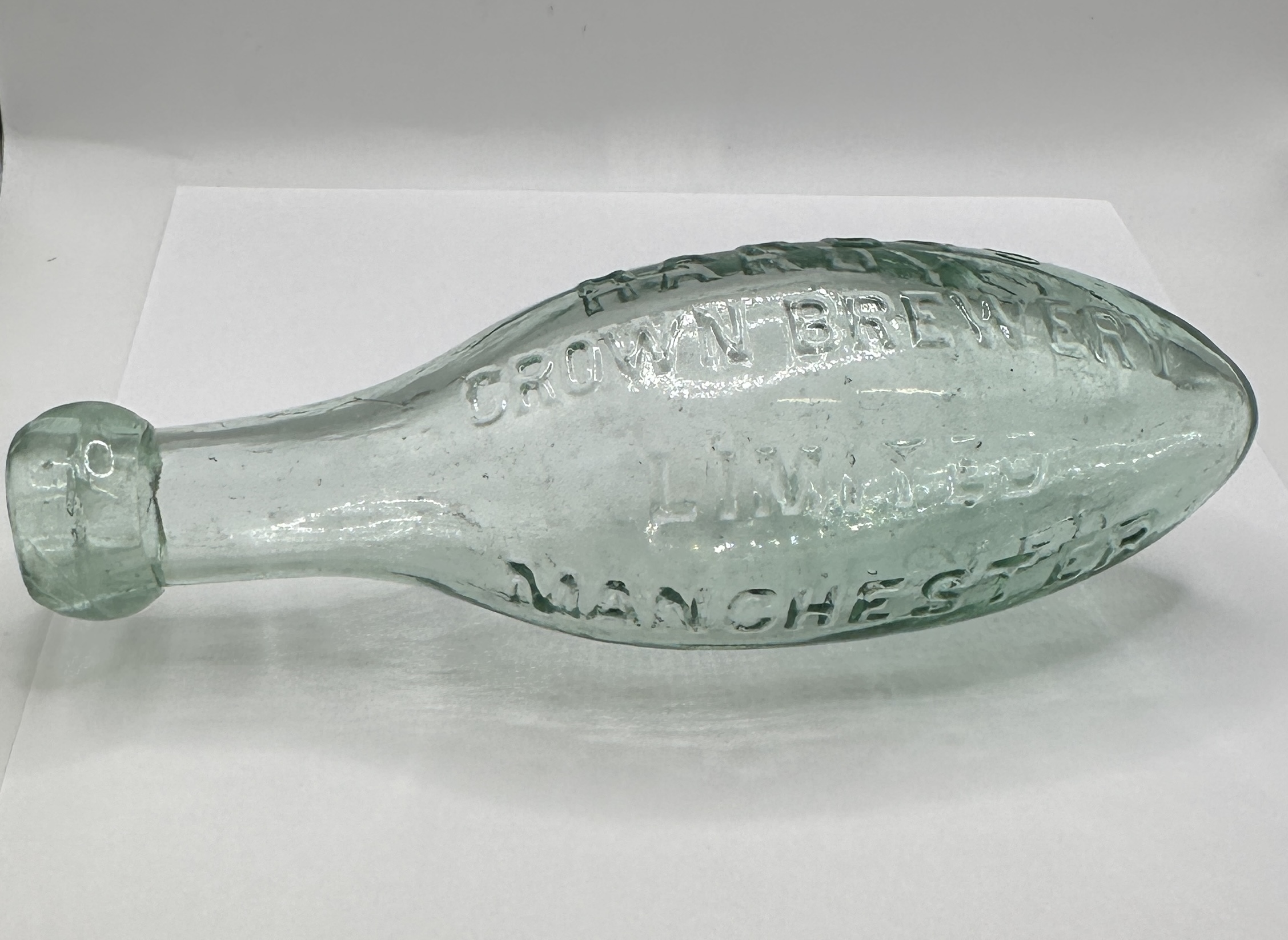 A 19th-century Hamilton-style torpedo bottle for Hardys Crown Brewery Limited, Manchester. The vessel is mould-blown in light aqua glass and features the characteristic pointed base and a thickened blob top finish at the neck. The side of the bottle displays prominent embossed lettering reading HARDYS CROWN BREWERY LIMITED MANCHESTER. The glass construction shows typical period manufacturing traits, including internal seed bubbles and flow lines.