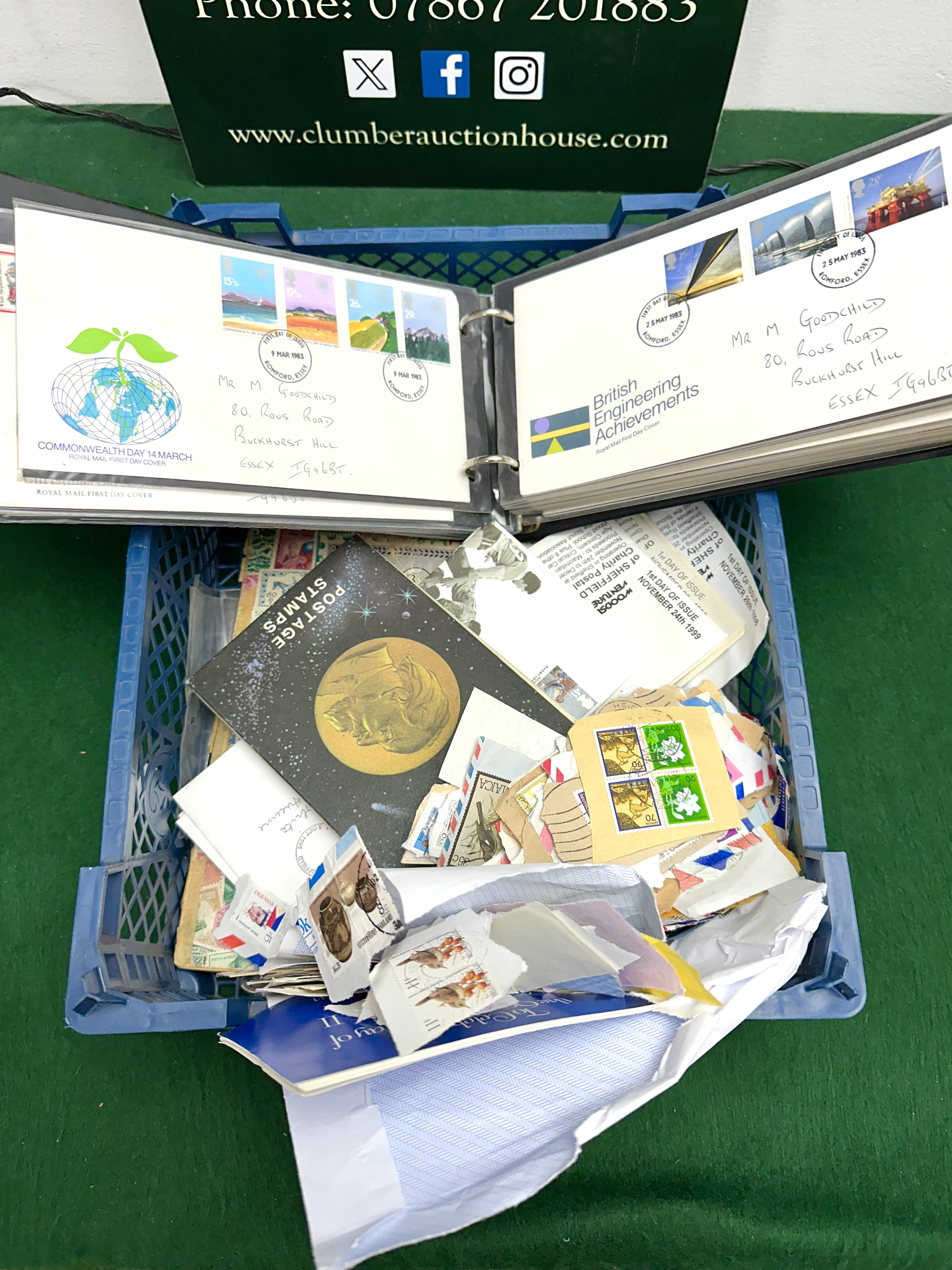 A collection of philatelic items and ephemera, primarily dating from the late 20th century. The lot includes several Royal Mail First Day Covers, notably a 1983 Commonwealth Day issue and a 1983 British Engineering Achievements issue, both bearing postmarks from Romford, Essex, and addressed to Buckhurst Hill, Essex. Also present are various loose postage stamps from regions including Great Britain and Jamaica, alongside philatelic booklets such as the Charity of Sheffield Postal Venture dated 1999. The materials consist of paper and card, with a portion of the collection housed in a black ring-bound album containing plastic sleeves. The items are contained within a blue plastic storage crate.