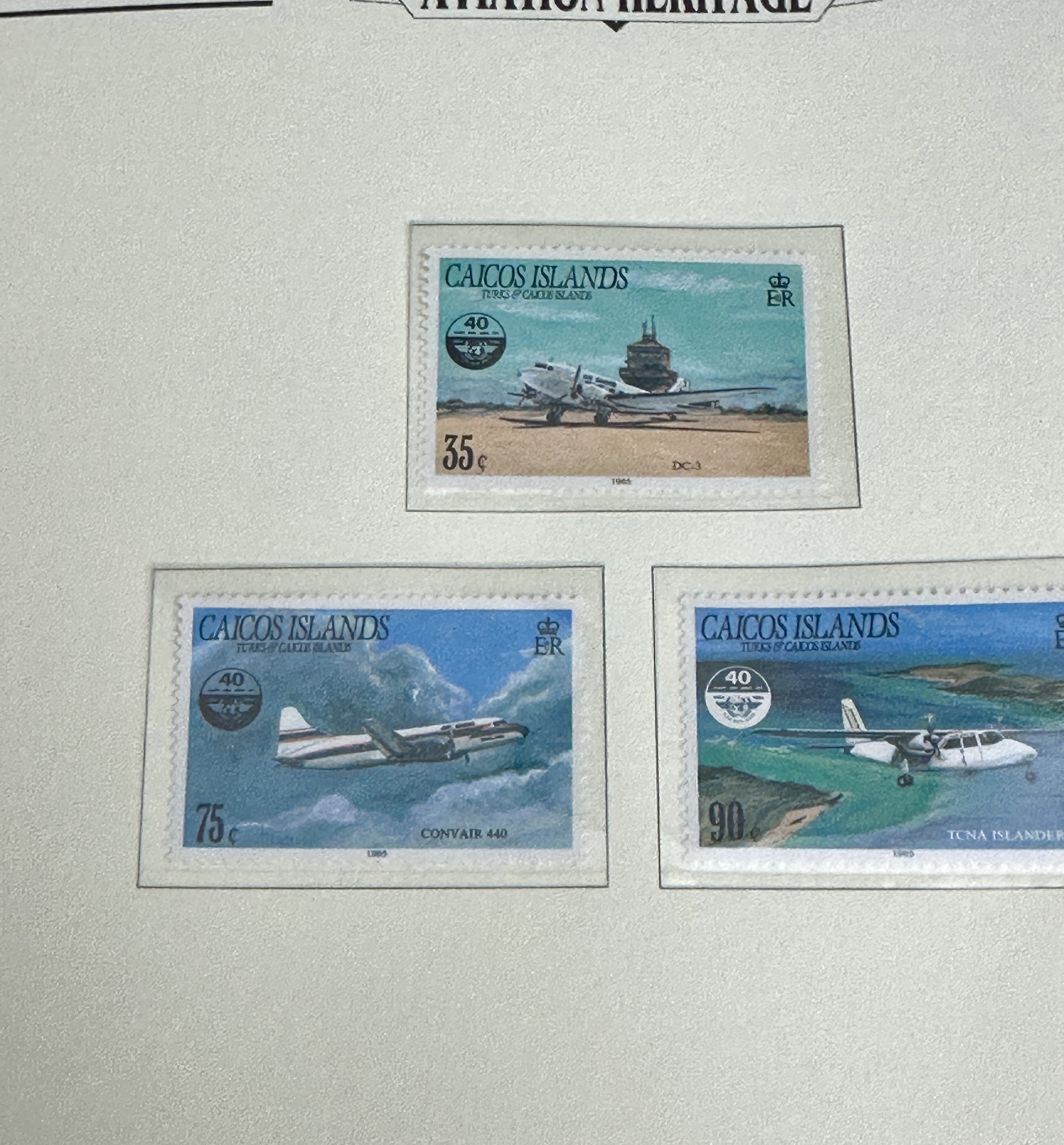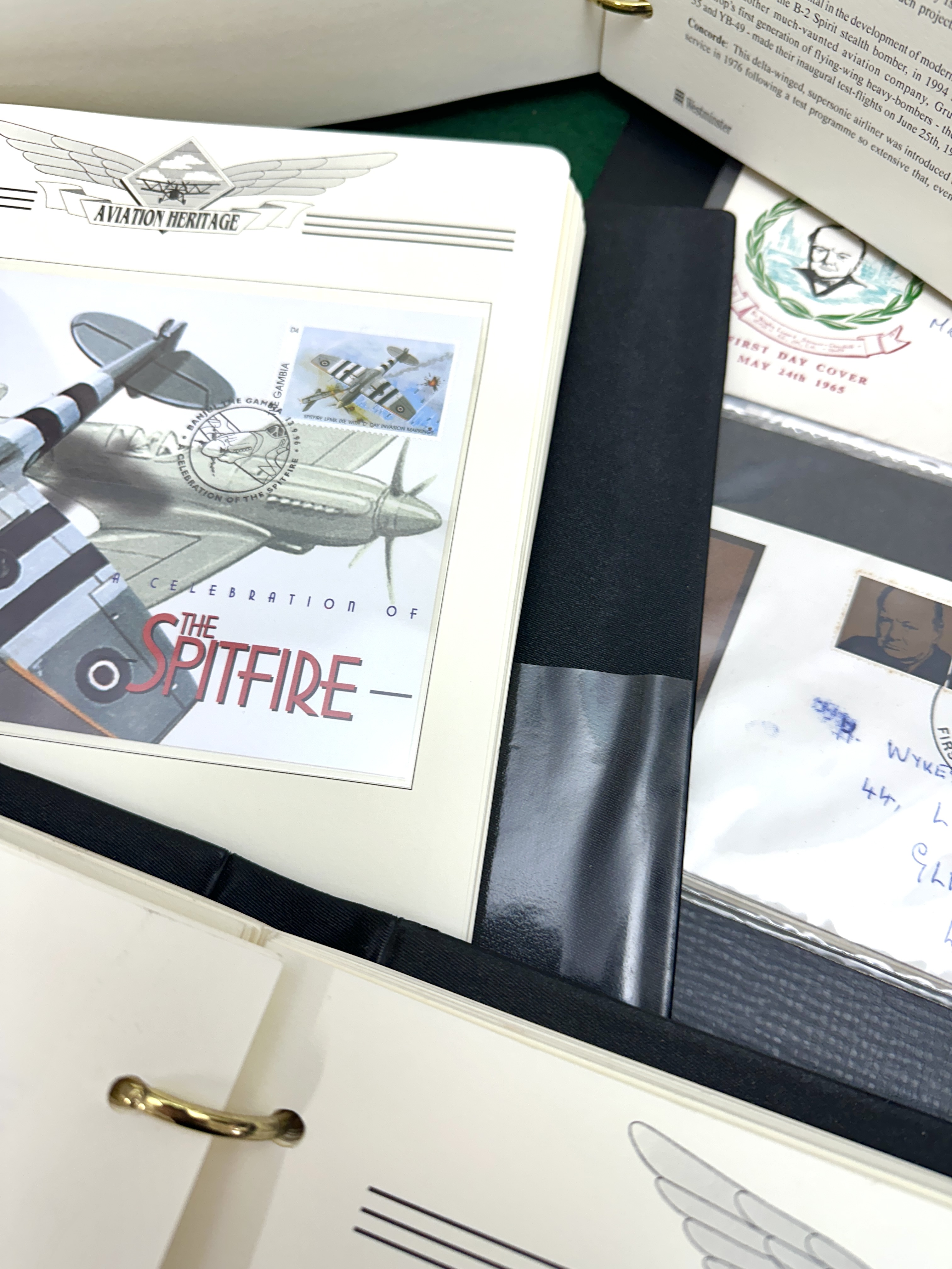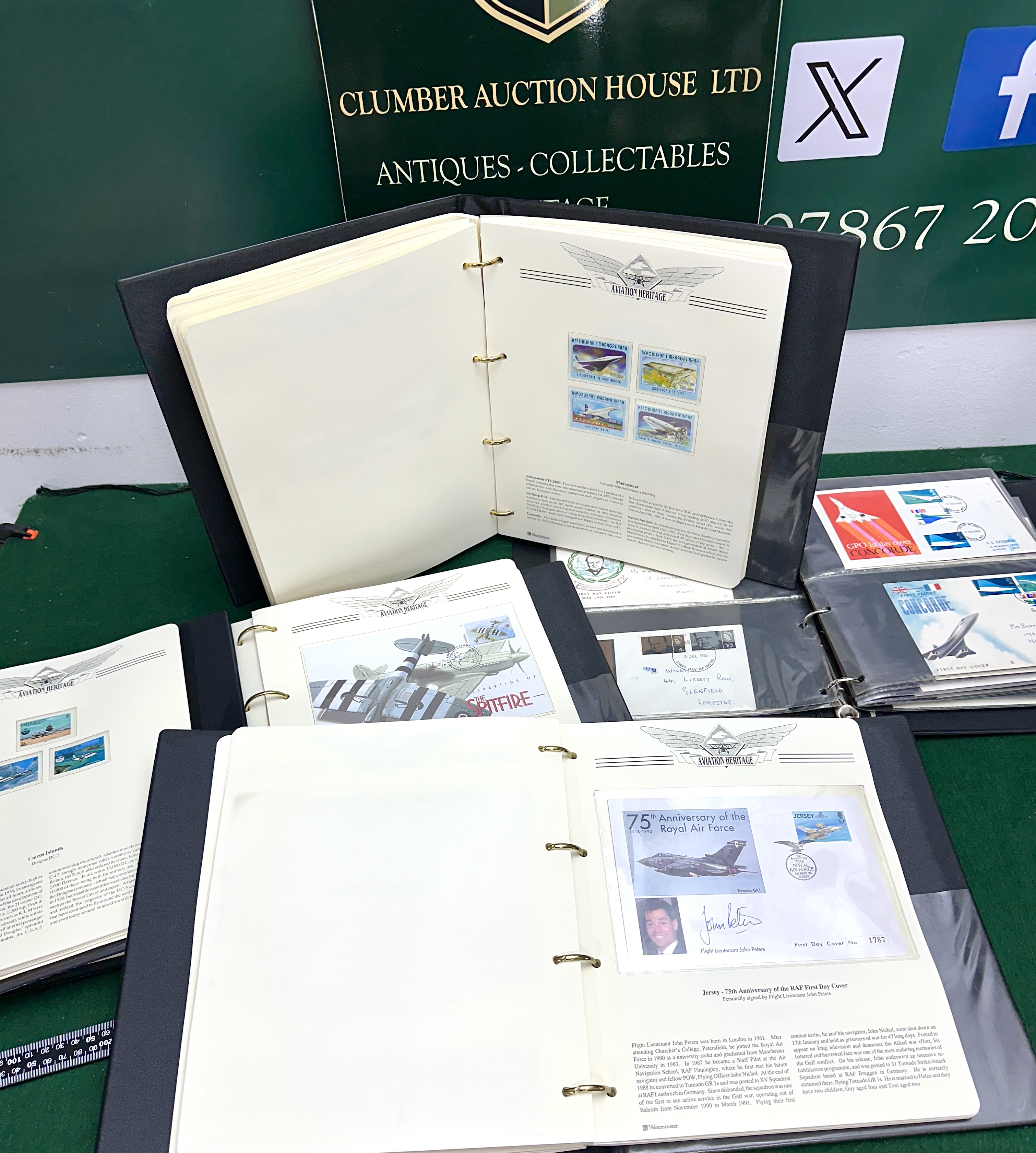 A collection of Westminster Aviation Heritage philatelic binders containing a range of postage stamps, souvenir sheets, and first day covers. The collection focuses on historic and modern aircraft, featuring themed pages for the Supermarine Spitfire, Concorde, and various commercial and military planes. Included are issues from multiple territories such as Jersey, the Caicos Islands, and Madagascar (Republikan’i Madagasikara). Notable items comprise a Jersey first day cover commemorating the 75th Anniversary of the Royal Air Force (1918-1993) bearing the signature of Flight Lieutenant John Peters, alongside GPO first day covers for the Concorde. The items are presented in black multi-ring binders with printed descriptive text on the individual mounting pages.