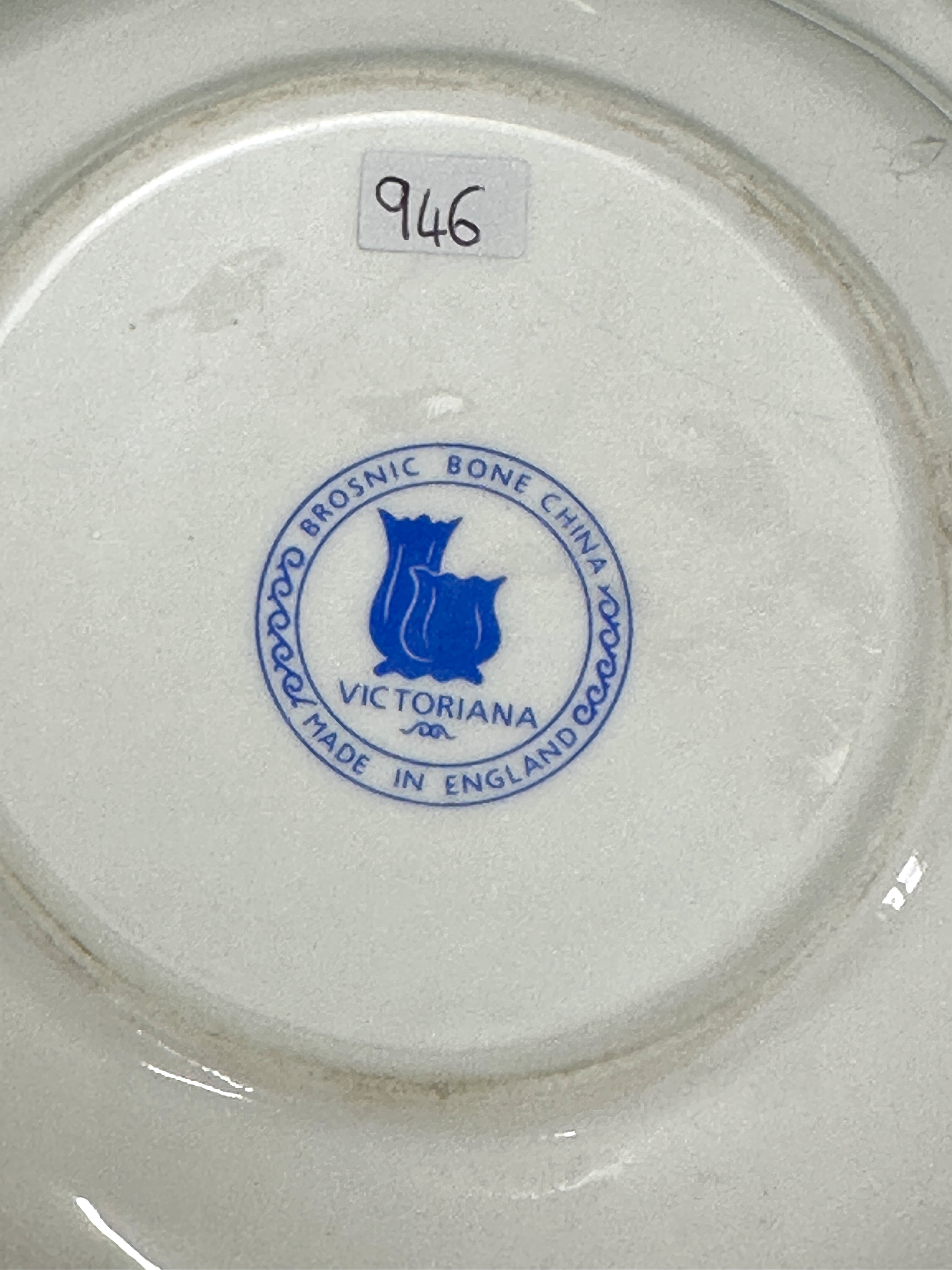 A trio of bone china tableware by Brosnic in the Victoriana pattern, comprising a cream jug with a moulded handle, an open sugar bowl, and a shallow bowl or saucer. Each piece features a lobed body and scalloped edges, decorated with transfer-printed floral designs in pastel shades of pink, blue, and yellow with green foliage against a white ground. The undersides bear a blue circular maker’s mark stating BROSNIC BONE CHINA VICTORIANA MADE IN ENGLAND. One piece carries a small adhesive label numbered 946.