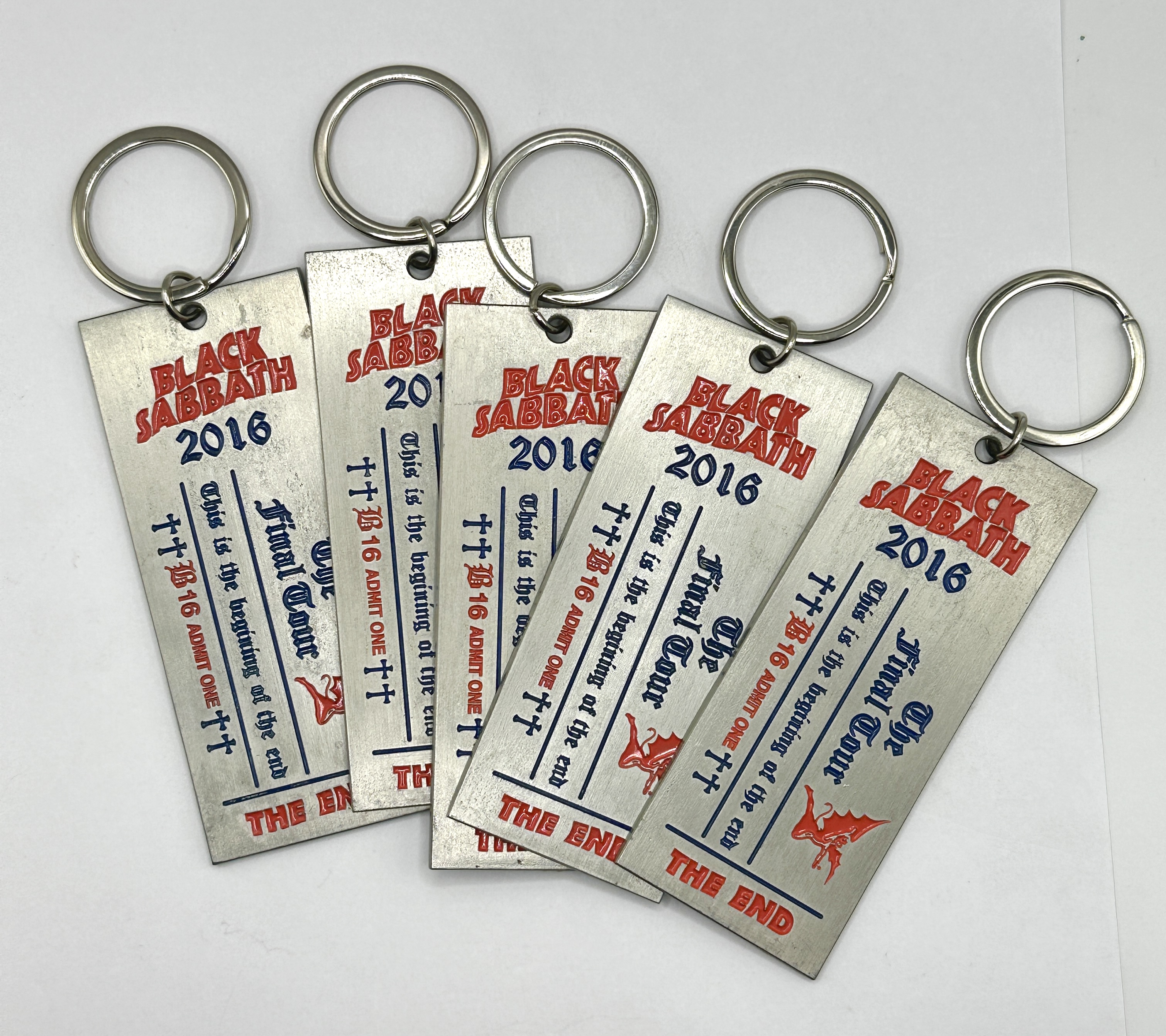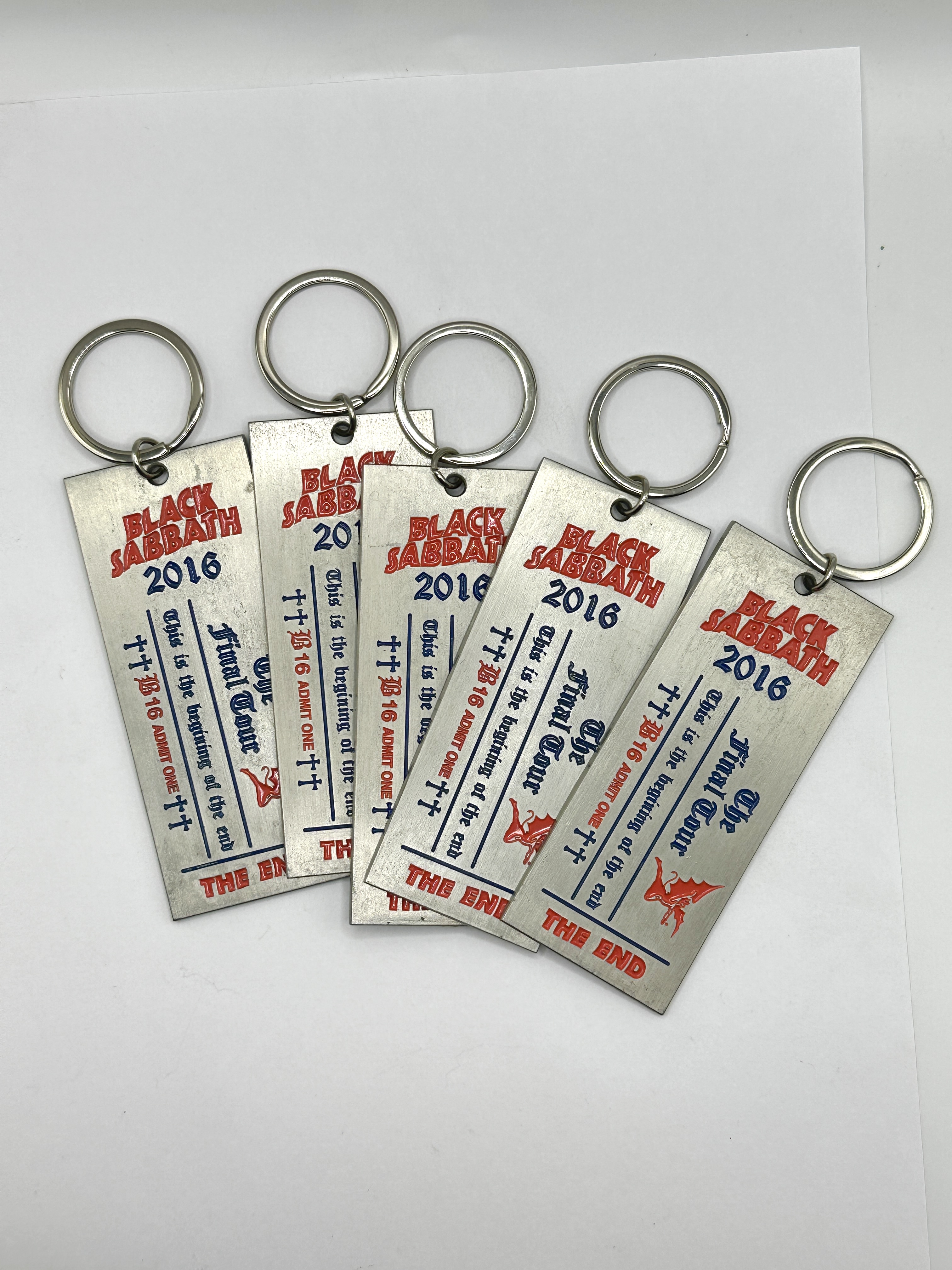 A collection of commemorative ticket-style keychains produced for Black Sabbath’s 2016 final tour, titled The End. Each rectangular tag is manufactured from brushed metal and features debossed lettering and graphics. The recessed areas are finished with red and blue pigment. The face of each tag includes the inscriptions BLACK SABBATH 2016, The Final Tour, This is the beginning of the end, and THE END. The design also incorporates the text † † B 16 ADMIT ONE † † and the band’s winged mascot. Each tag is fitted with a circular split-ring attachment.