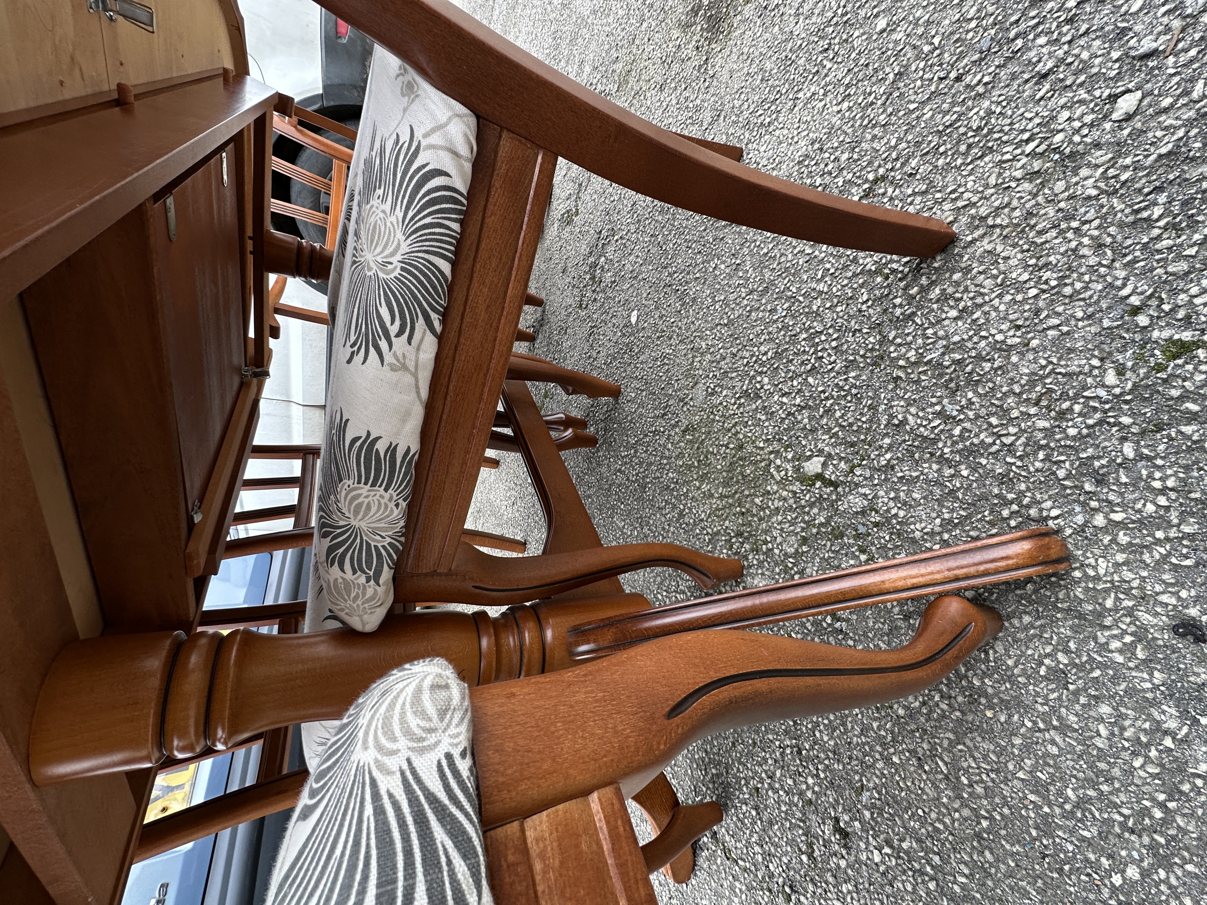 A dining suite featuring a pedestal table and matching chairs in a contemporary traditional style. The table top is finished in a polished reddish-brown wood tone with a scalloped edge, supported by a central turned pedestal resting on four cabriole legs. The chairs feature balloon-style backs with triple vertical slats and are upholstered in a cream fabric with a large grey floral pattern, standing on curved legs. The suite is constructed from wood with a high-gloss finish.