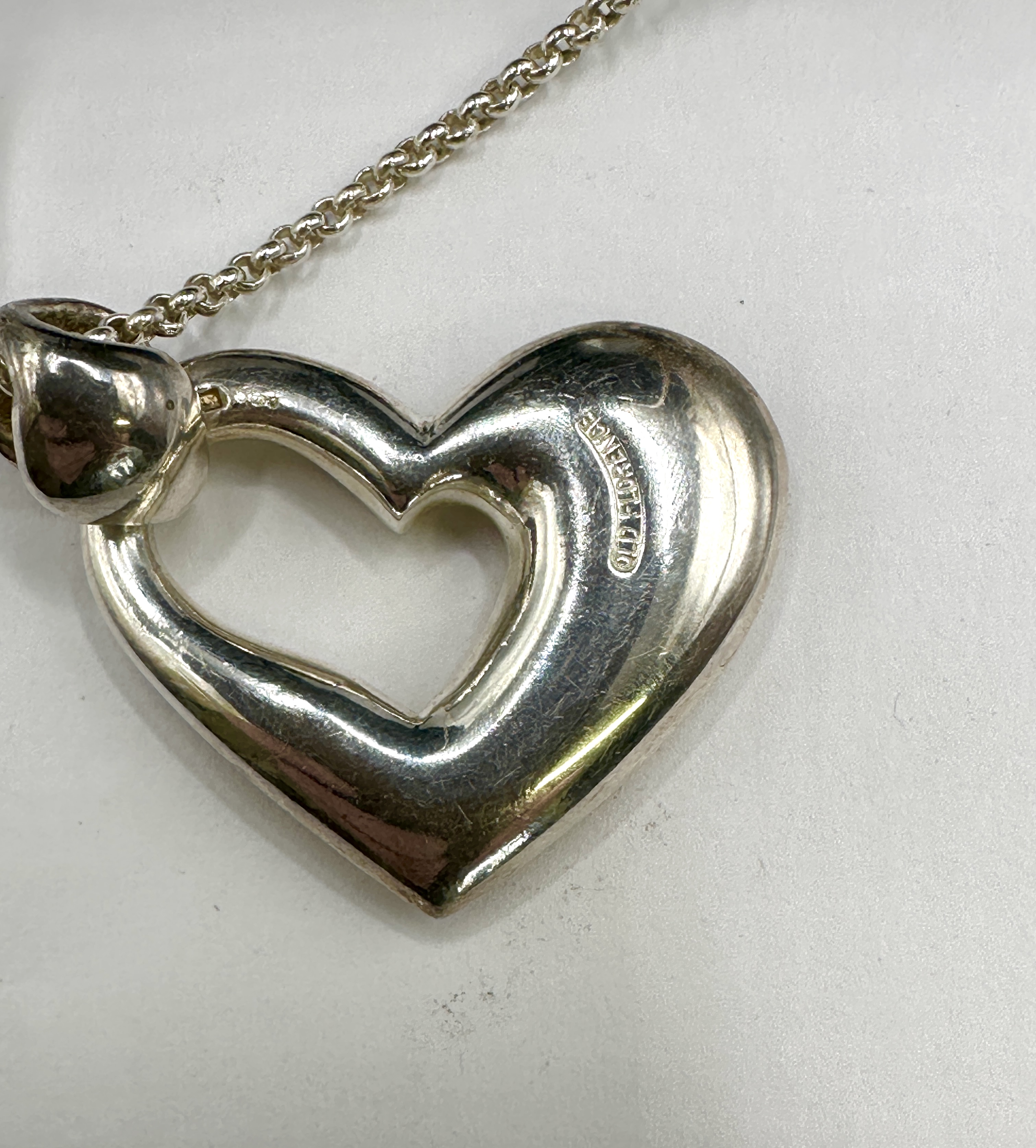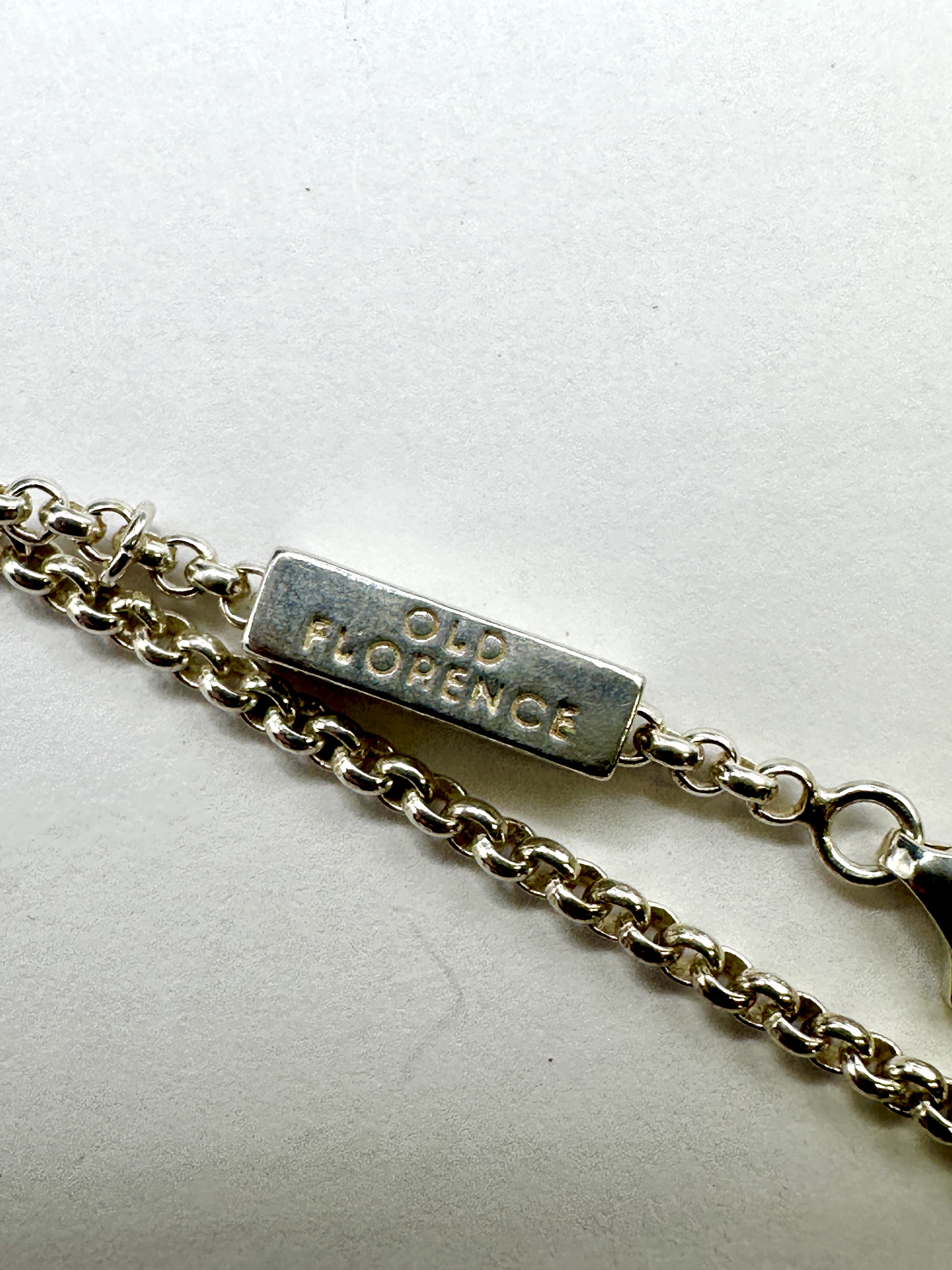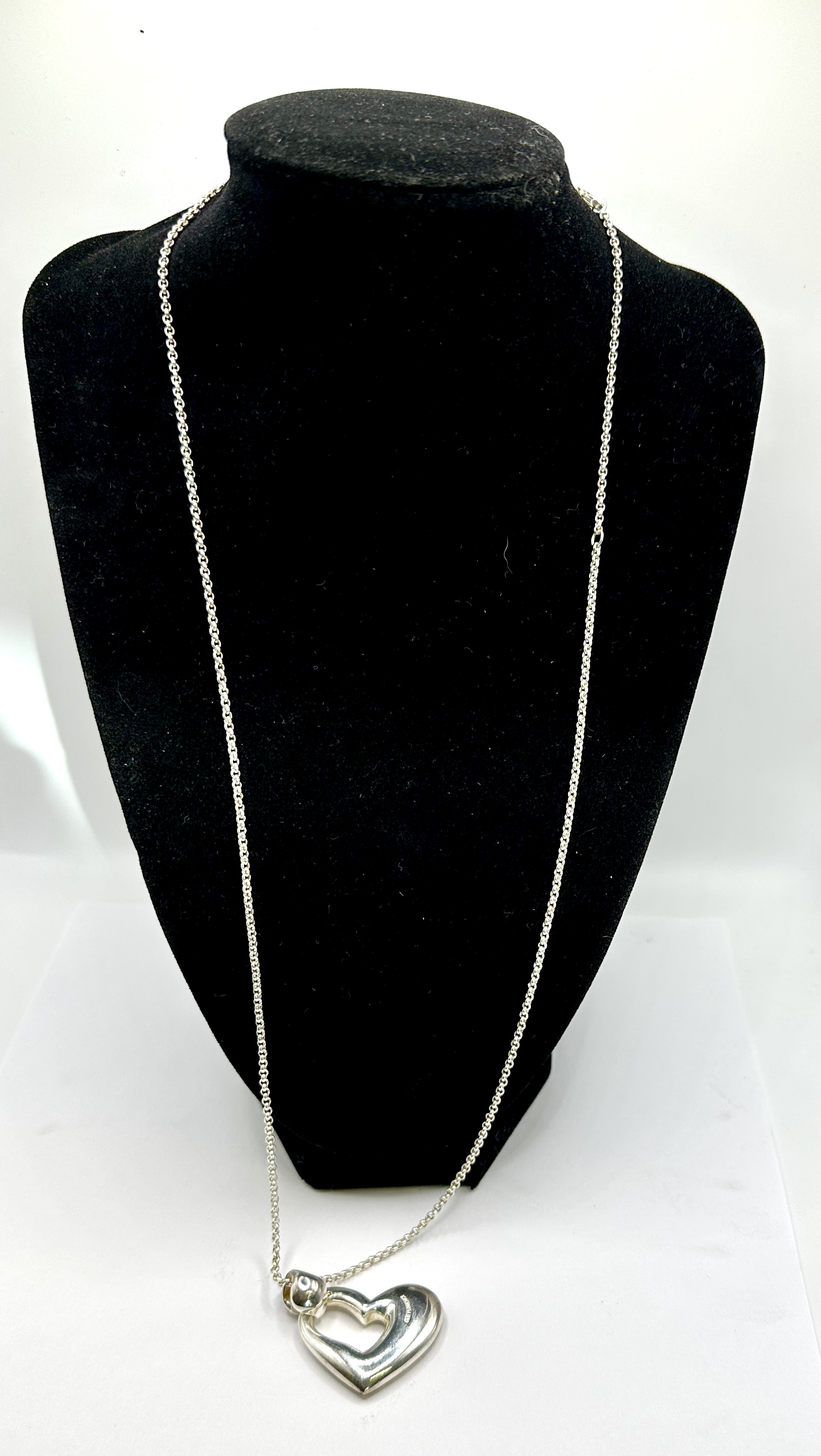 An Old Florence 925 silver necklace featuring a sculptural open heart-shaped pendant. The pendant is suspended from a long rolo-style link chain. The piece is constructed from 925 silver. The reverse of the puffed heart pendant and a rectangular metal tag attached to the chain are both stamped with the mark OLD FLORENCE. The design is contemporary and minimalist in style.