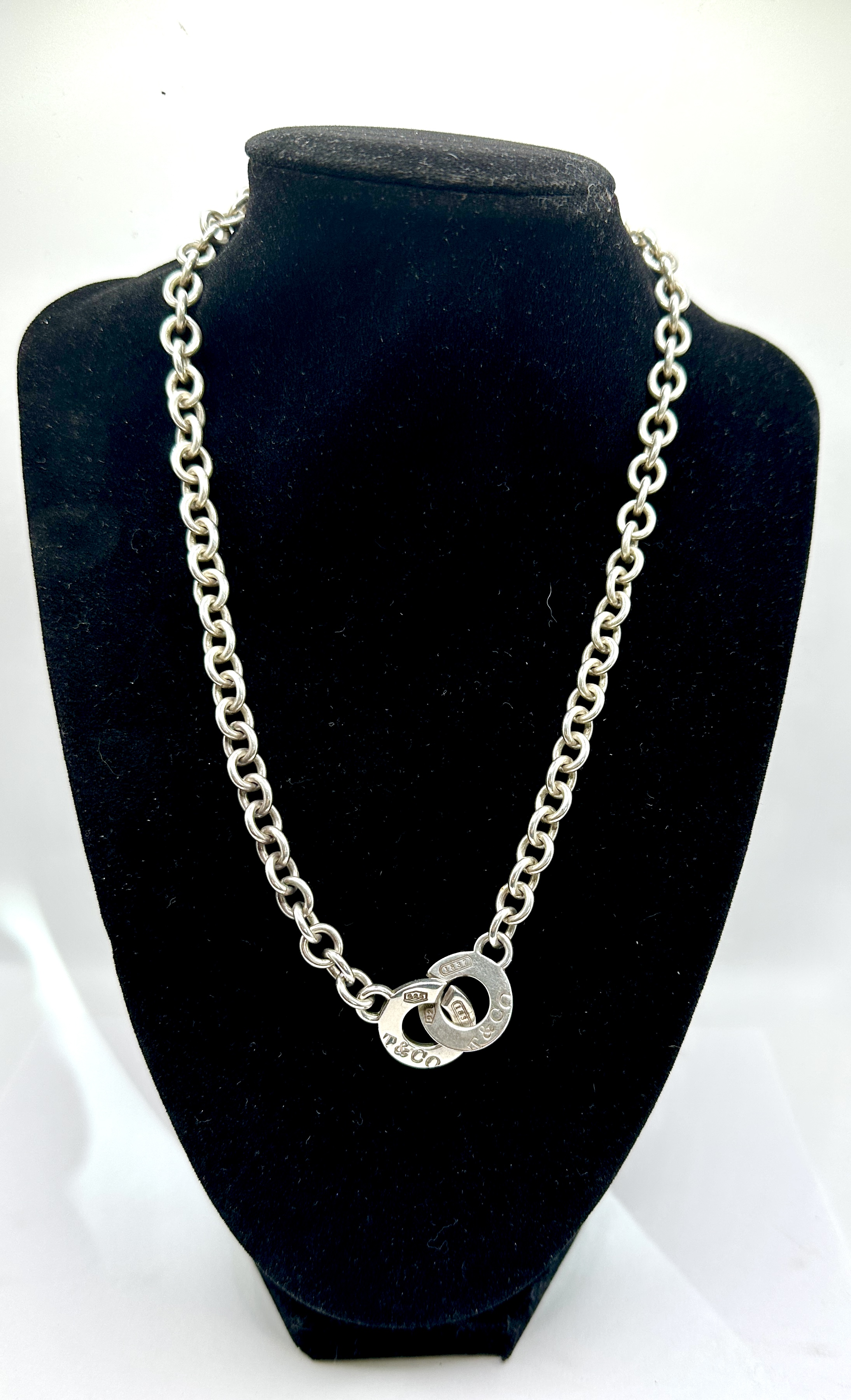 A Tiffany and Co. 1837 collection necklace manufactured from 925 silver. The piece features two interlocking circular pendants which serve as the clasp mechanism, joined to a round-link cable chain. The circular elements are engraved with the inscriptions T and CO, 1837, and 925. The necklace is constructed from solid 925 silver throughout.