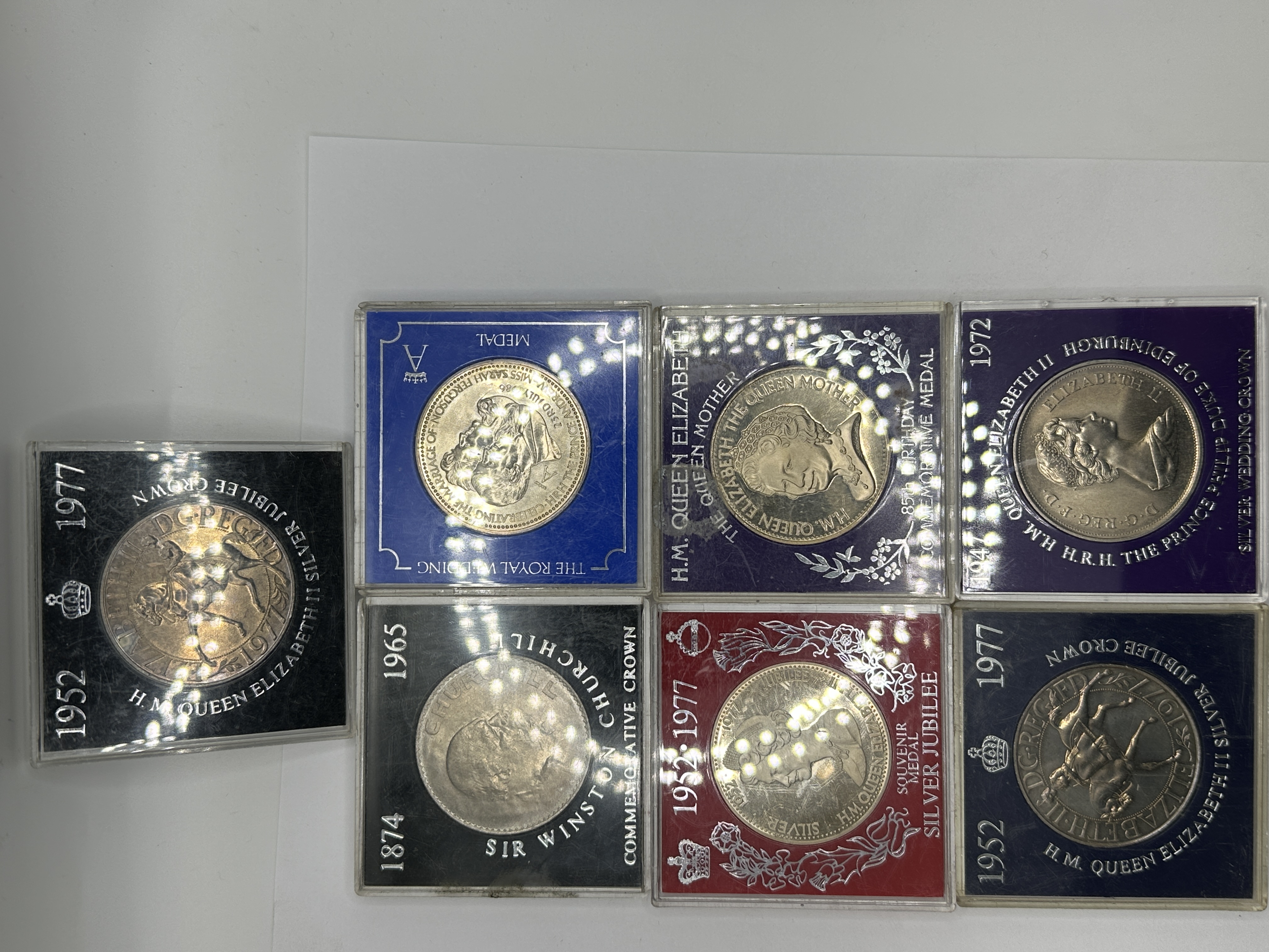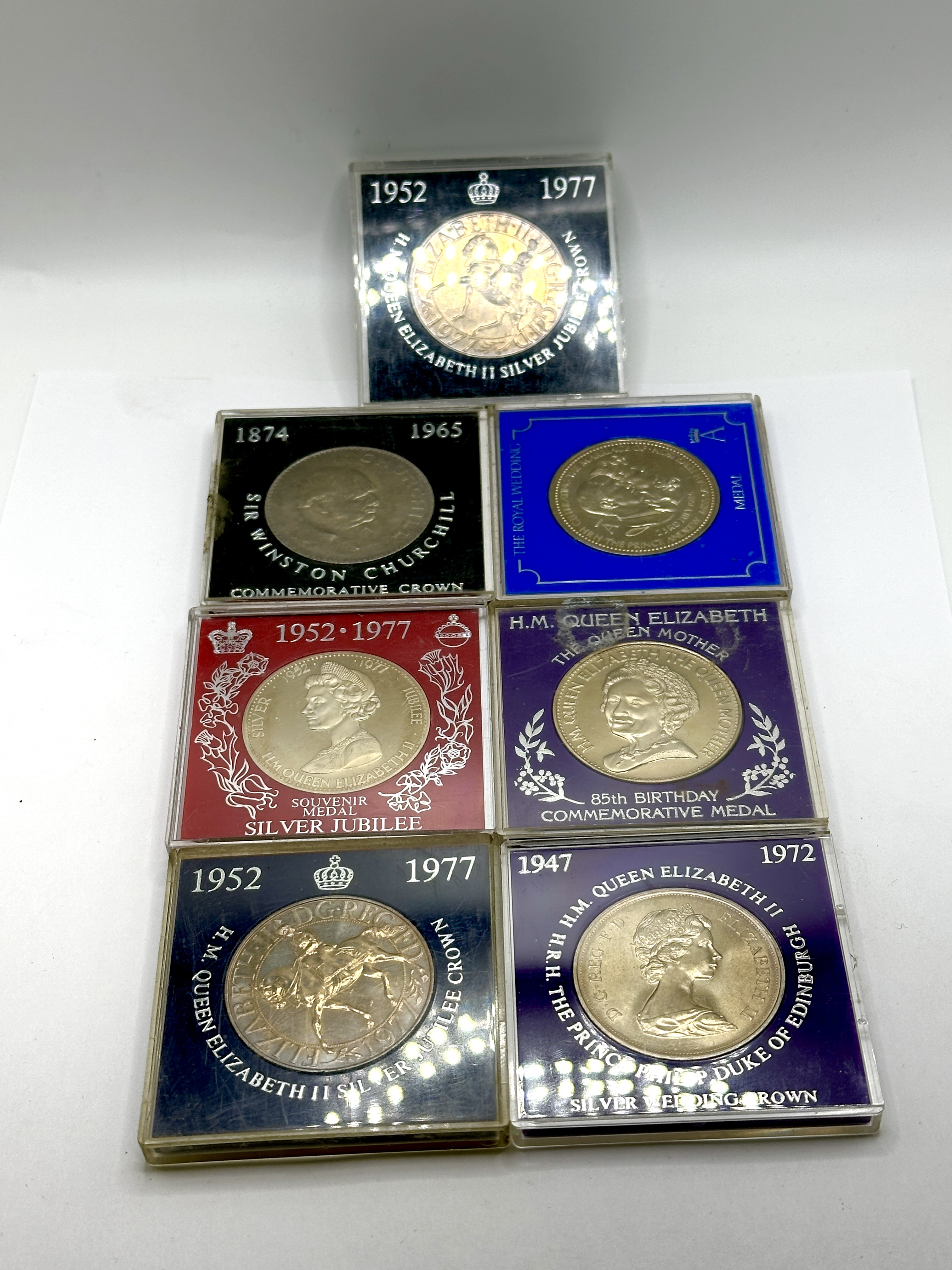 A group of British commemorative coins and medals primarily dating from the mid-to-late 20th century. The collection includes several 1977 Silver Jubilee crowns featuring the equestrian portrait of Queen Elizabeth II, a 1965 Sir Winston Churchill commemorative crown, and a 1972 Silver Wedding crown for Queen Elizabeth II and Prince Philip. Also present are commemorative medals including a 1986 Royal Wedding medal for the marriage of Prince Andrew and Sarah Ferguson, an 85th birthday commemorative medal for Queen Elizabeth The Queen Mother, and a 1977 Silver Jubilee souvenir medal. Each piece is housed in a square, clear plastic protective case with decorative coloured card inserts in blue, red, purple, and black. The metallic items feature various high-relief portraits and commemorative inscriptions.