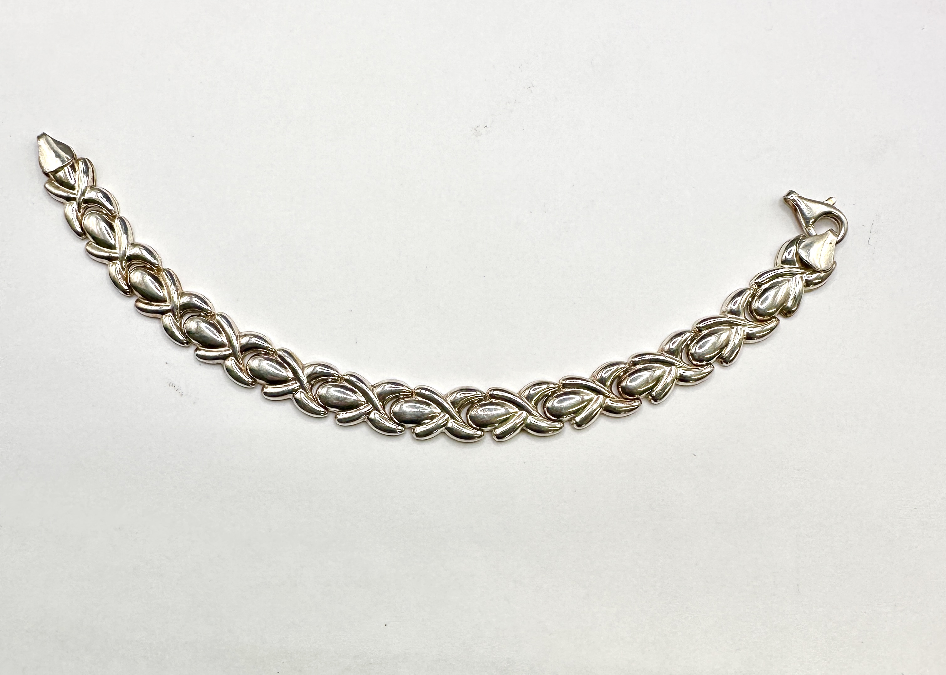 An Italian sterling silver bracelet featuring the Stampoto Flora design. The piece is constructed from 925 silver and comprises a series of interlocking teardrop-shaped links nestled within X-form frames. The bracelet is secured with a lobster claw clasp and displays a polished, lustrous finish throughout.