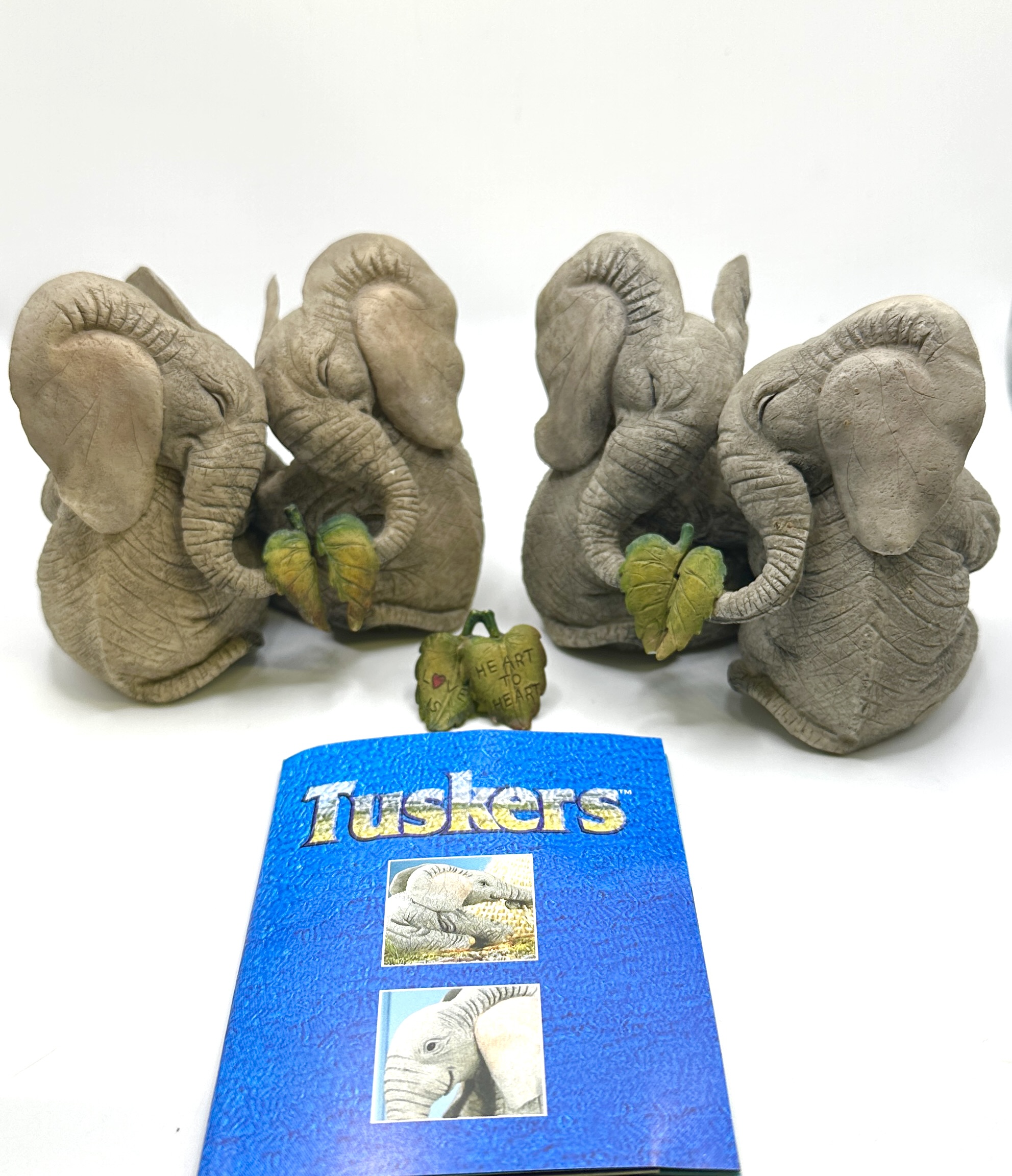 A collection of Tuskers brand figurines from The Adventures of Henry the Elephant series. The group features two pairs of grey elephants, each pair depicted in a trunk-to-trunk pose while sharing green leaves. The figurines are constructed from a cast resin composite material with a realistically textured surface. The lot includes a small leaf-shaped accessory bearing the incised inscription HEART TO HEART and a blue Tuskers informational booklet.