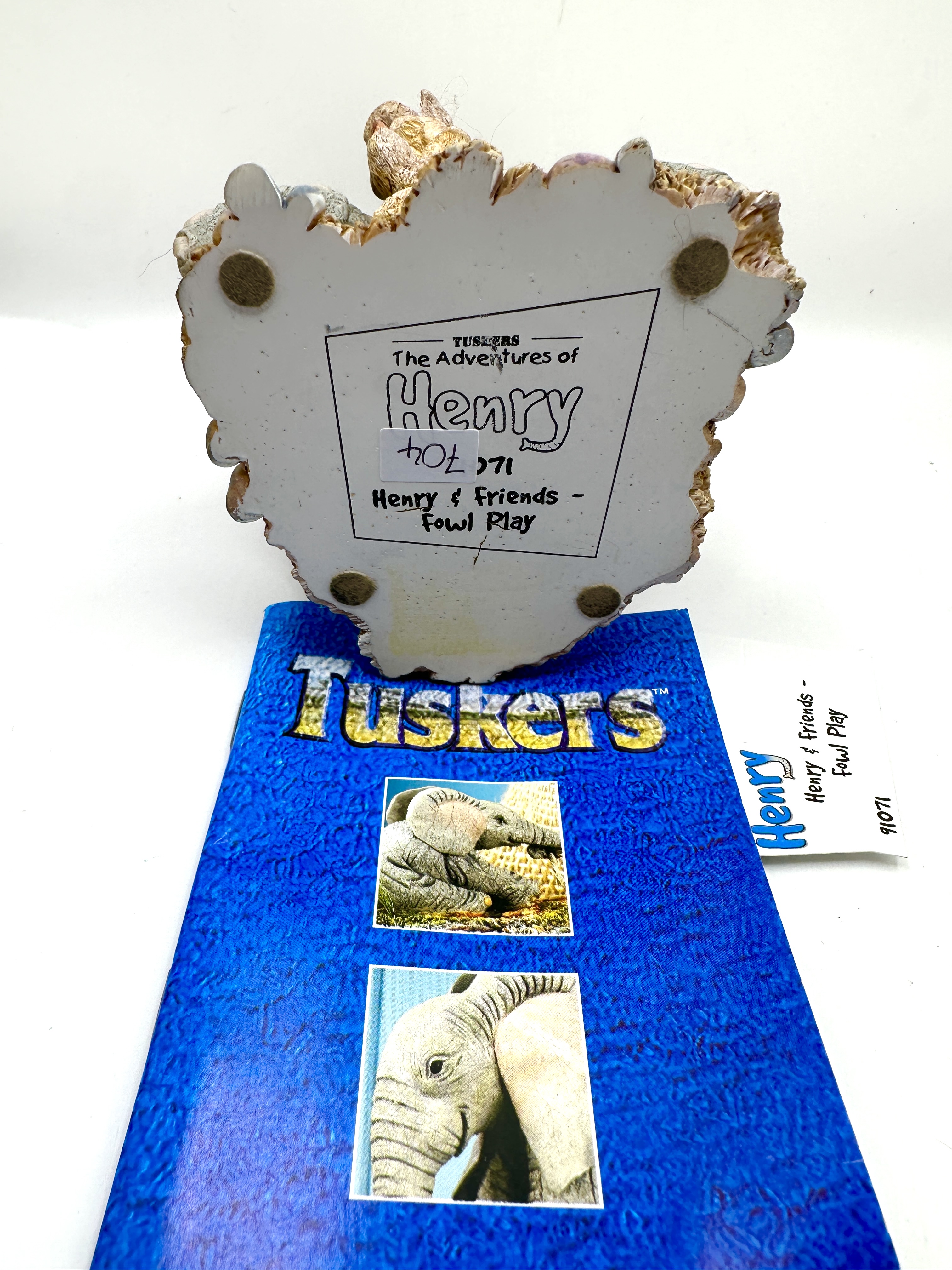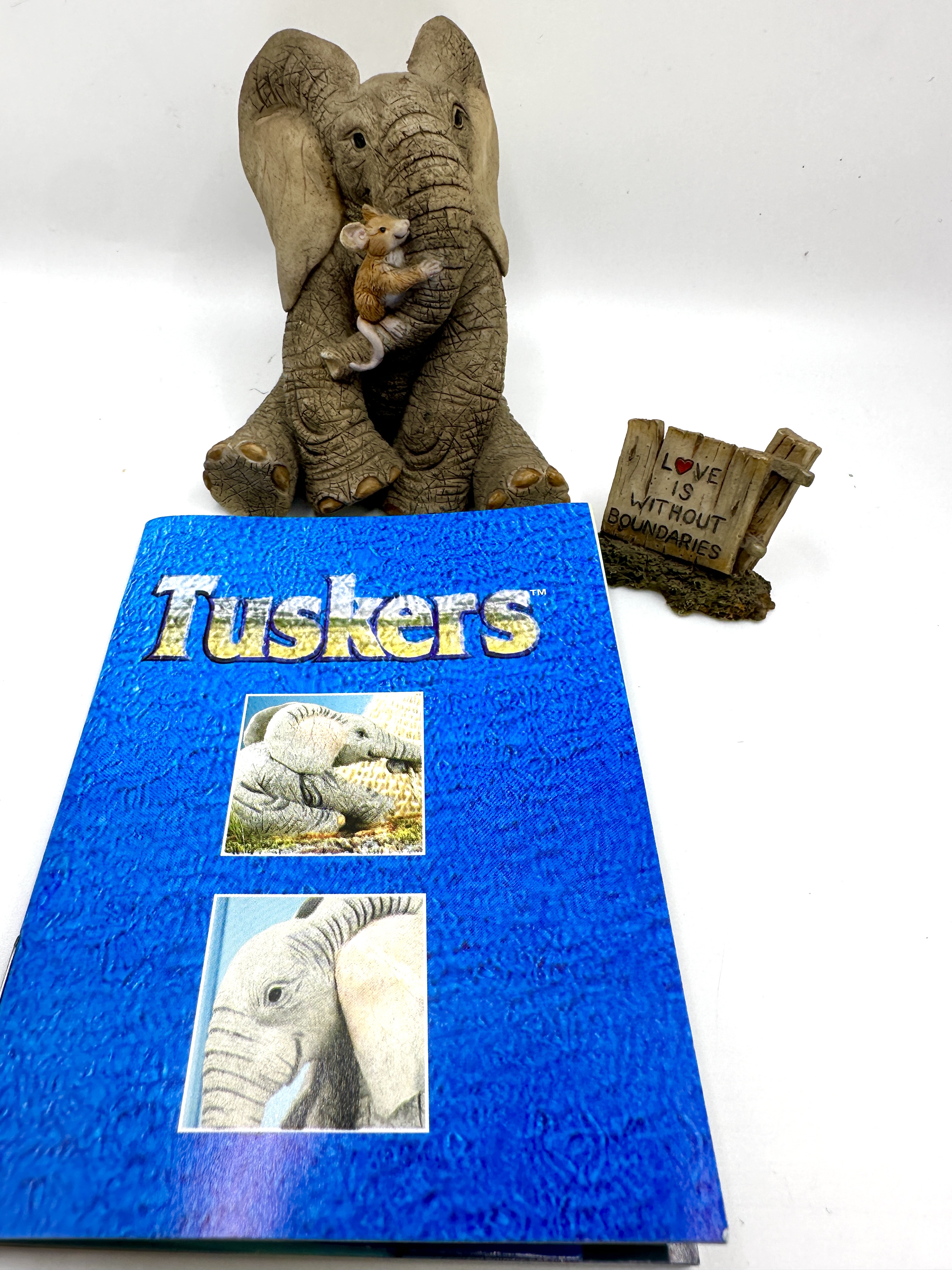 A collection of contemporary cast resin collectibles from the Tuskers The Adventures of Henry series. The group features figurines of a seated elephant with a textured matte finish. One figurine is titled Henry and Friends – Fowl Play, item number 91071, and depicts several small birds climbing the elephant’s trunk. Another figurine shows the elephant character with a small mouse. The lot includes a Tuskers brand collector’s booklet and a small coordinating resin sign inscribed with the text LOVE IS WITHOUT BOUNDARIES. Official markings including the series title and specific item names are present on the underside of the figurines.