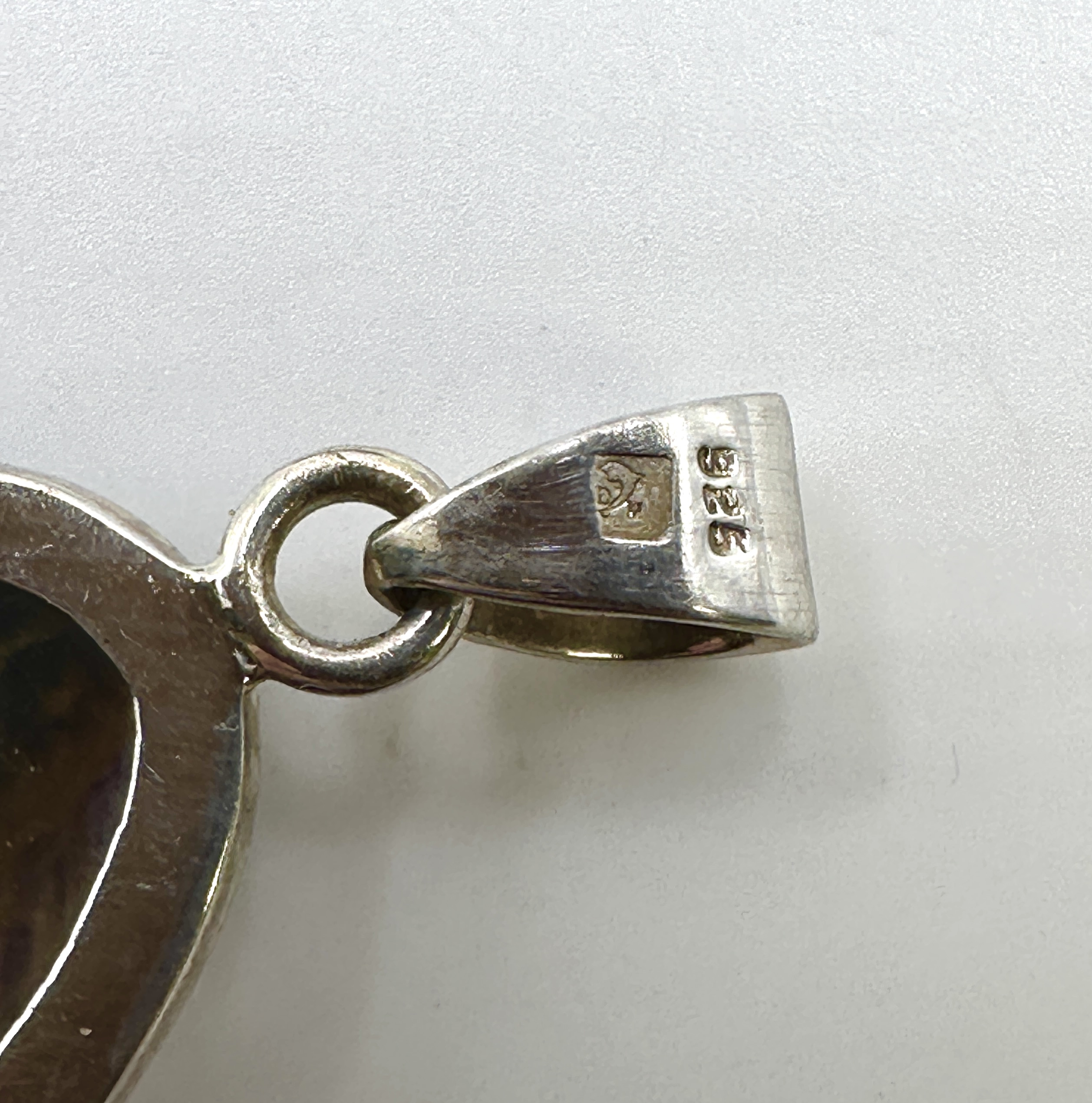 The pendant is in good overall condition with minor surface wear and light tarnishing to the silver consistent with use. The stone appears secure in its setting with no visible chips or fractures.