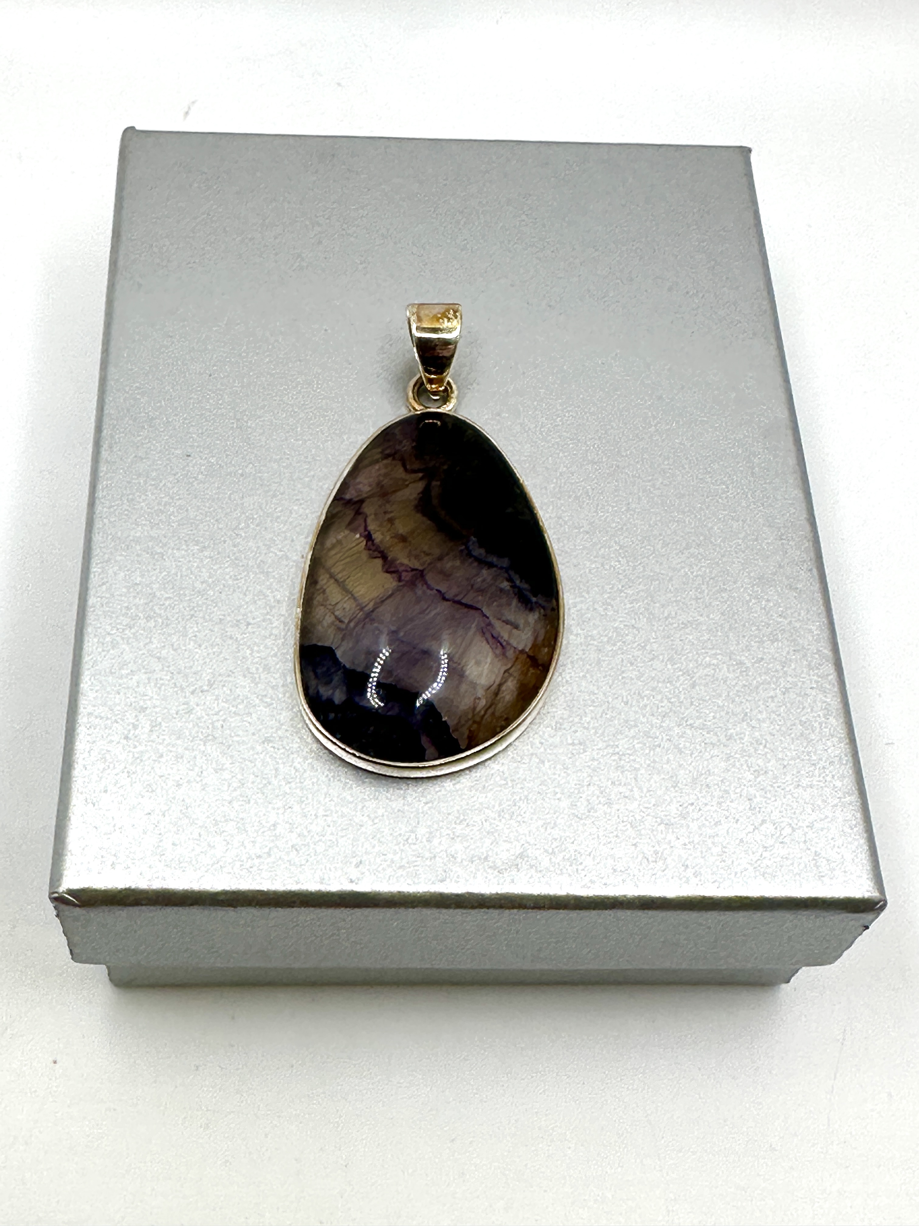 A sterling silver pendant featuring a large, polished teardrop-shaped Blue John fluorite cabochon. The stone displays characteristic natural banding in shades of deep purple, cream, and translucent yellow. The gemstone is secured within a minimalist bezel setting and suspended from a tapered bail. The bail is struck with the hallmark 925 for sterling silver and an additional maker mark within a square cartouche. The pendant is accompanied by a silver-toned cardboard gift box.
