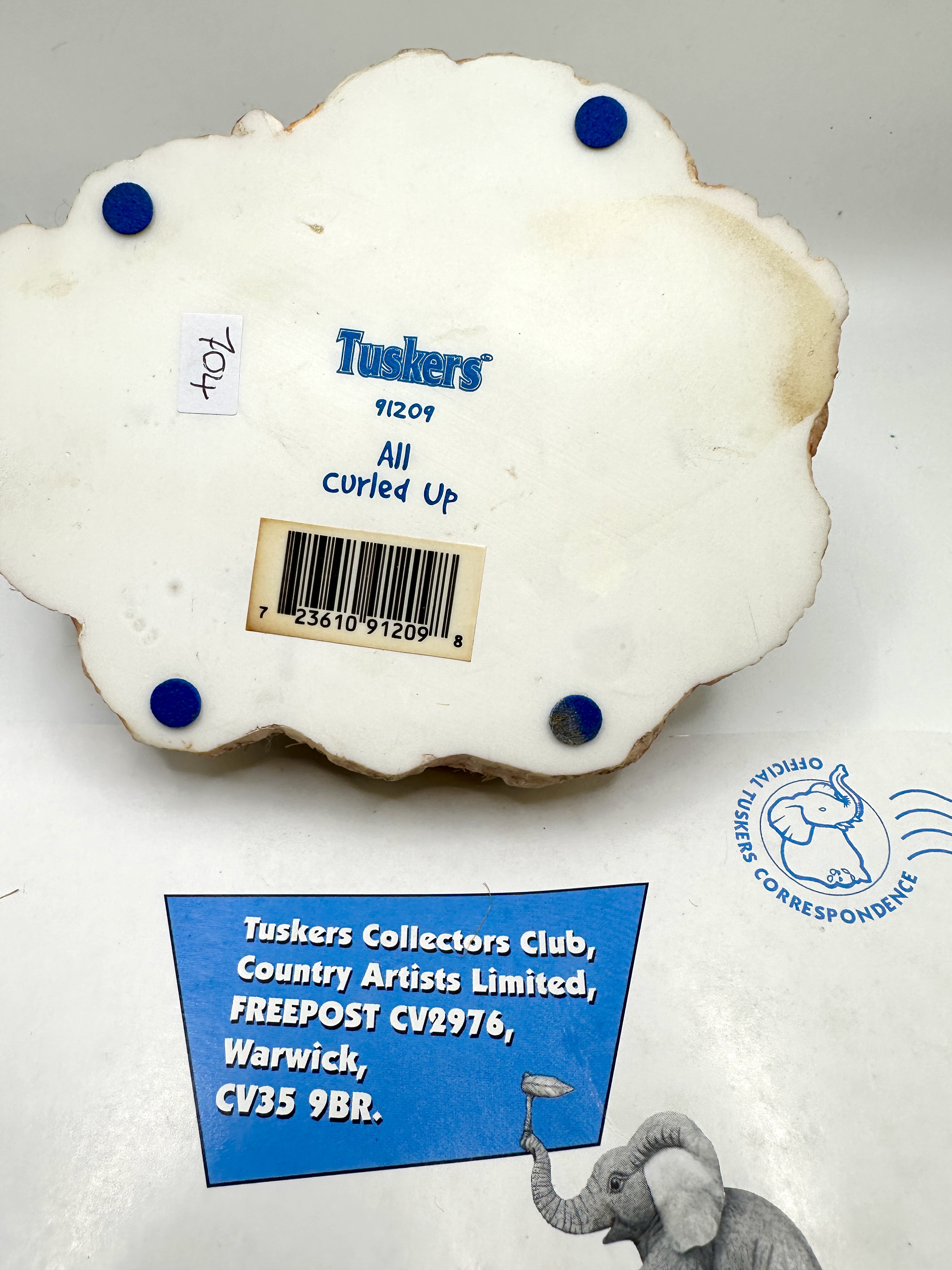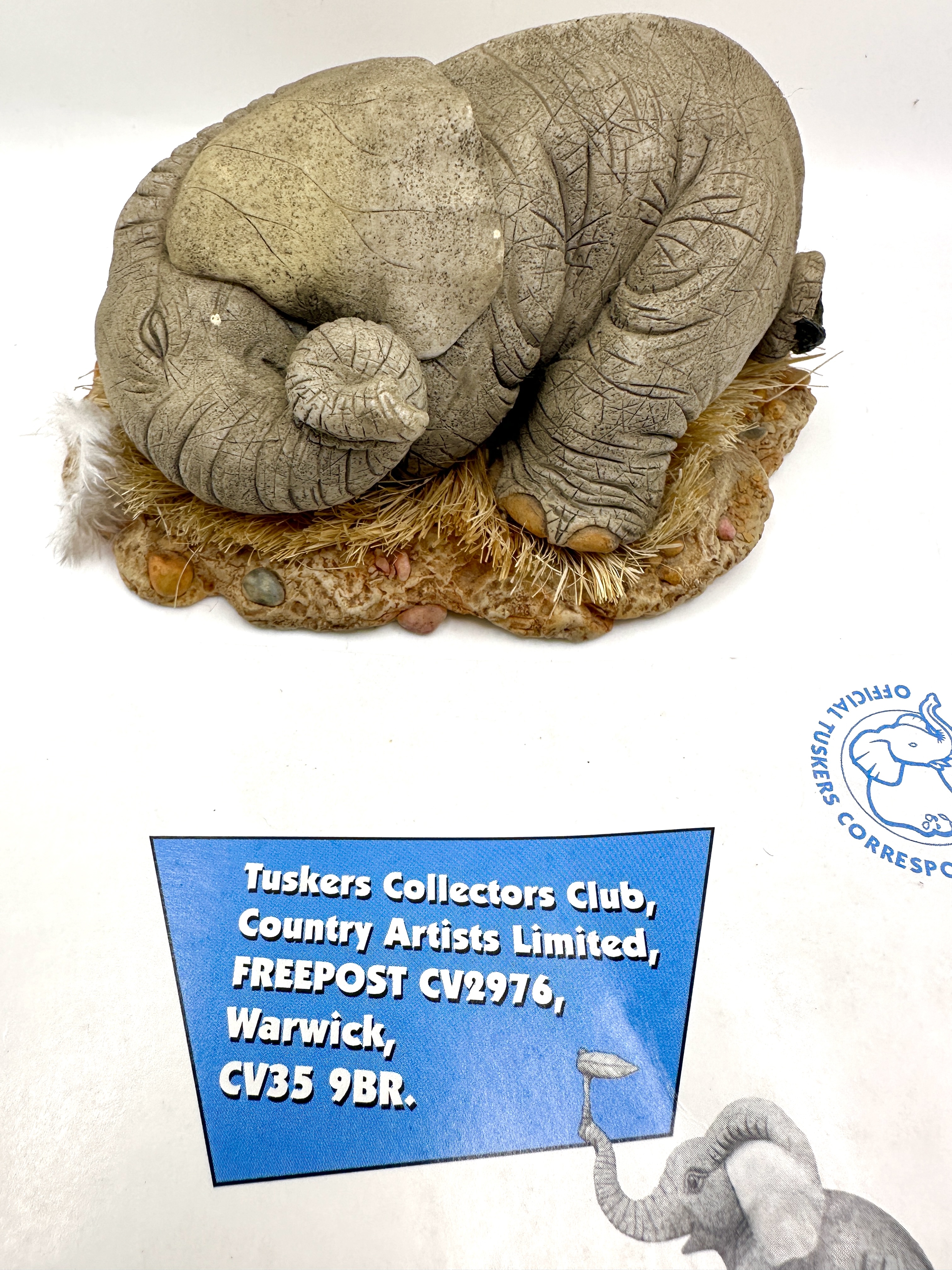 A cast resin collectible figurine titled All Curled Up from the Tuskers range produced by Country Artists Limited. The sculpture depicts a recumbent baby elephant resting upon a textured base designed to simulate earth and straw. The piece features a detailed wrinkled skin texture and a naturalistic hand-painted finish. The underside of the base bears the Tuskers logo, model number 91209, and the title of the work. The base is fitted with four blue protective pads. Included with the lot is an informational card for the Tuskers Collectors Club, referencing the manufacturer location in Warwick, UK.