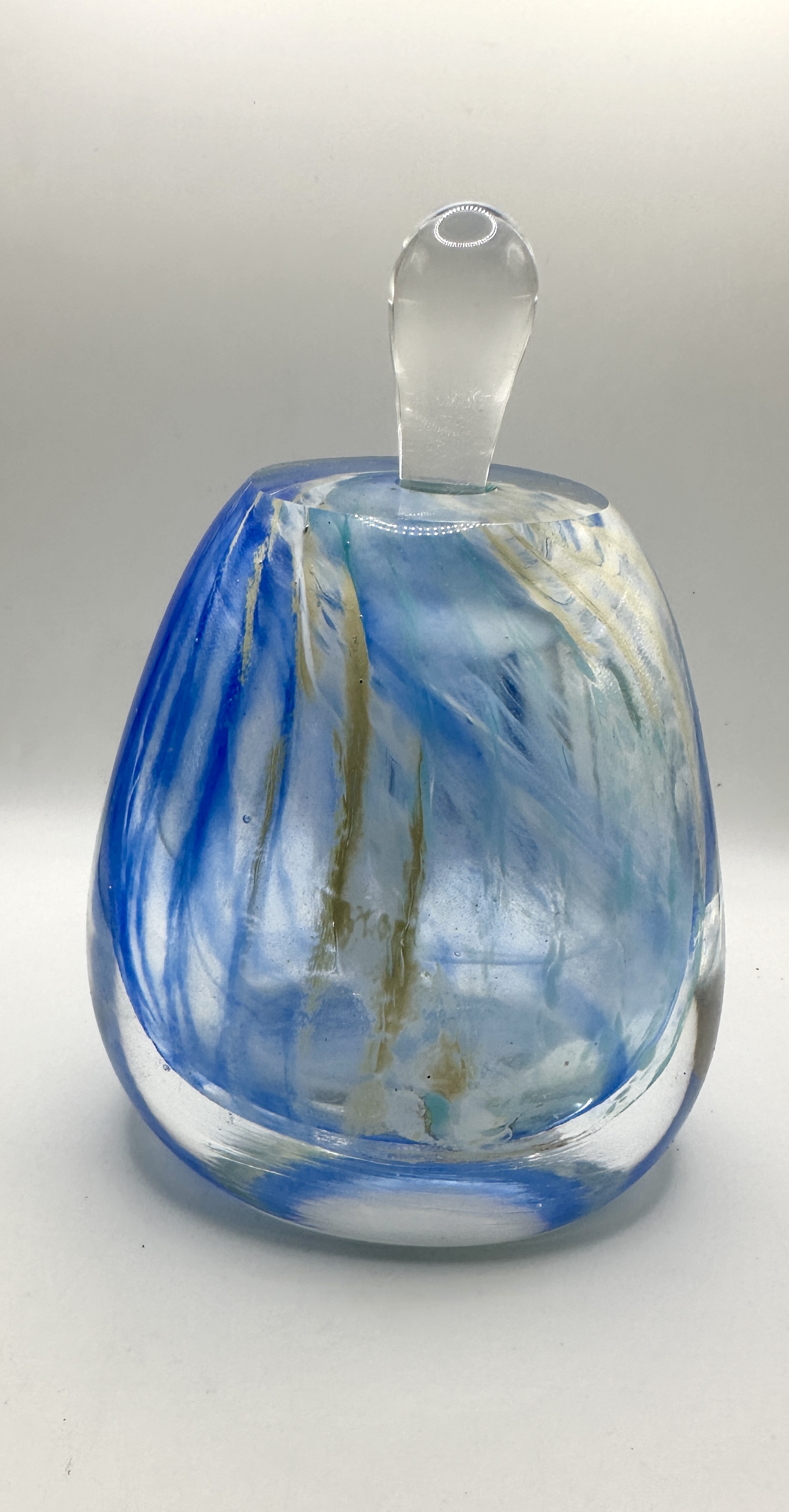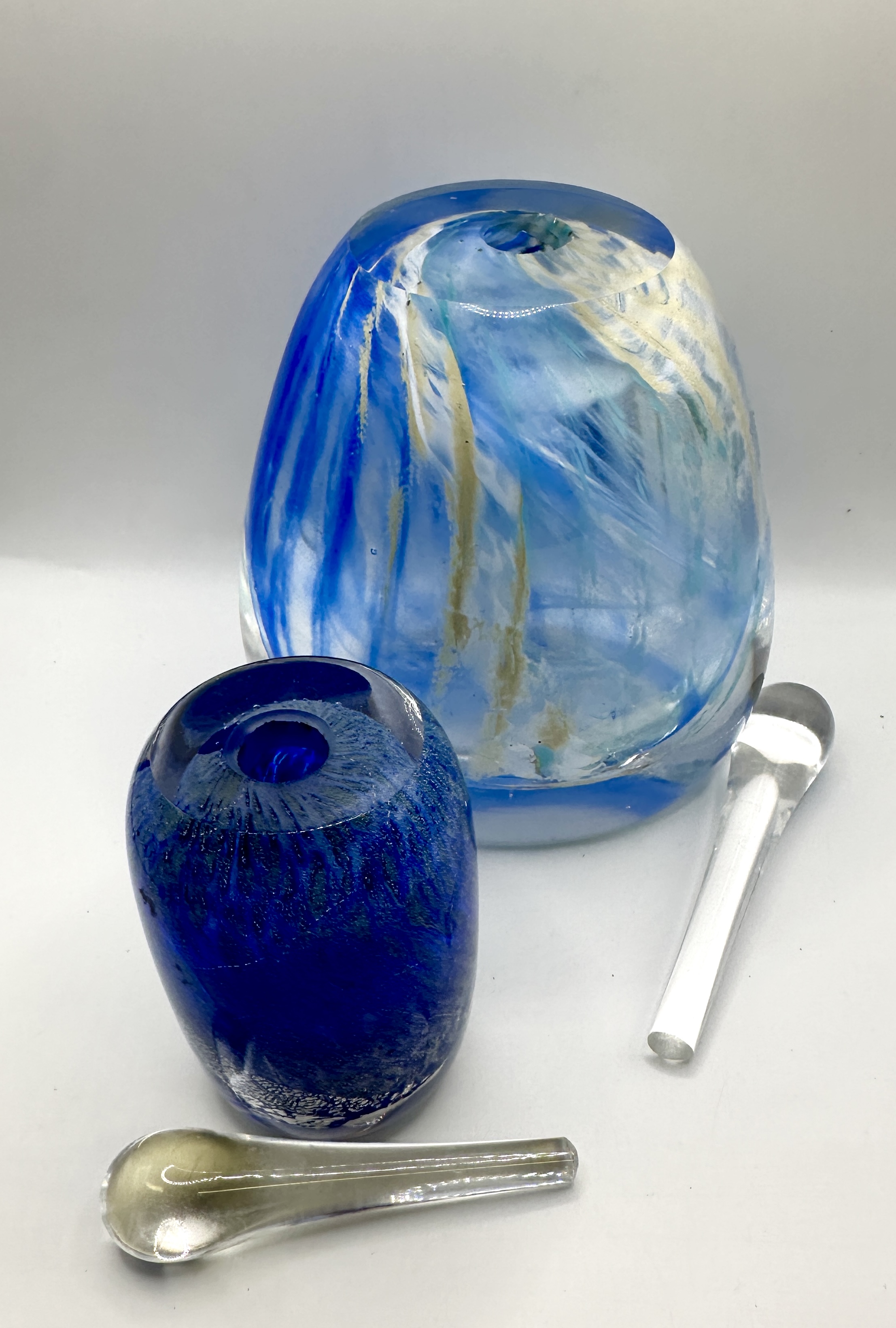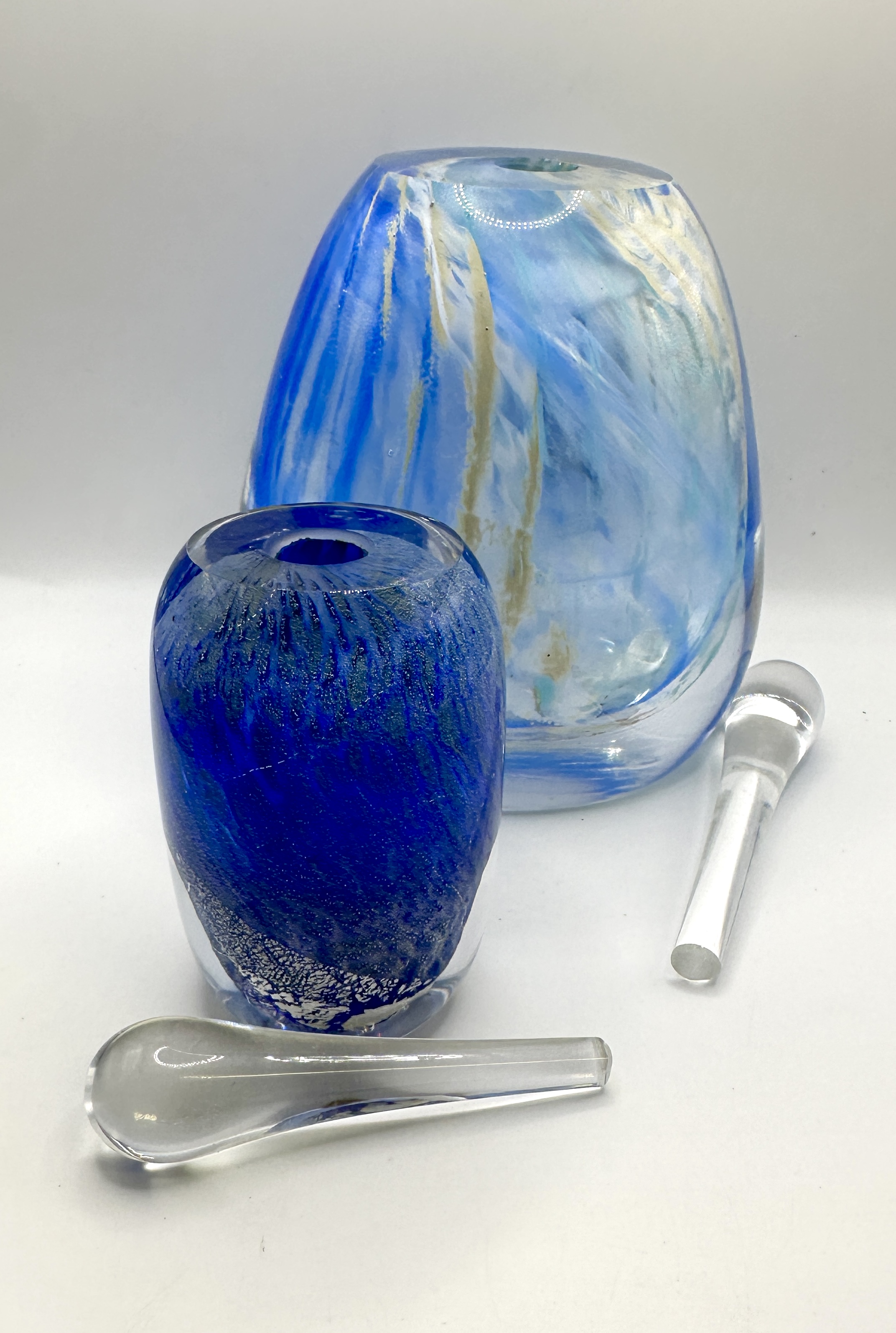 Two hand-blown art glass perfume bottles with clear glass stoppers. The larger vessel features a rounded, tapered body with internalised swirls of blue, white, and tan. The smaller vessel is crafted from deep cobalt blue glass featuring shimmering, textured internal inclusions, possibly silver leaf or foil. Both bottles are constructed from thick clear glass with ground openings to receive the two included teardrop-shaped clear glass stoppers. No signatures or maker marks are present.