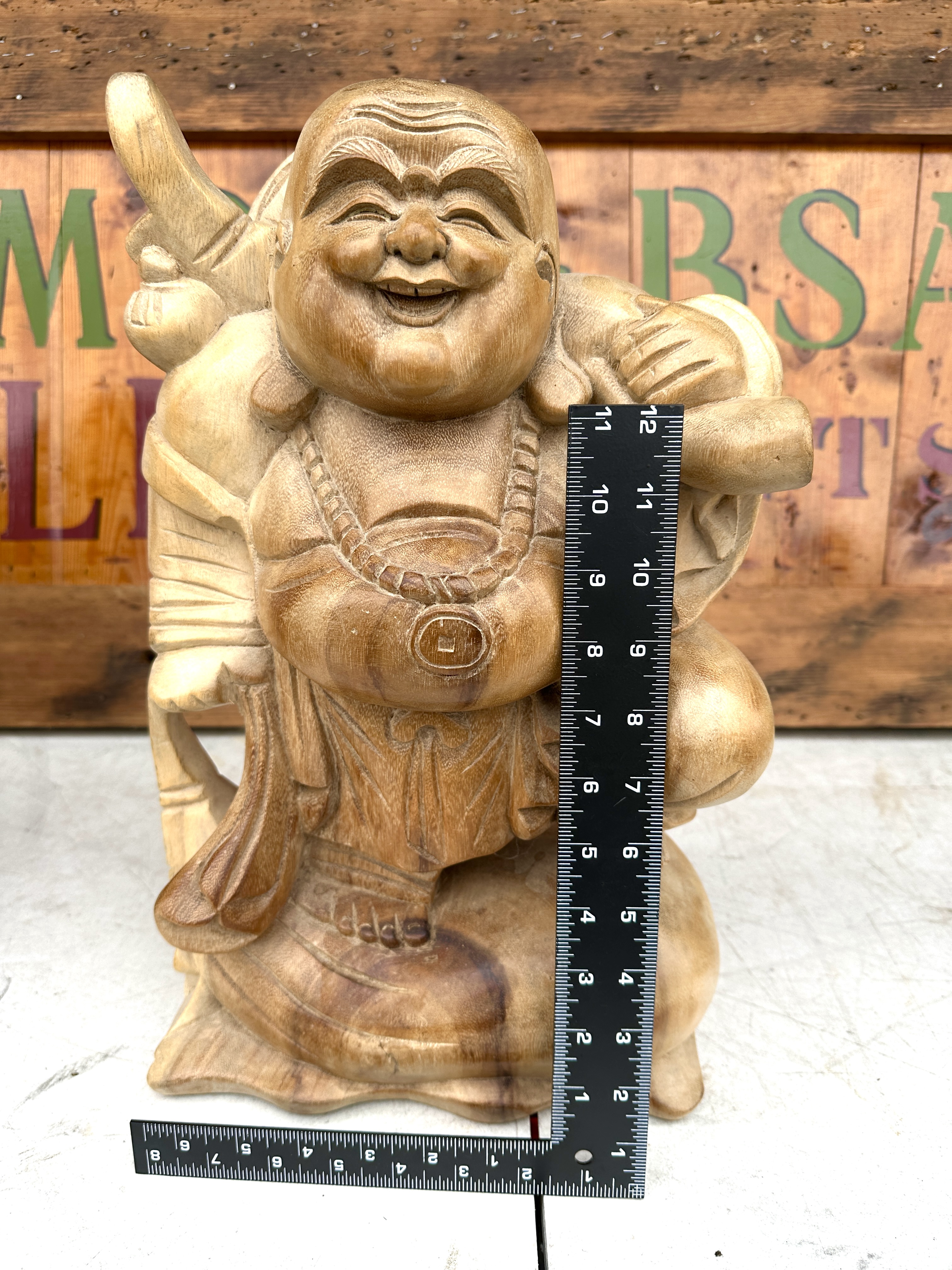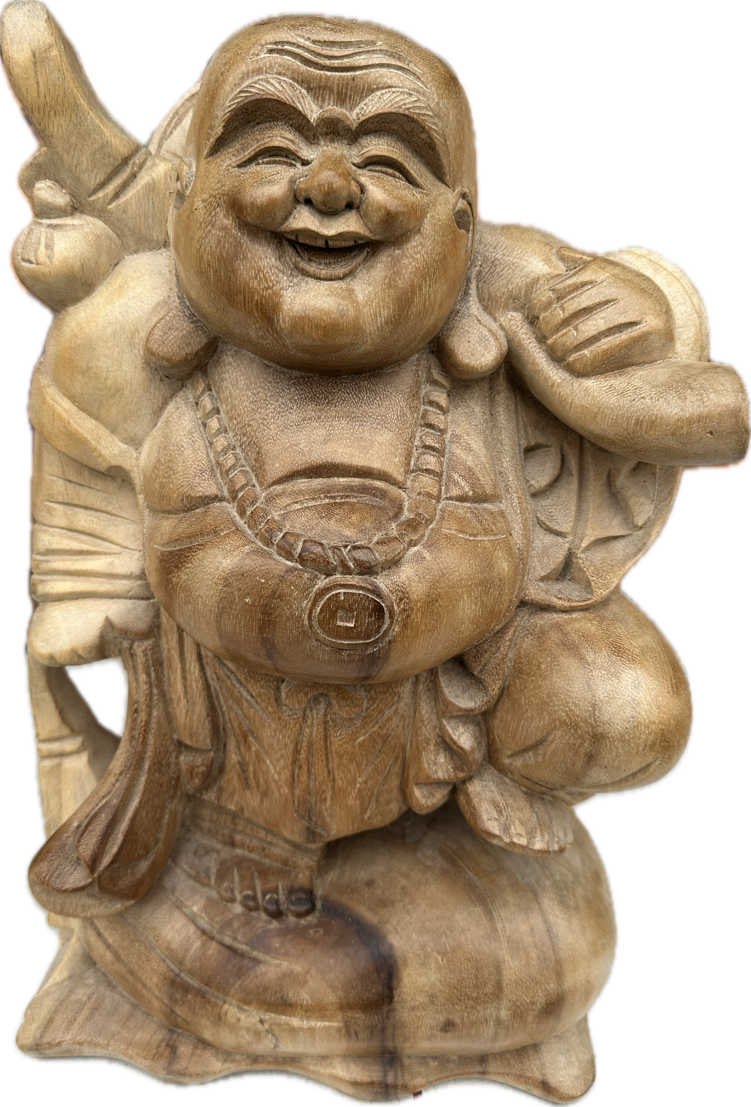 A hand-carved wood statue depicting the Laughing Buddha, also known as Budai or Hotei, in a standing pose. The figure is rendered with traditional iconography, including a wide smile, prominent belly, and pendulous earlobes. He wears a mala bead necklace with a central medallion shaped as a square-holed coin. The deity is shown carrying a large sack and a staff over his shoulders, standing upon a rounded base. The piece is crafted from a light-to-medium brown wood with visible grain and natural surface variations in colour.