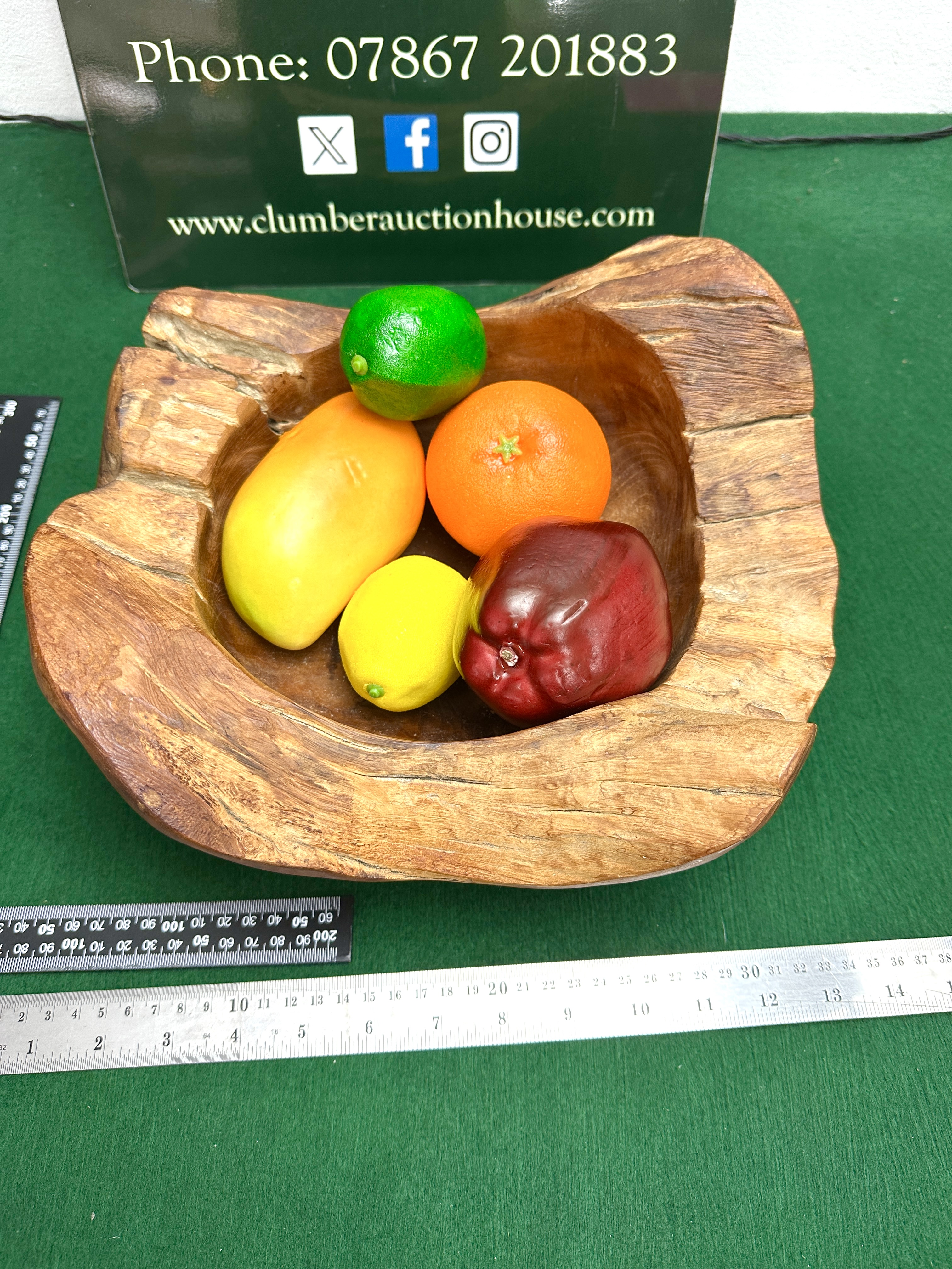 A hand-carved mango wood bowl featuring an organic, rustic form with irregular sculptural edges. The piece is fashioned from a single piece of timber, displaying prominent wood grain, knots, and a textured finish. Fruit Not included.