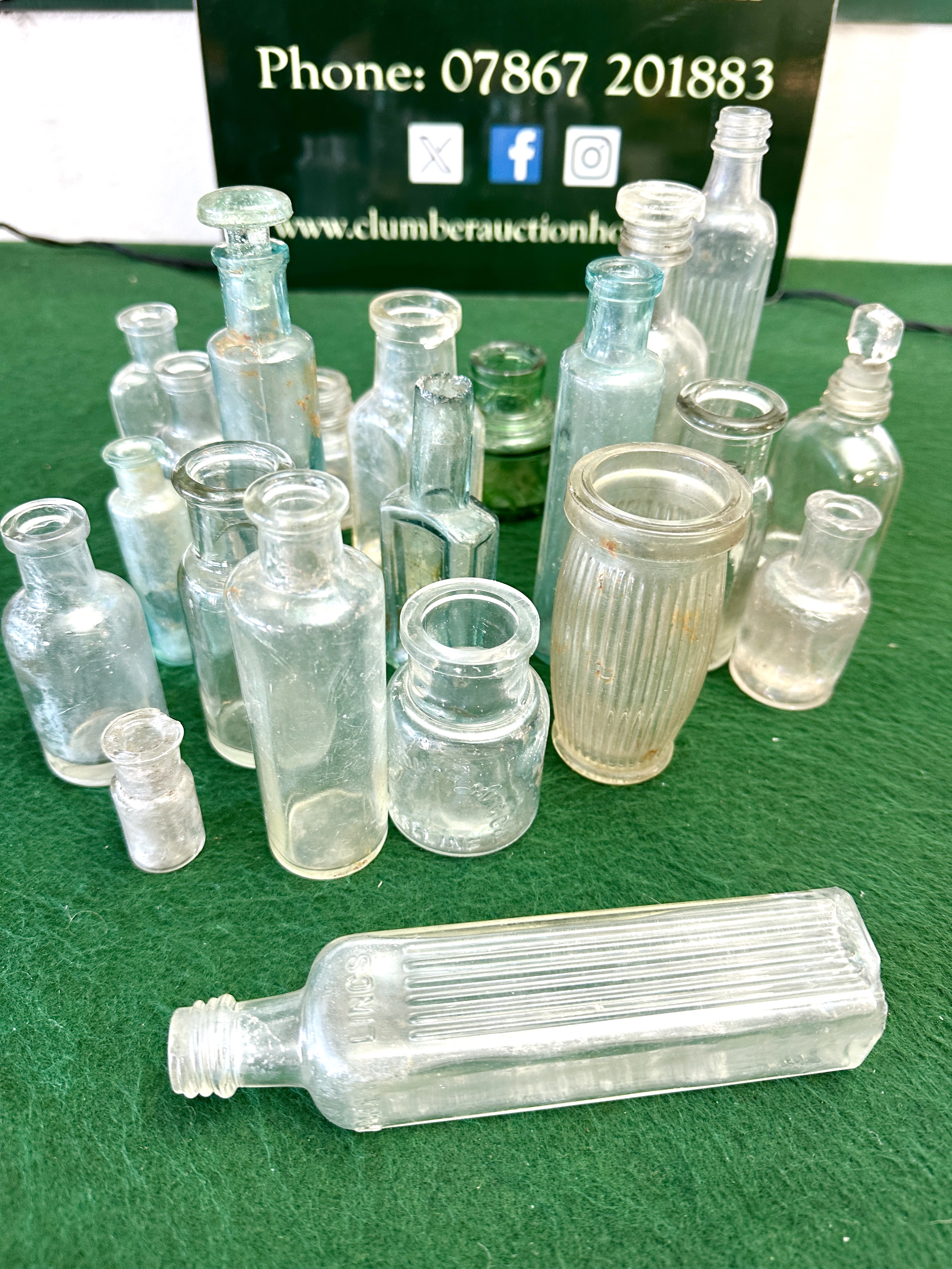 A collection of early 20th-century glass bottles and vessels in various forms and colours. The group includes clear, aqua, and dark green glass examples produced through mould-blown techniques. The assortment features various shapes such as cylindrical, rectangular, and ribbed bodies. Embossed markings include one bottle labelled LINCTUS and a small jar from the Chesebrough Mfg. Co. marked VASELINE. Several vessels retain their original glass stoppers. The collection represents typical household and pharmaceutical glass from the 1900s, similar to known examples from manufacturers such as Sanizal, Whittemore, and Merrells.