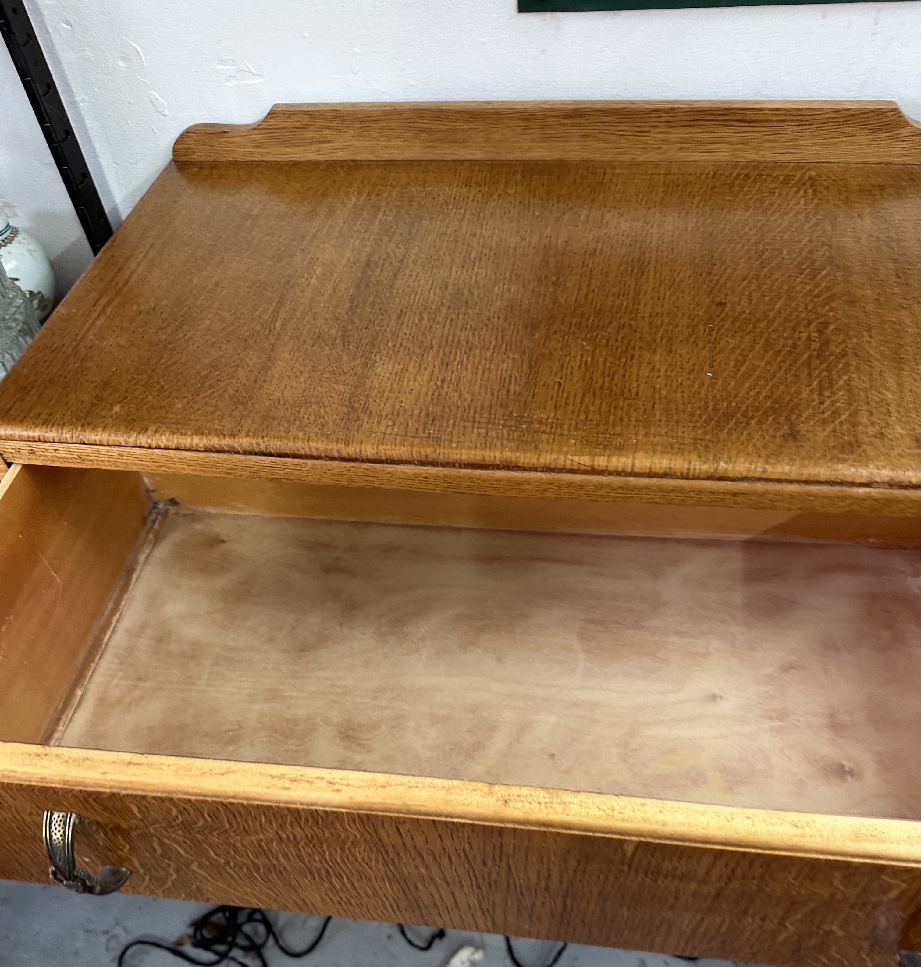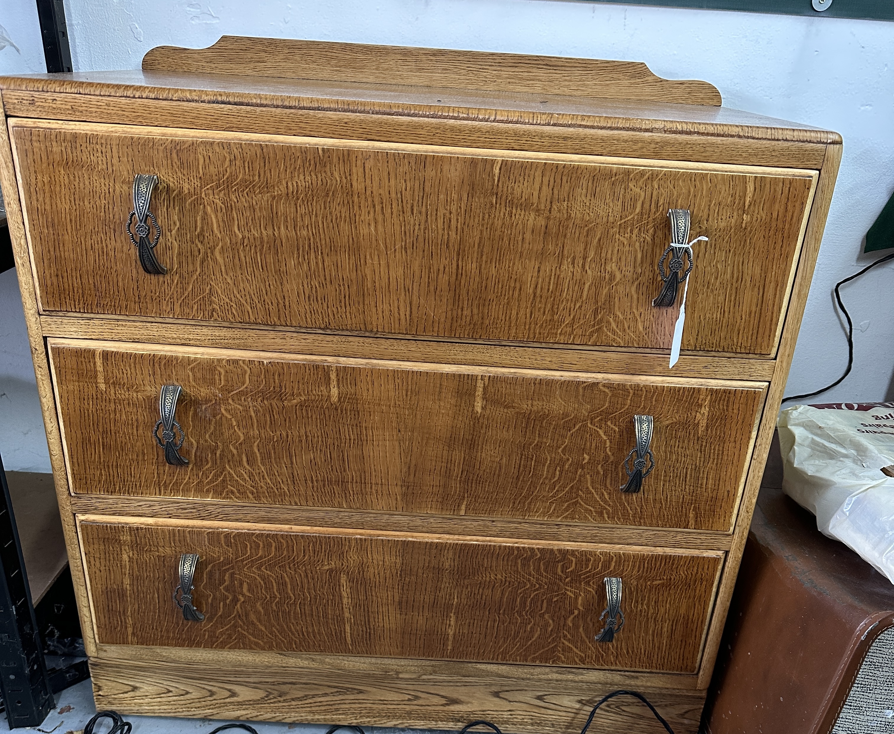 A mid-century wooden chest of drawers featuring three full-width drawers. The piece is finished with a prominent oak grain, characteristic of tiger or quarter-sawn veneer. The chest is surmounted by a low, shaped backsplash. Each drawer is fitted with two ornate, textured metal pulls. The construction features three stacked drawers of equal depth. No maker’s marks or labels are visible on the exterior or interior of the piece.