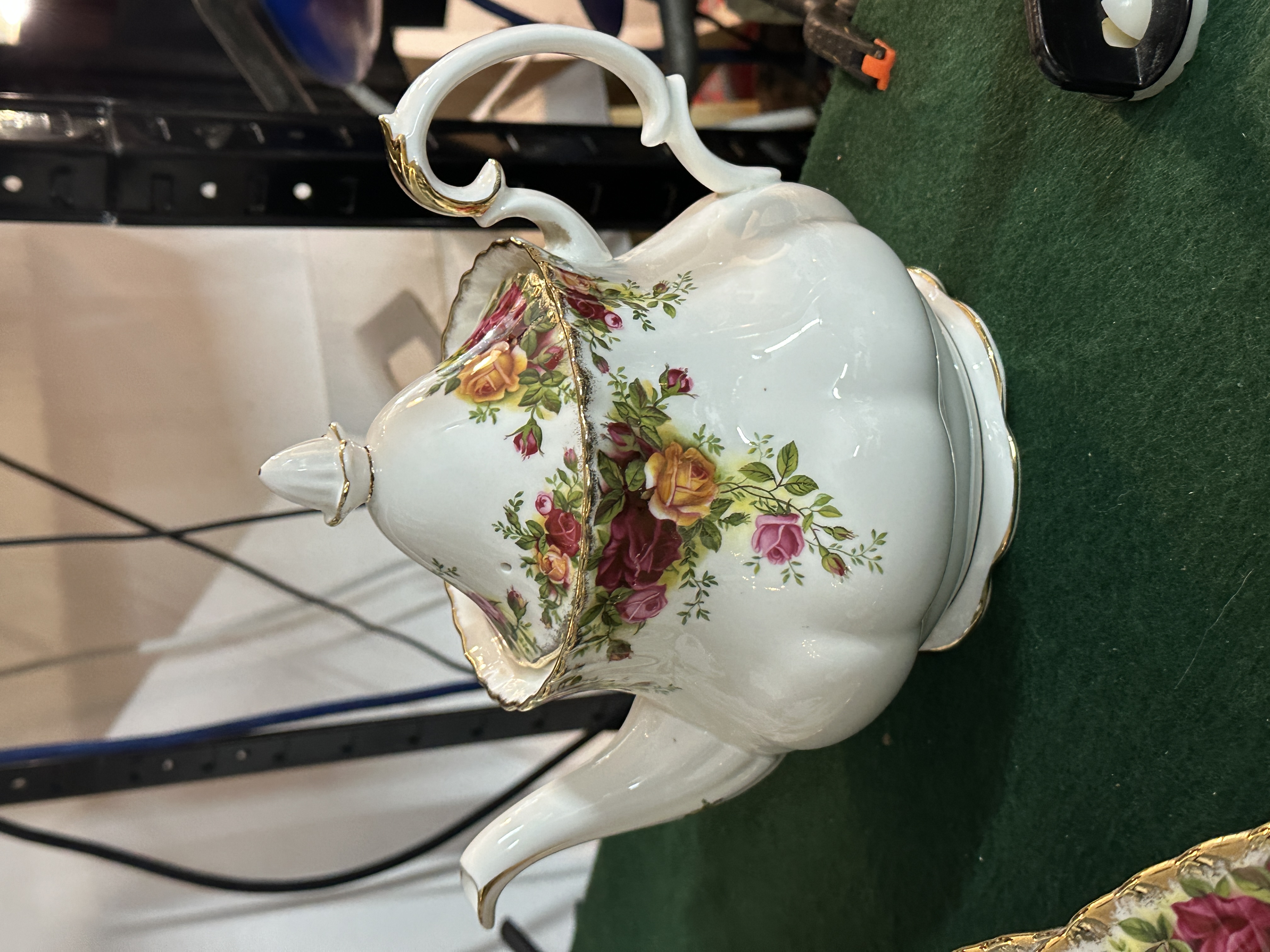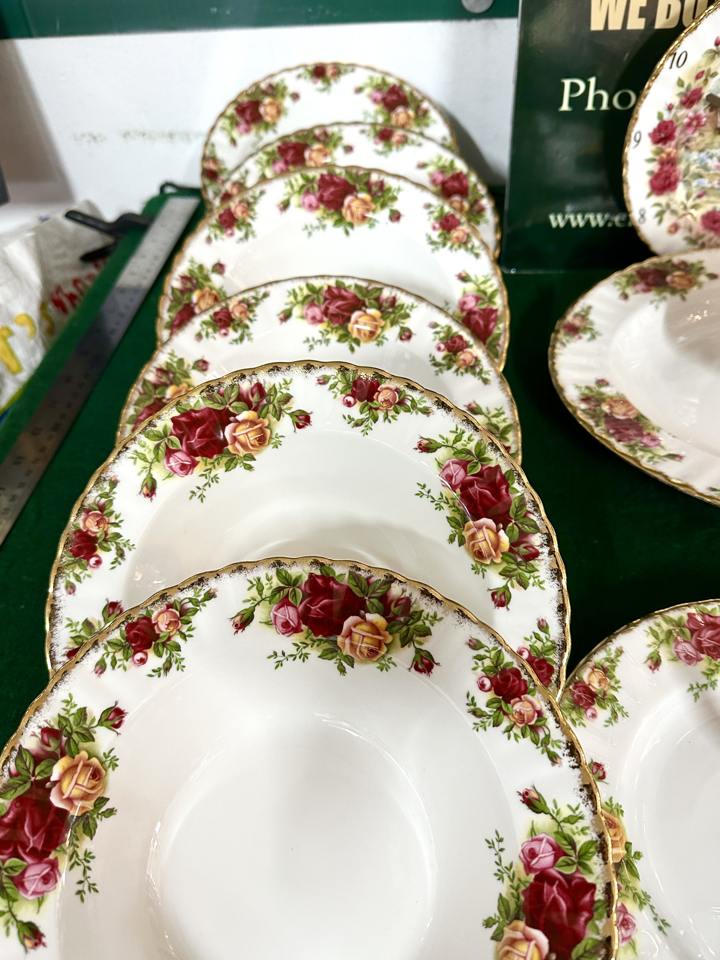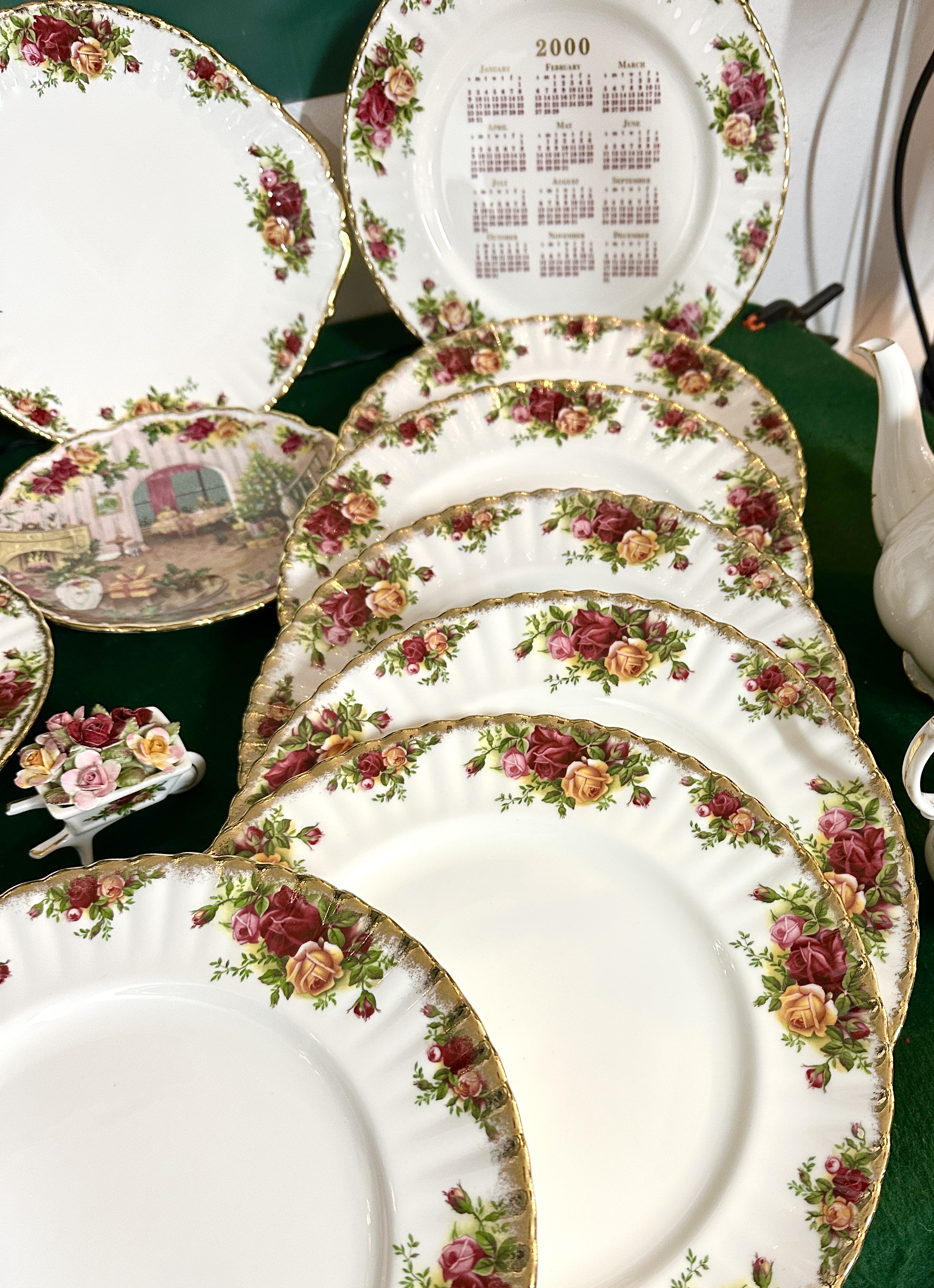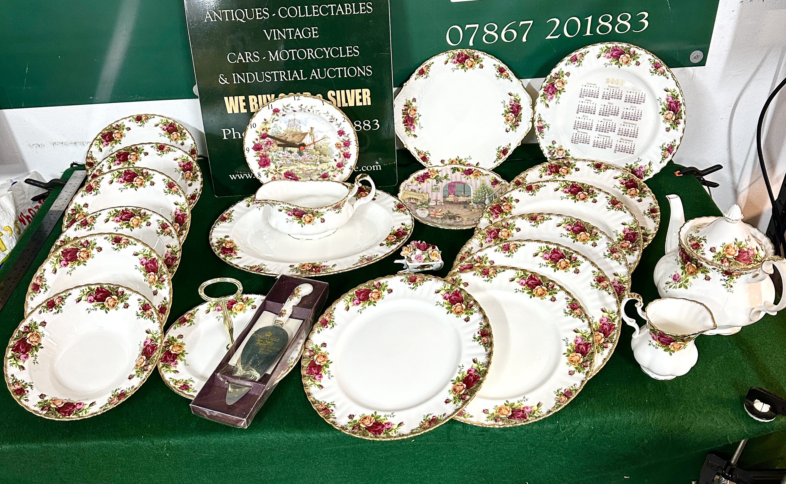 A collection of Royal Albert bone china in the Old Country Roses pattern. The group includes a lidded teapot, a cream jug, a sauce boat with a matching underplate, and a boxed cake server with a ceramic handle. The service features several dinner plates, side plates, and bowls. Decorative items within the lot consist of a wall clock fashioned from a plate, a calendar plate for the year 2000, a small floral wheelbarrow ornament, and a collector plate depicting a Christmas interior scene. All pieces feature the characteristic transfer-printed design of red, pink, and yellow roses with green foliage and scalloped gilt rims. The items bear the Royal Albert Bone China England backstamp.