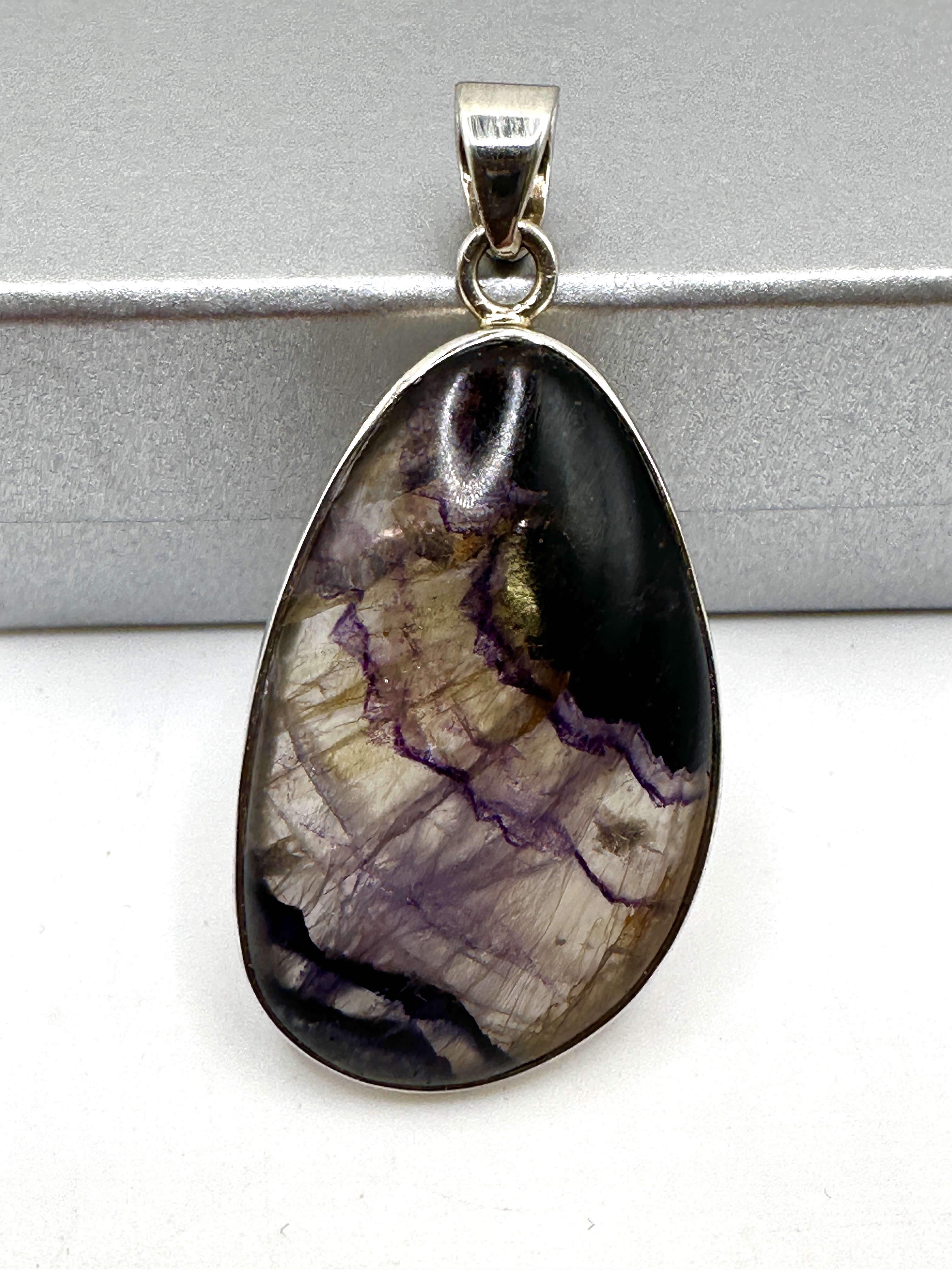 A 925 silver pendant featuring a large teardrop-shaped fluorite cabochon. The stone is secured in a minimalist bezel setting and displays characteristic purple, white, and dark brown banding. The pendant is suspended from a polished, tapered bail. The reverse of the bail is hallmarked 925 alongside an indistinct maker’s mark in a square punch.