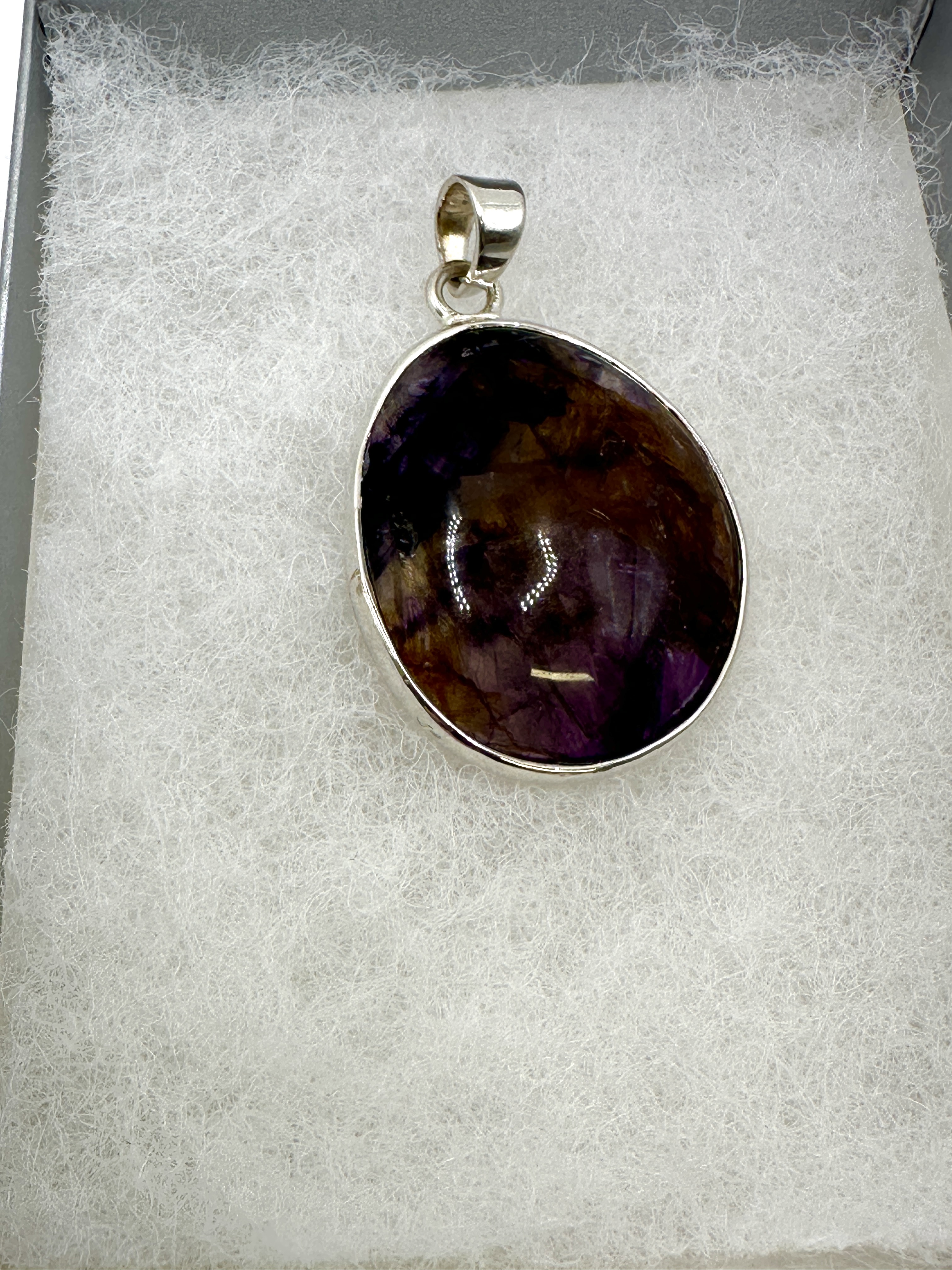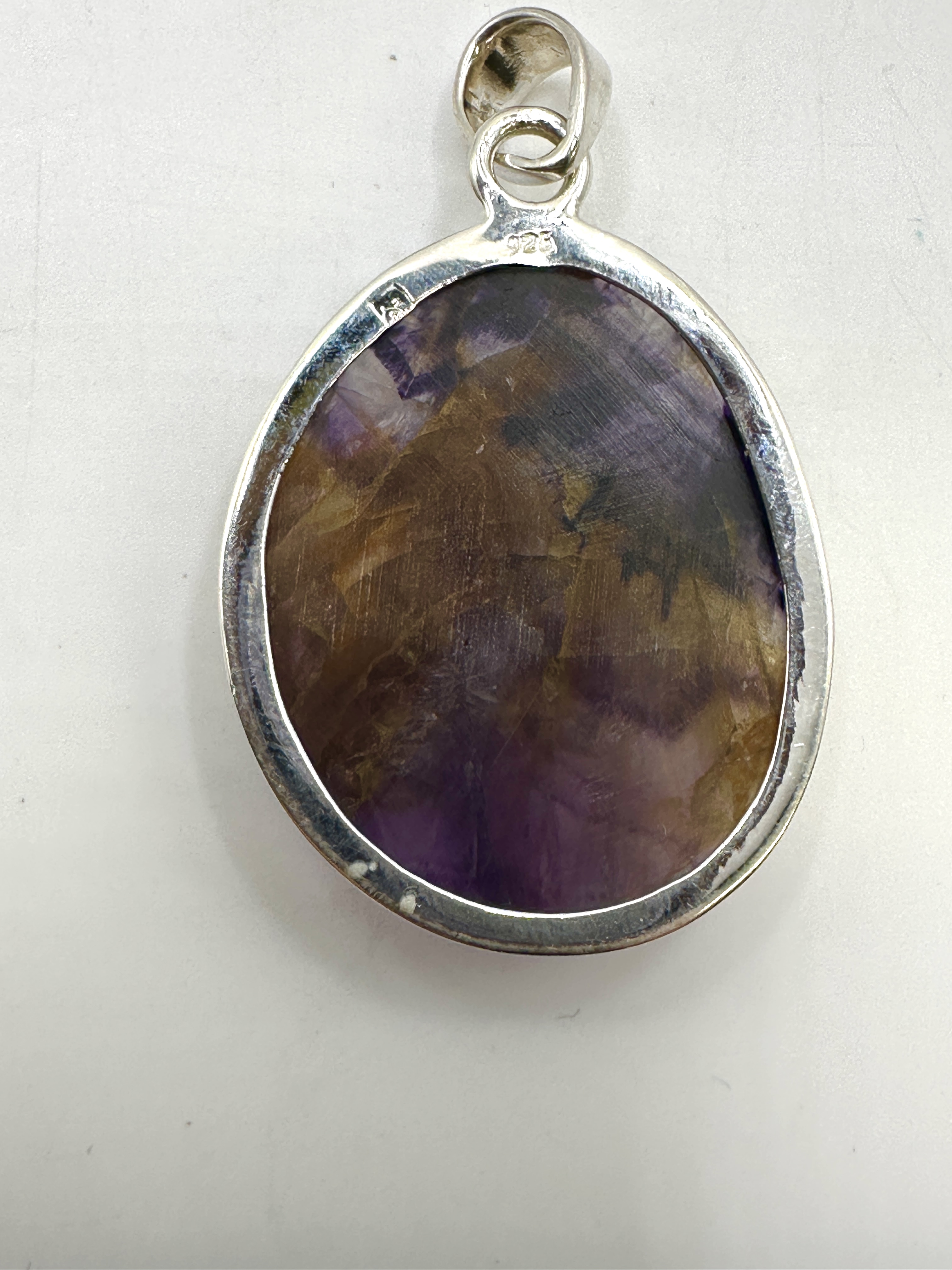 A 925 silver pendant featuring a large ovoid cabochon of Blue John fluorite. The gemstone is secured in a simple bezel setting and displays characteristic natural banding in shades of deep purple and honey-brown. The pendant is suspended from a tapering silver bail. The reverse of the silver setting is stamped with a 925 hallmark and a small, square maker’s mark.