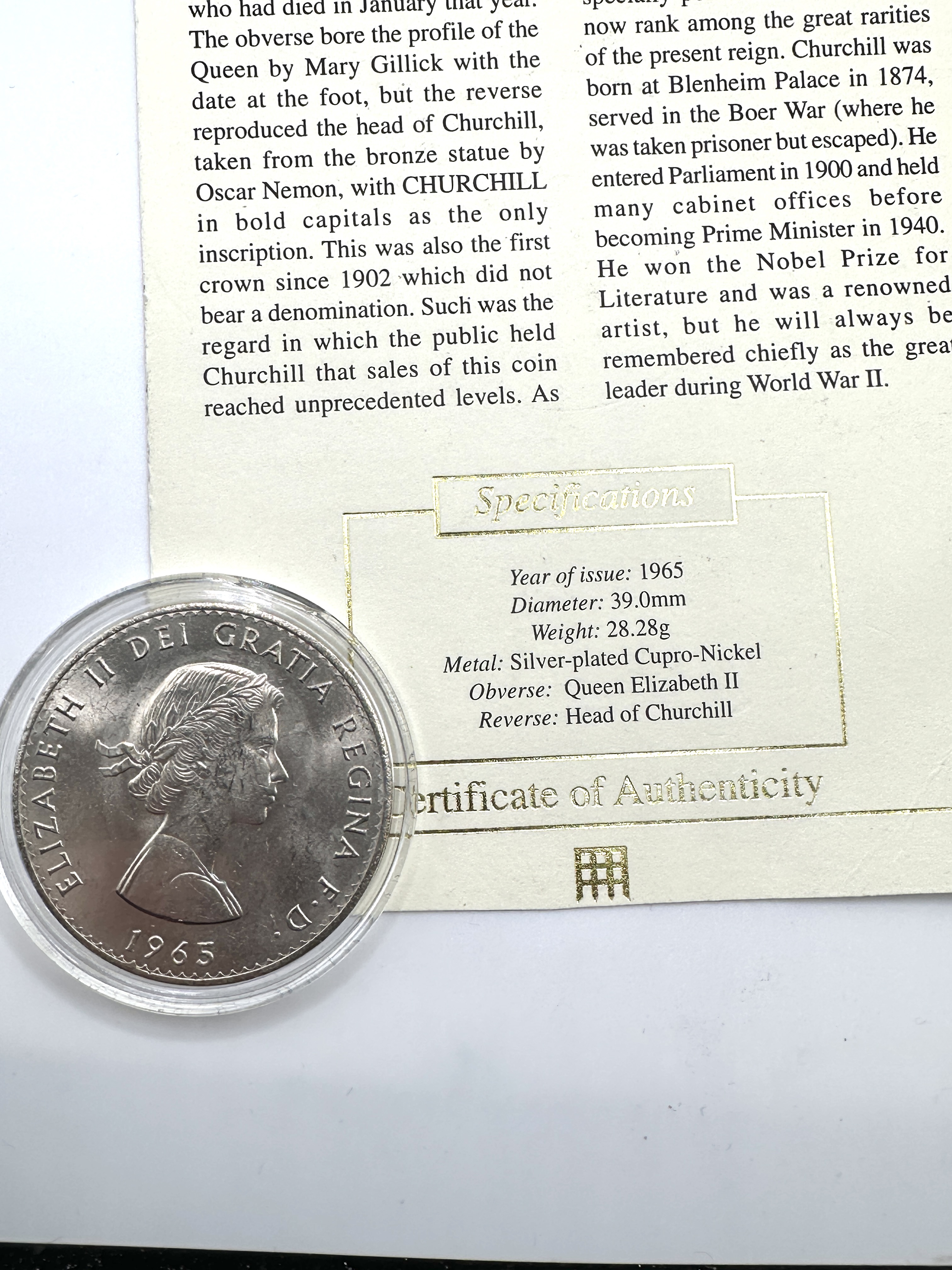 This lot comprises a 1965 Winston Churchill commemorative five-shilling crown, a colourised medallion, and a certificate of authenticity. The 1965 crown is minted in silver-plated cupro-nickel, featuring the obverse profile of Queen Elizabeth II by Mary Gillick with the Latin inscription ELIZABETH II DEI GRATIA REGINA F. D. and the date. The reverse displays a portrait of Winston Churchill by Oscar Nemon. The second item is a modern commemorative medallion presented in a clear protective capsule, showing a colourised profile of Churchill over a Union Jack background. The collection includes a printed specification card and certificate of authenticity from The Historic Coins of Great Britain.