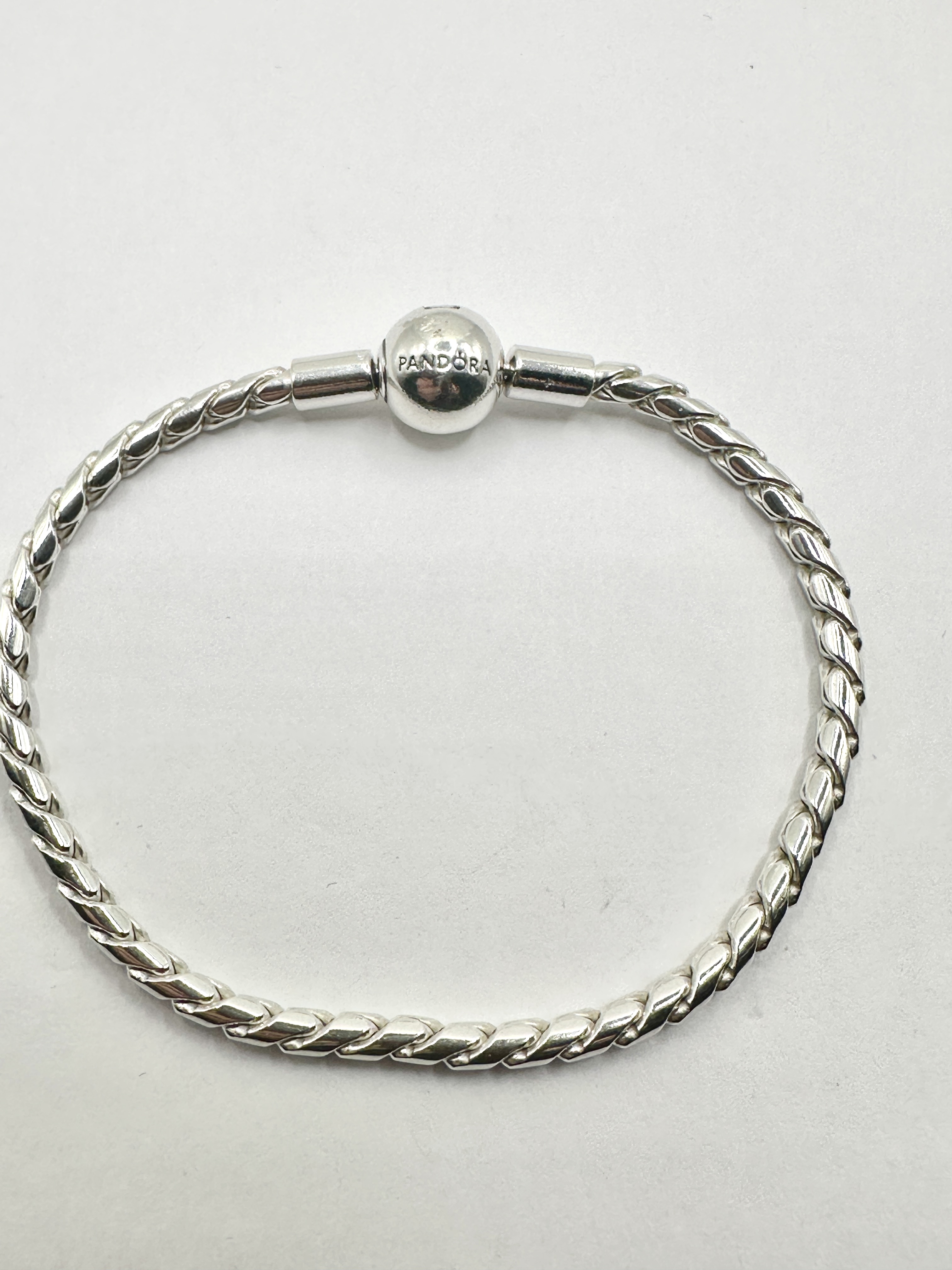 A Pandora Round Clasp Wing Chain Bracelet, constructed from 925 silver. The piece features a twisted rope-style chain design, secured by a spherical snap clasp. The exterior of the clasp is engraved with the PANDORA brand name. The interior of the clasp is hallmarked S925 ALE, signifying the silver purity and the maker’s mark.