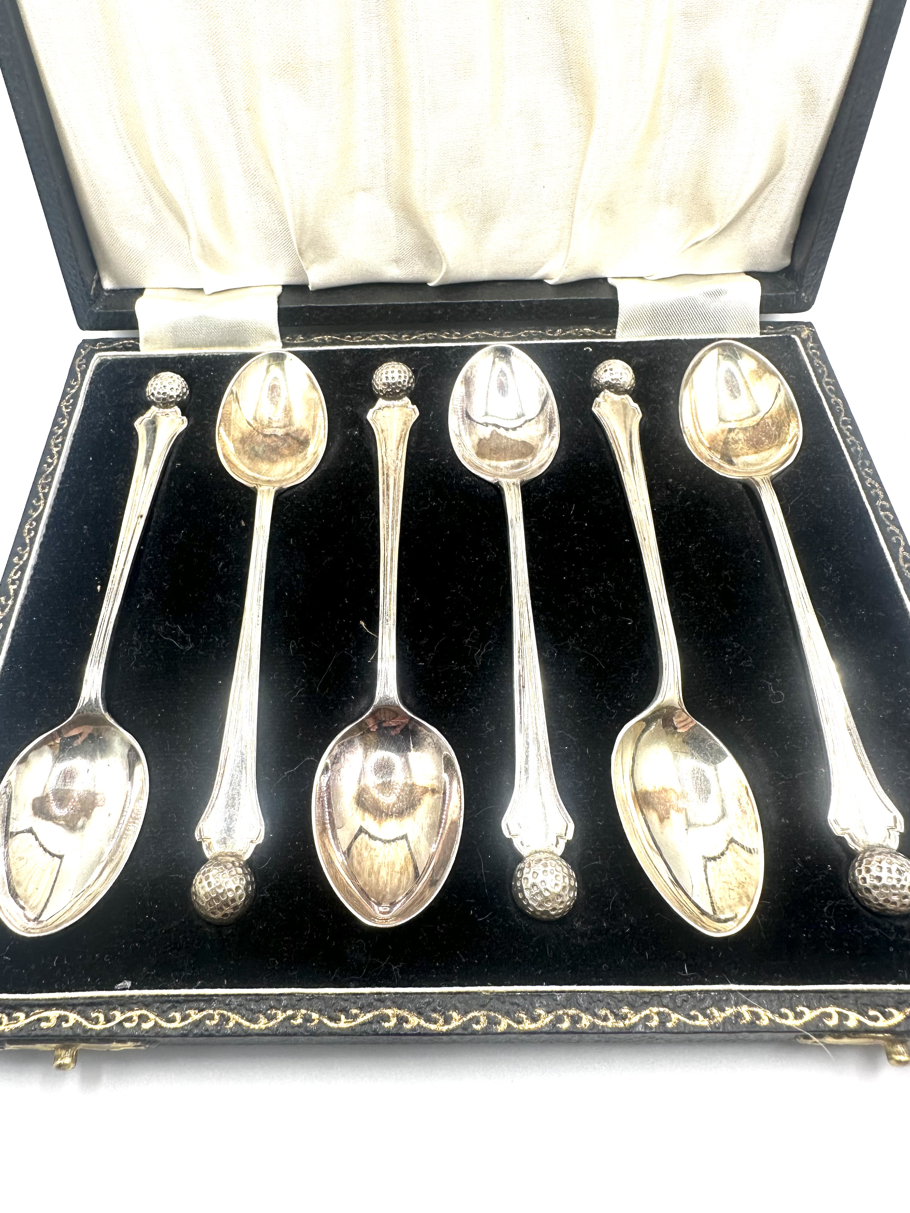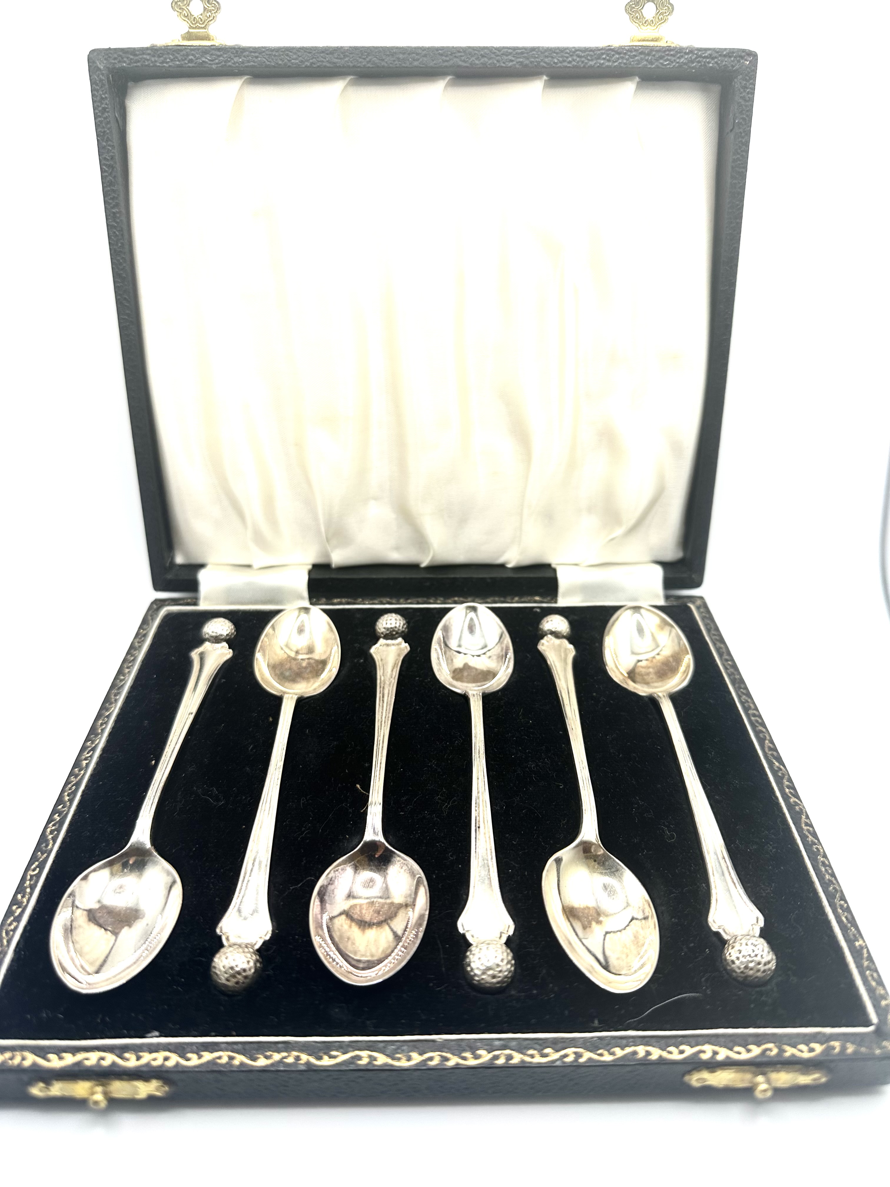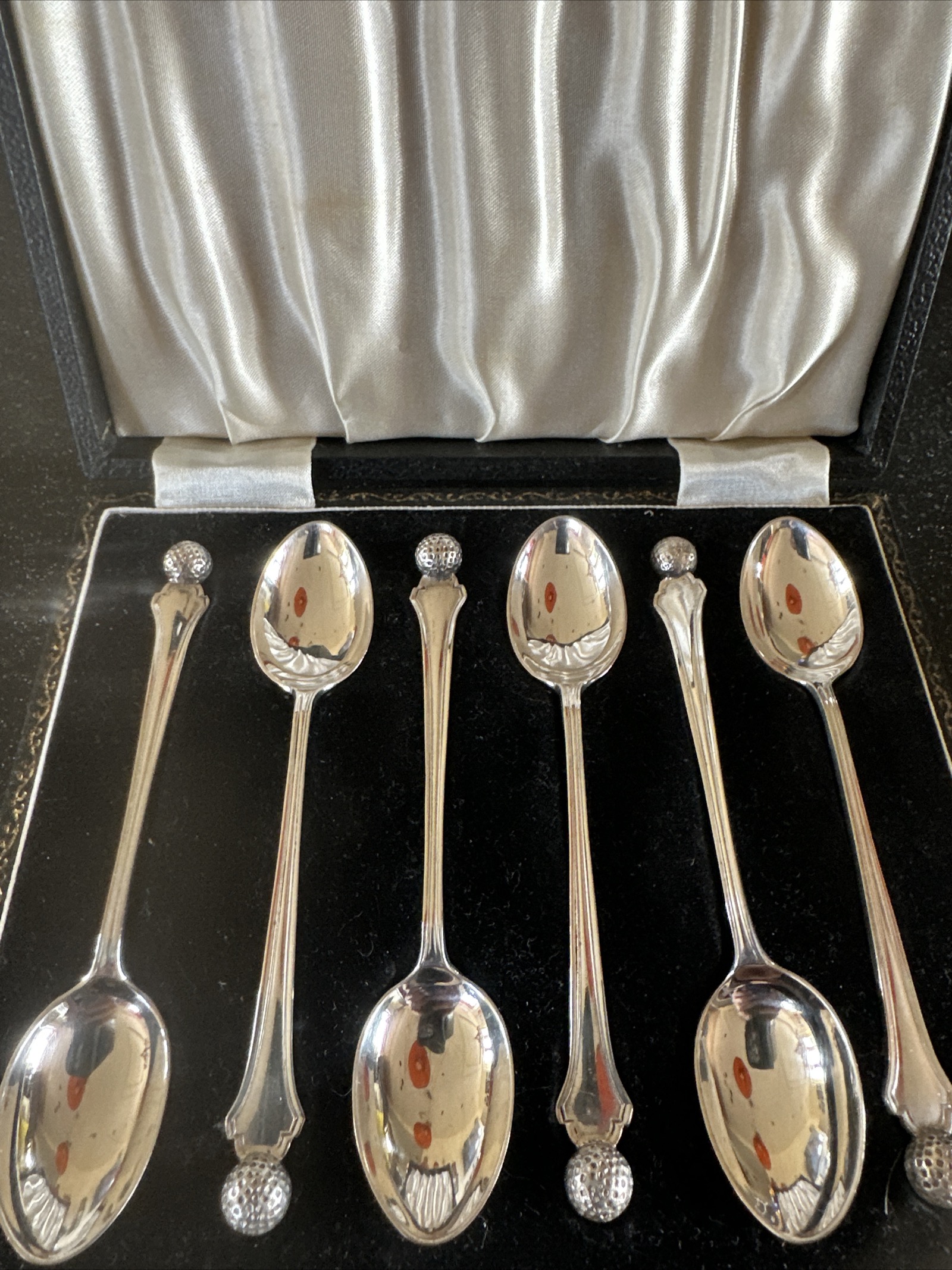 A set of 925 silver demitasse spoons manufactured by Cooper Brothers & Sons. Each spoon features a terminal cast in the form of a dimpled golf ball. The reverse of the bowls bears a full set of English hallmarks, including the maker’s mark CB&S, the Sheffield assay office crown, the lion passant silver standard mark, and the date letter e for 1922. The collection is housed in a black leatherette-covered presentation case featuring a gold-tooled border and two brass-toned latches. The interior of the case is fitted with a black velvet base and a cream satin-lined lid.
