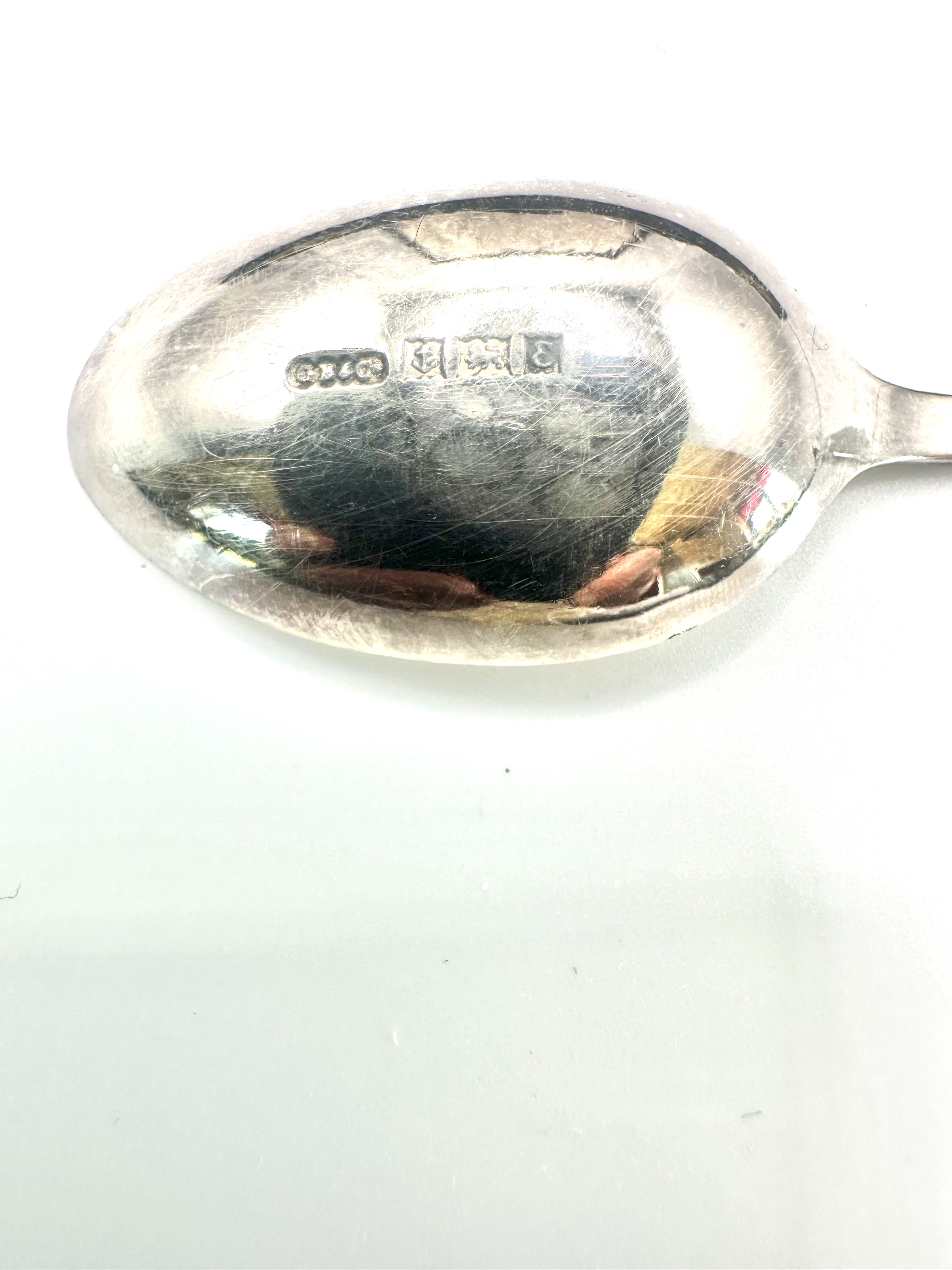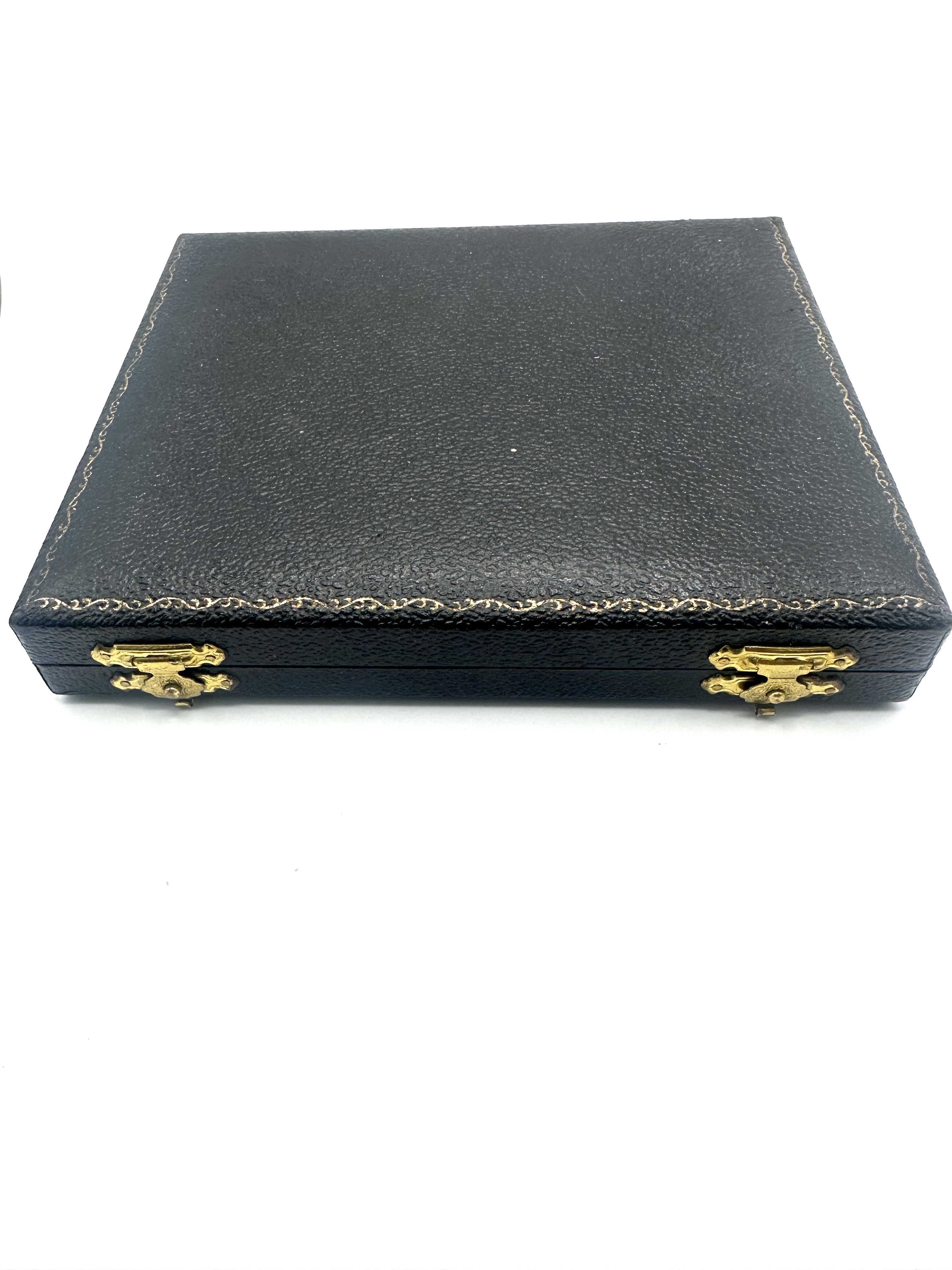 The silver displays minor surface scratches and light tarnish consistent with age and use. The presentation box shows exterior wear to the edges and corners, with light staining present on the interior satin lining.