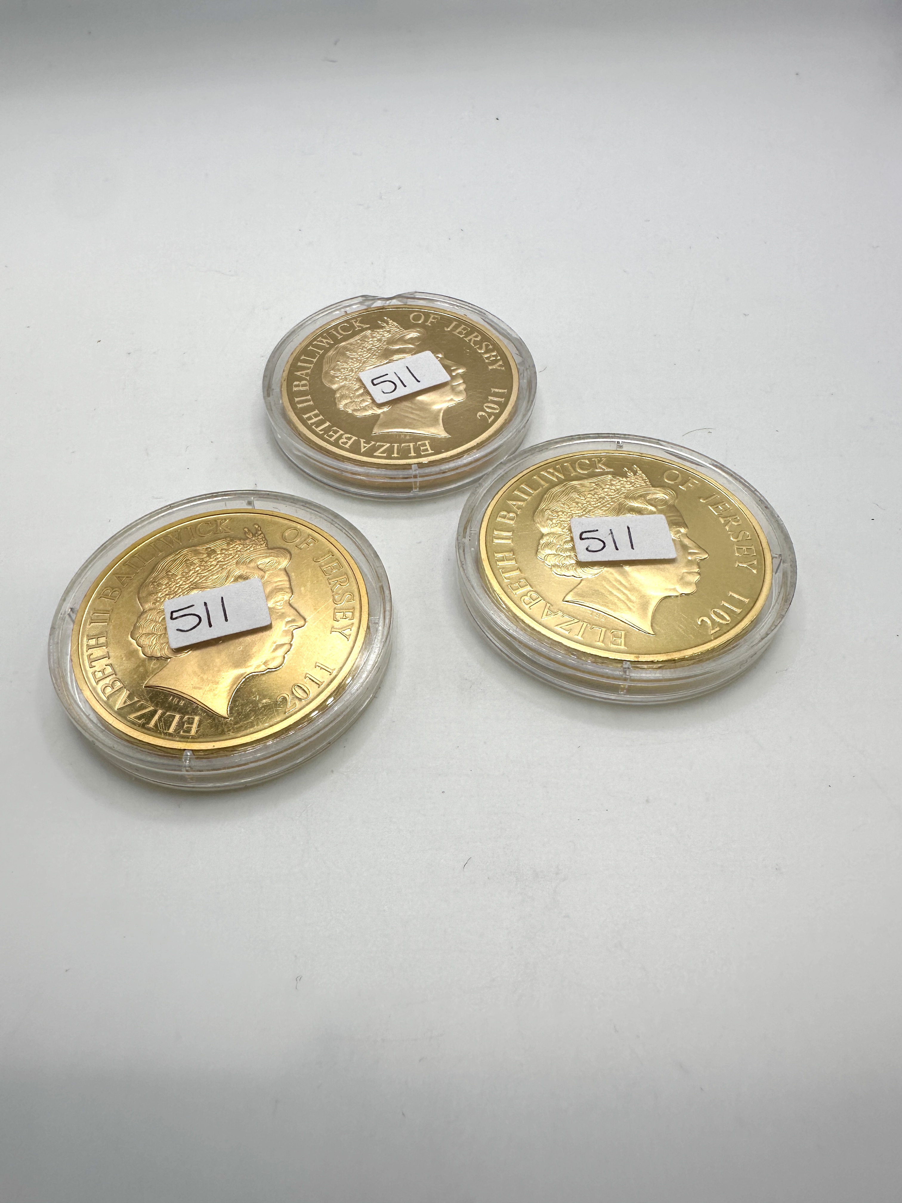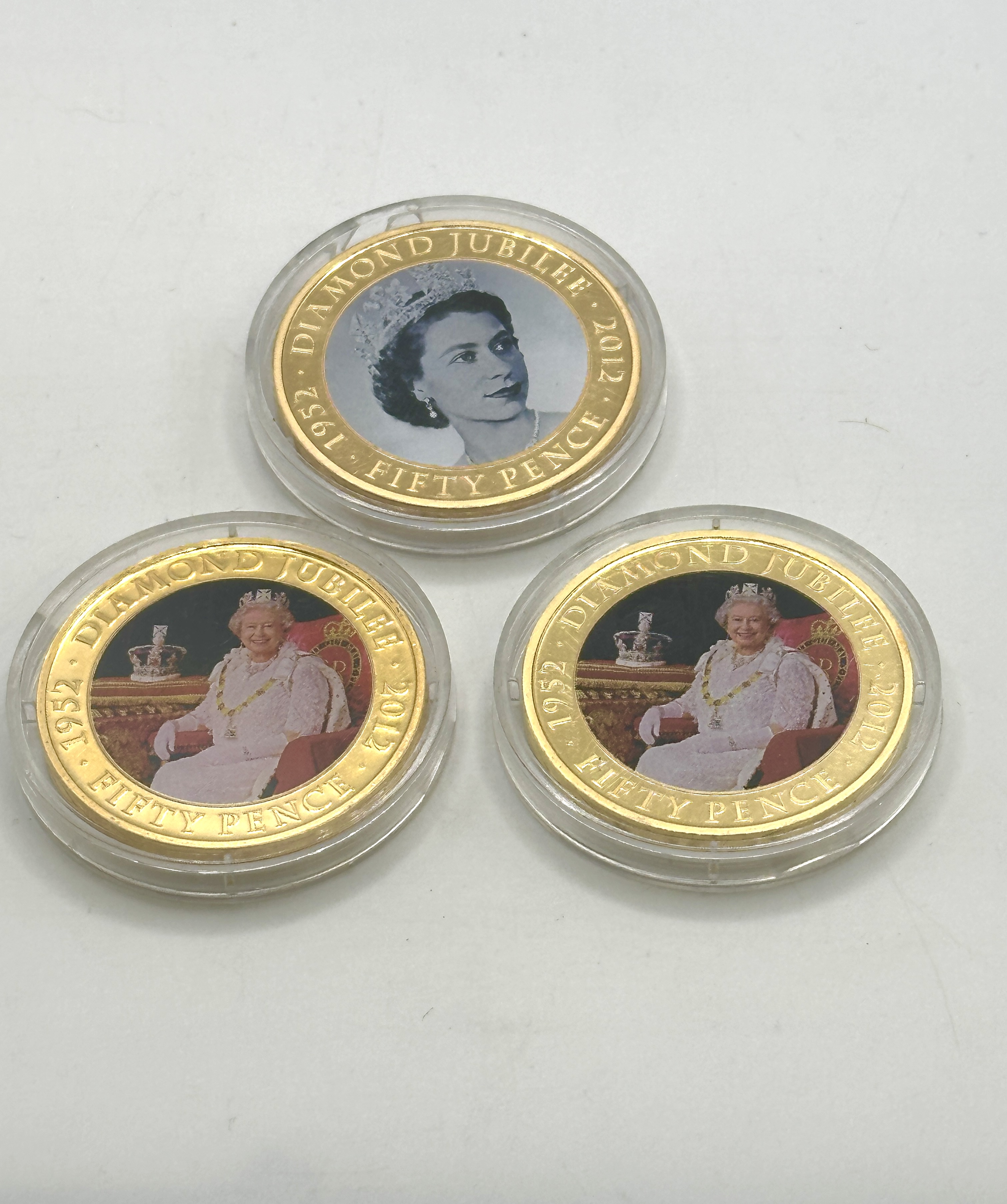 A trio of commemorative fifty-pence coins issued by the Bailiwick of Jersey in 2011 to mark the 2012 Diamond Jubilee of Queen Elizabeth II. Struck in gold-plated metal, the coins feature different obverse designs. Several display a coloured photographic portrait of the Queen seated in state regalia, while another shows a monochrome bust of the young monarch. Each obverse is inscribed with DIAMOND JUBILEE, the dates 1952 and 2012, and the denomination FIFTY PENCE. The reverse of each coin depicts the standard portrait of Queen Elizabeth II with the legend ELIZABETH II BAILIWICK OF JERSEY and the date 2011. The coins are presented in clear, circular protective capsules.