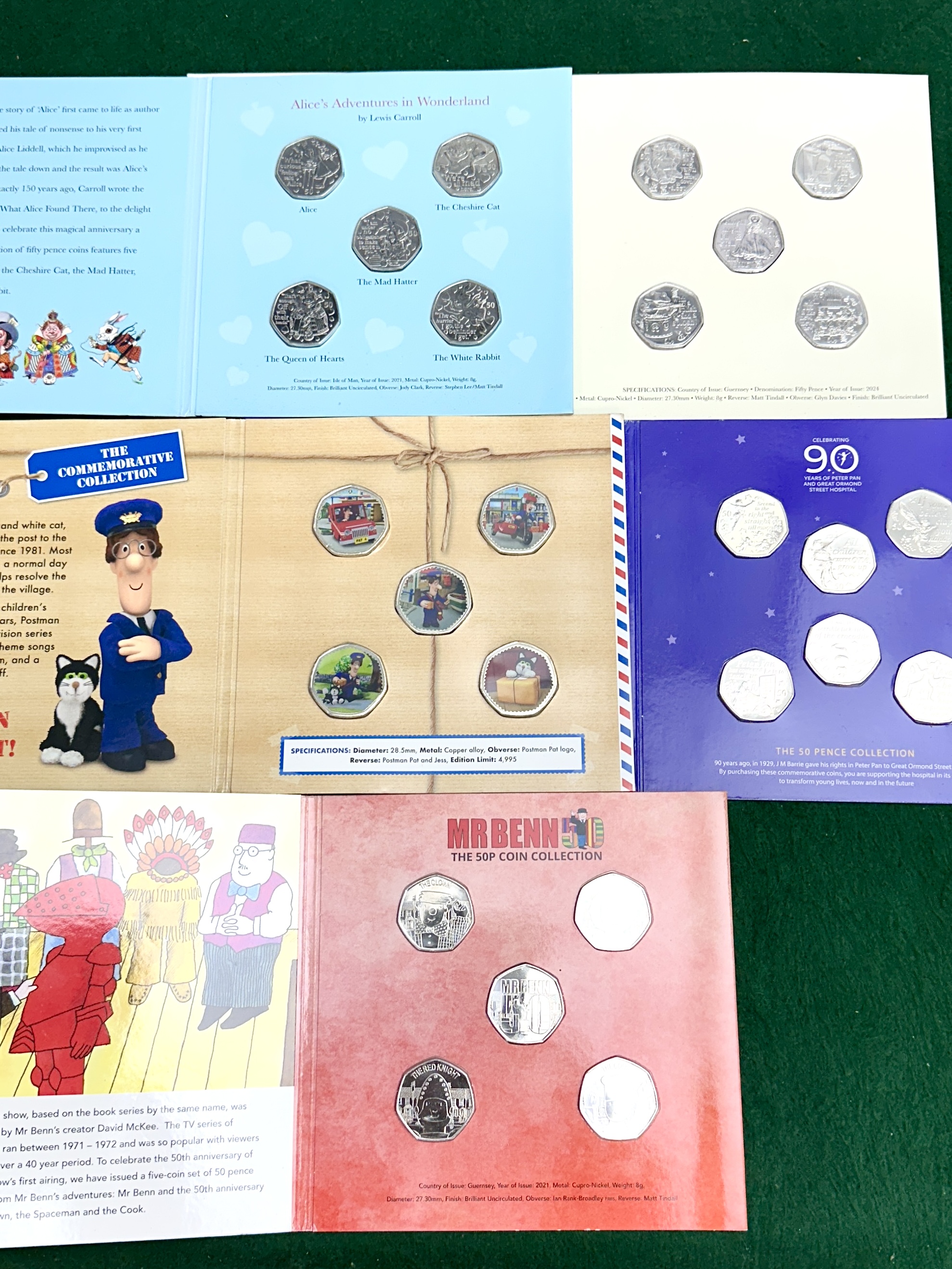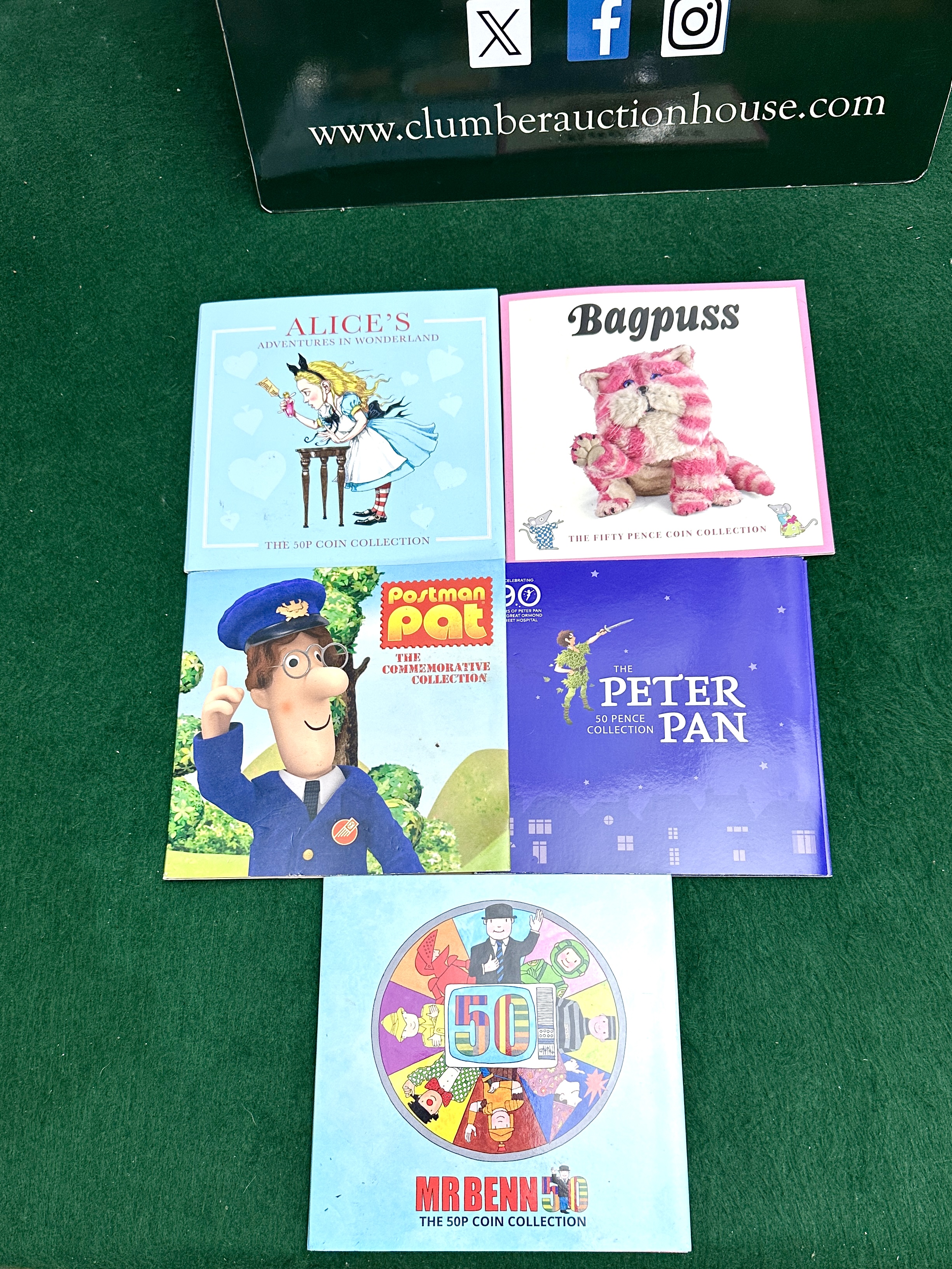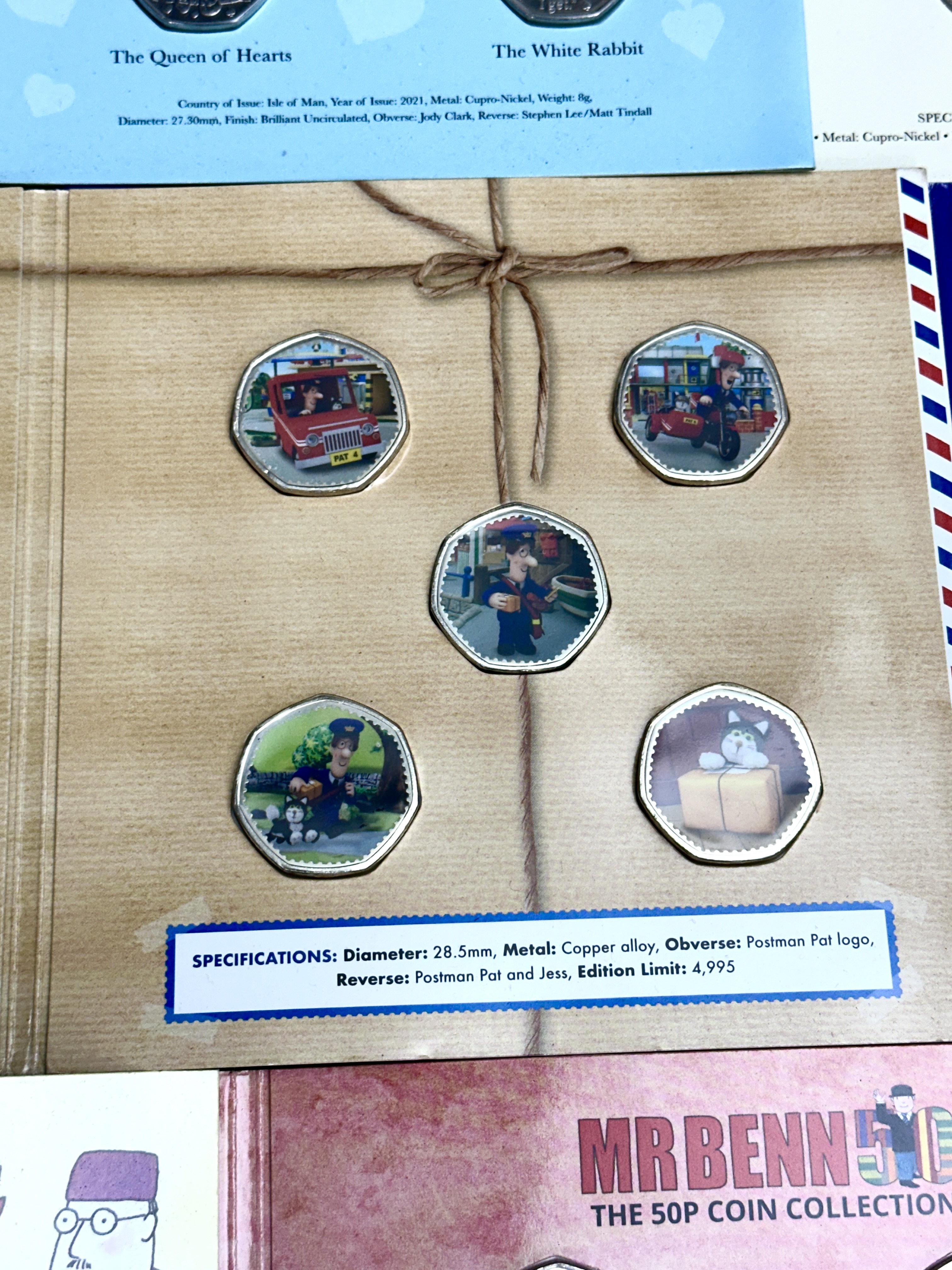 A collection of commemorative fifty pence coin sets featuring various characters from children’s literature and television. The collection includes sets for Alice’s Adventures in Wonderland (Isle of Man, 2021), Bagpuss (Guernsey, 2024), Postman Pat (Isle of Man, 2021), Peter Pan (90th Anniversary of Great Ormond Street Hospital), and Mr Benn (Guernsey, 2021). The coins are struck in cupro-nickel and copper alloy, with the Postman Pat set featuring colour-printed reverse designs depicting Pat and Jess. Each set is housed in an illustrated presentation folder containing technical specifications. The Alice’s Adventures in Wonderland set contains five coins: Alice, The Cheshire Cat, The Mad Hatter, The Queen of Hearts, and The White Rabbit. The Postman Pat set is noted as having an edition limit of 4,995. Inscriptions on the folders provide technical details including metal content, diameter, and weight.