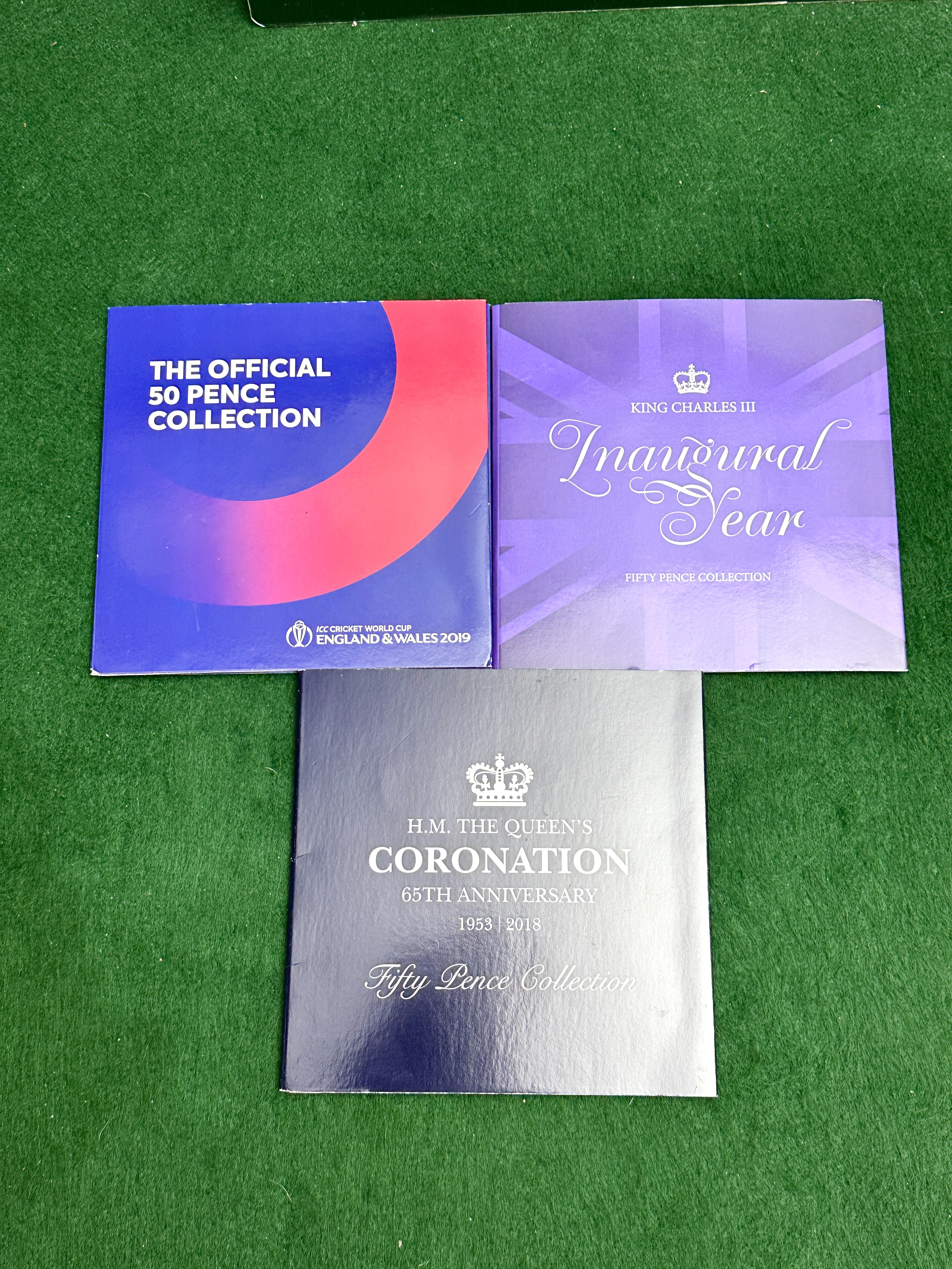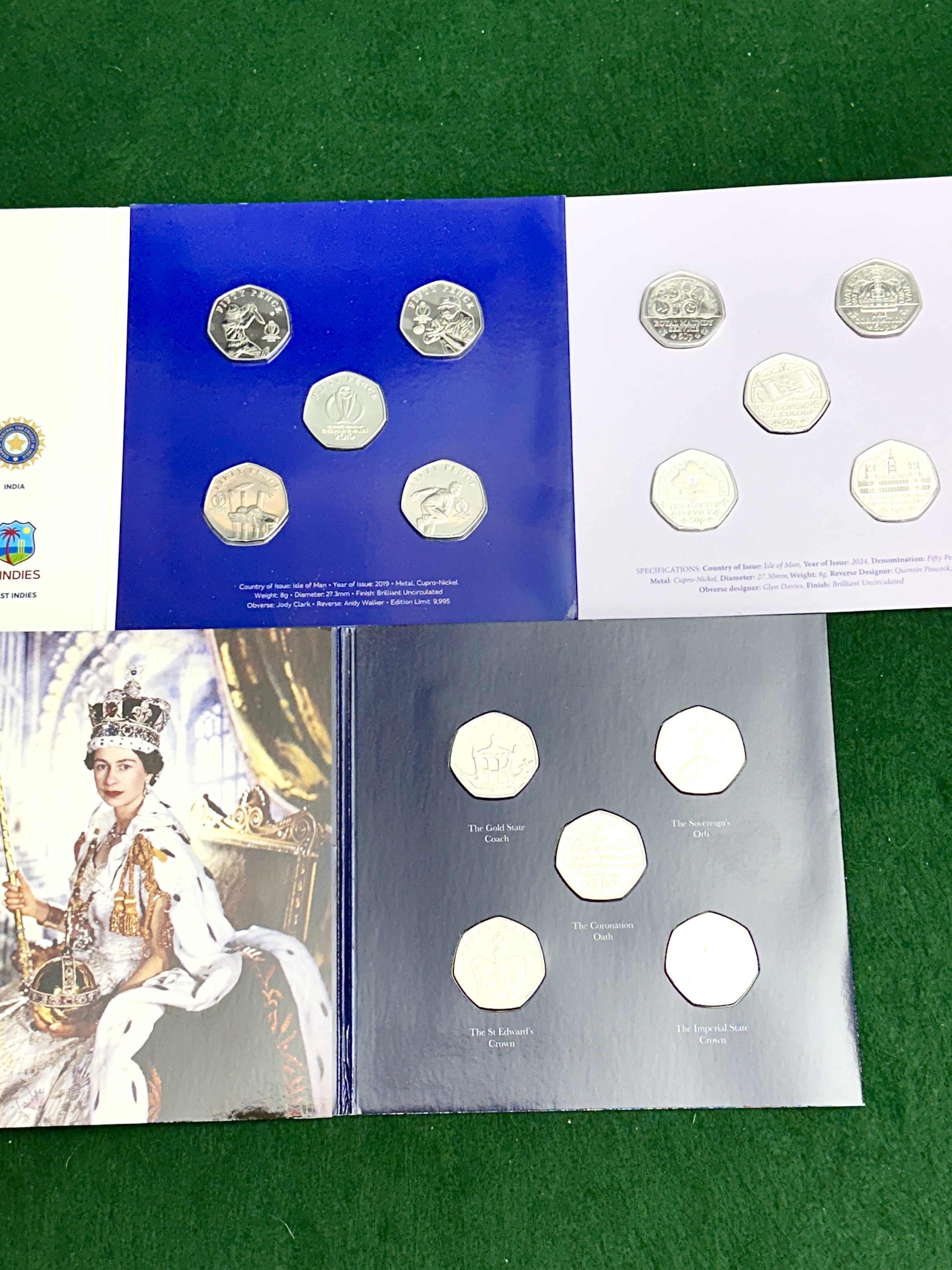 A collection of three Isle of Man commemorative fifty pence coin presentation packs. The group includes the Official ICC Cricket World Cup England and Wales 2019 set, the King Charles III Inaugural Year 2024 set, and the H.M. The Queen’s Coronation 65th Anniversary 1953-2018 set. Each pack contains five cupro-nickel coins in brilliant uncirculated finish. The Cricket World Cup set features various cricketers and the official logo, with a stated edition limit of 9,995. The King Charles III set includes designs such as the Royal Maundy Service and Trooping the Colour. The Queen’s Coronation set features regalia including the Gold State Coach, The Sovereign’s Orb, The Coronation Oath, The St Edward’s Crown, and The Imperial State Crown. All coins are presented in their original illustrated cardboard folders containing historical background and technical specifications.