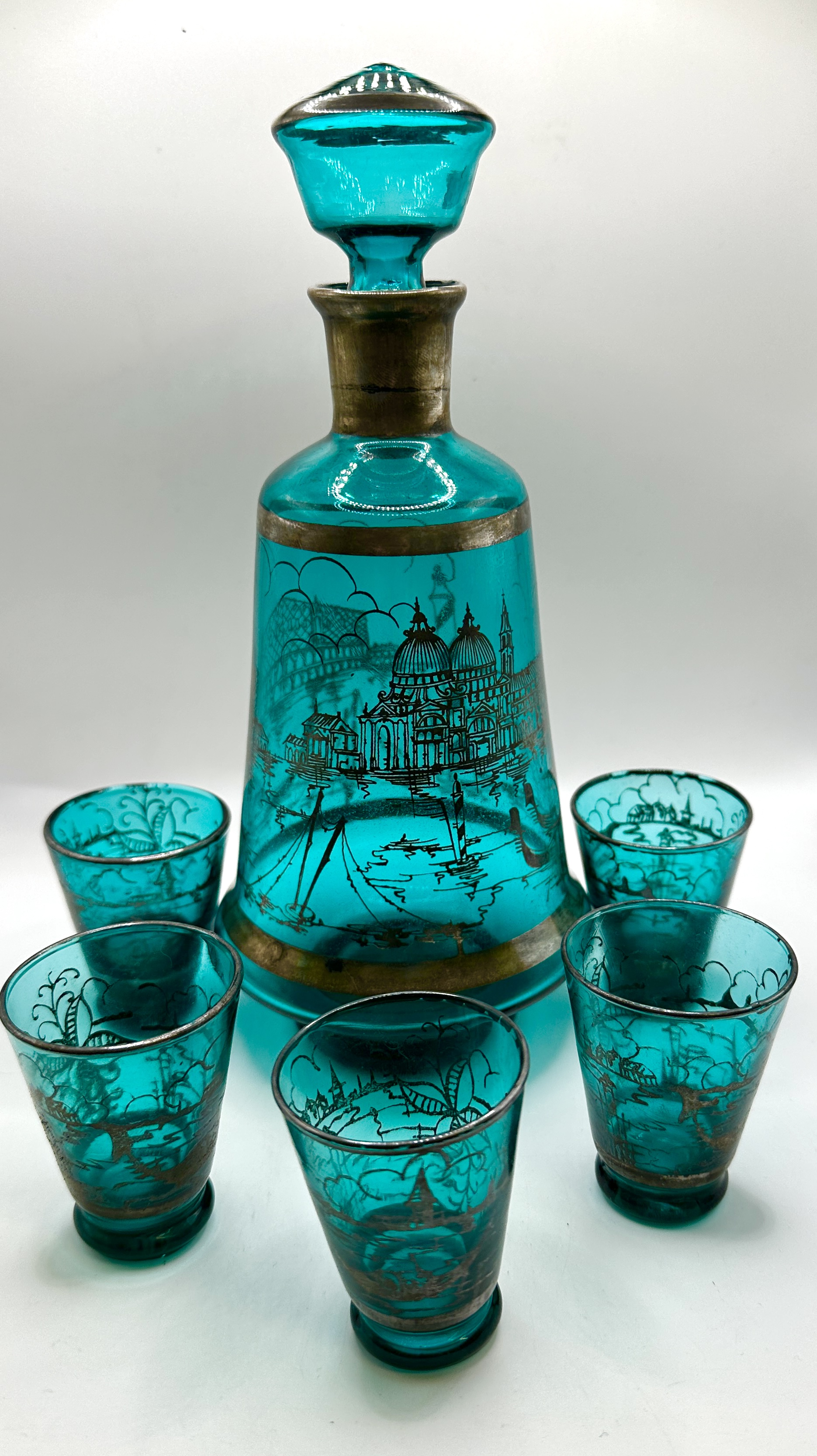 A set of turquoise-coloured glass liqueur items, attributed to Murano, comprising a decanter with a matching stopper and coordinating glasses. The set features silver-toned overlay decoration depicting Venetian architectural landmarks, including the Basilica di Santa Maria della Salute and gondolas. The decanter is of a tapered form with silvered bands at the neck and base. The glasses are of a matching conical shape with silver-toned rims and bases. The decorative scenes are rendered in a fine-line style. No maker marks or signatures are visible on any of the pieces.