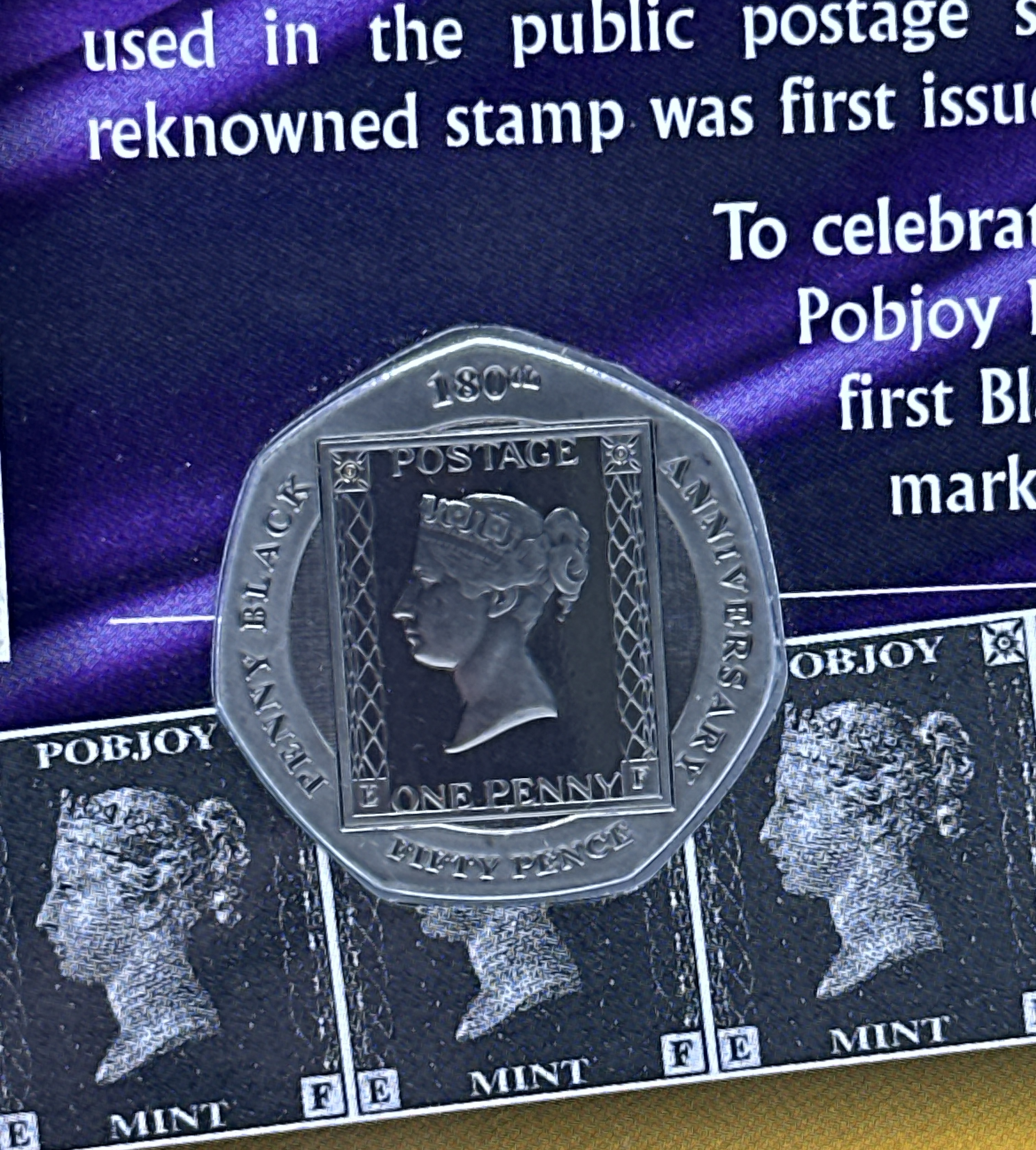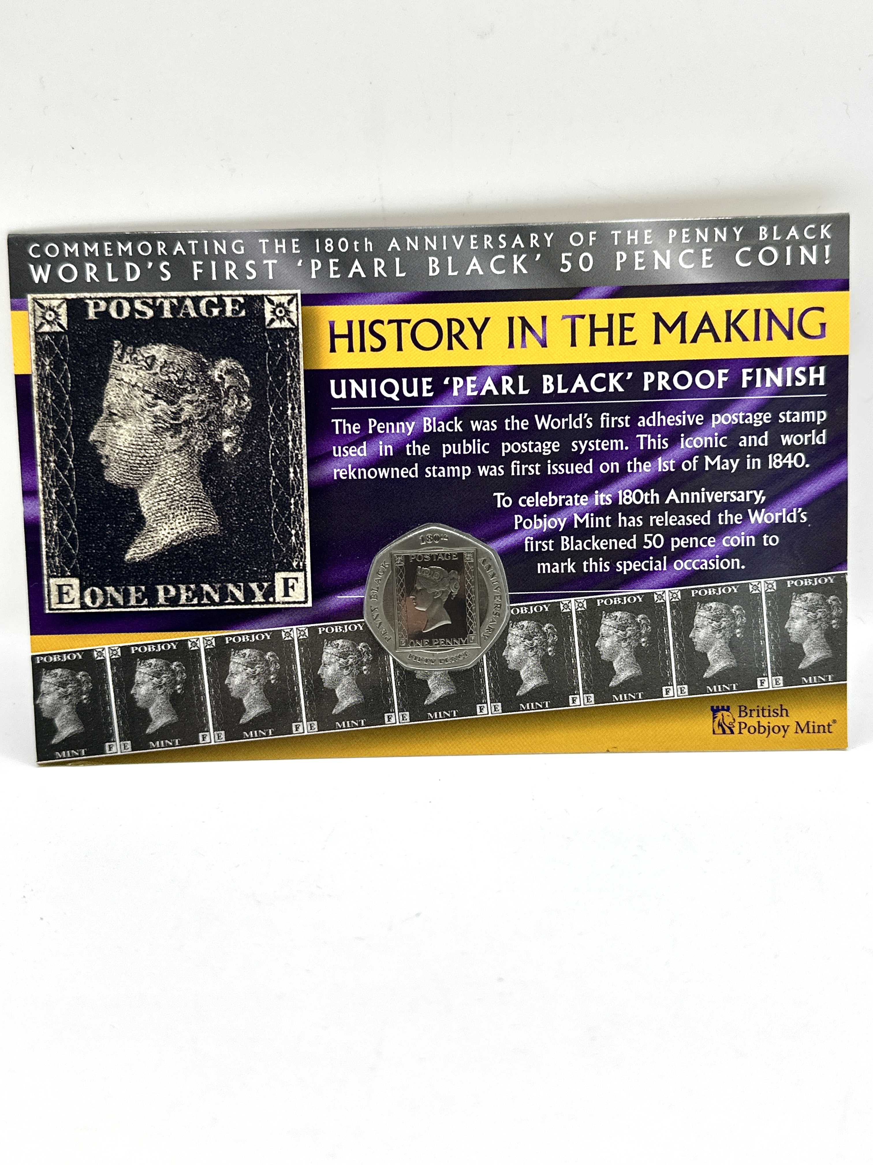 A Pobjoy Mint commemorative 50 pence coin issued to celebrate the 180th anniversary of the Penny Black postage stamp. The coin features a Pearl Black proof finish and depicts the 1840 Penny Black stamp with the profile of Queen Victoria on the reverse. The coin is housed in a clear protective capsule and is presented on its original illustrated descriptive card which details the history of the world’s first adhesive postage stamp. The card includes the British Pobjoy Mint logo and branding.