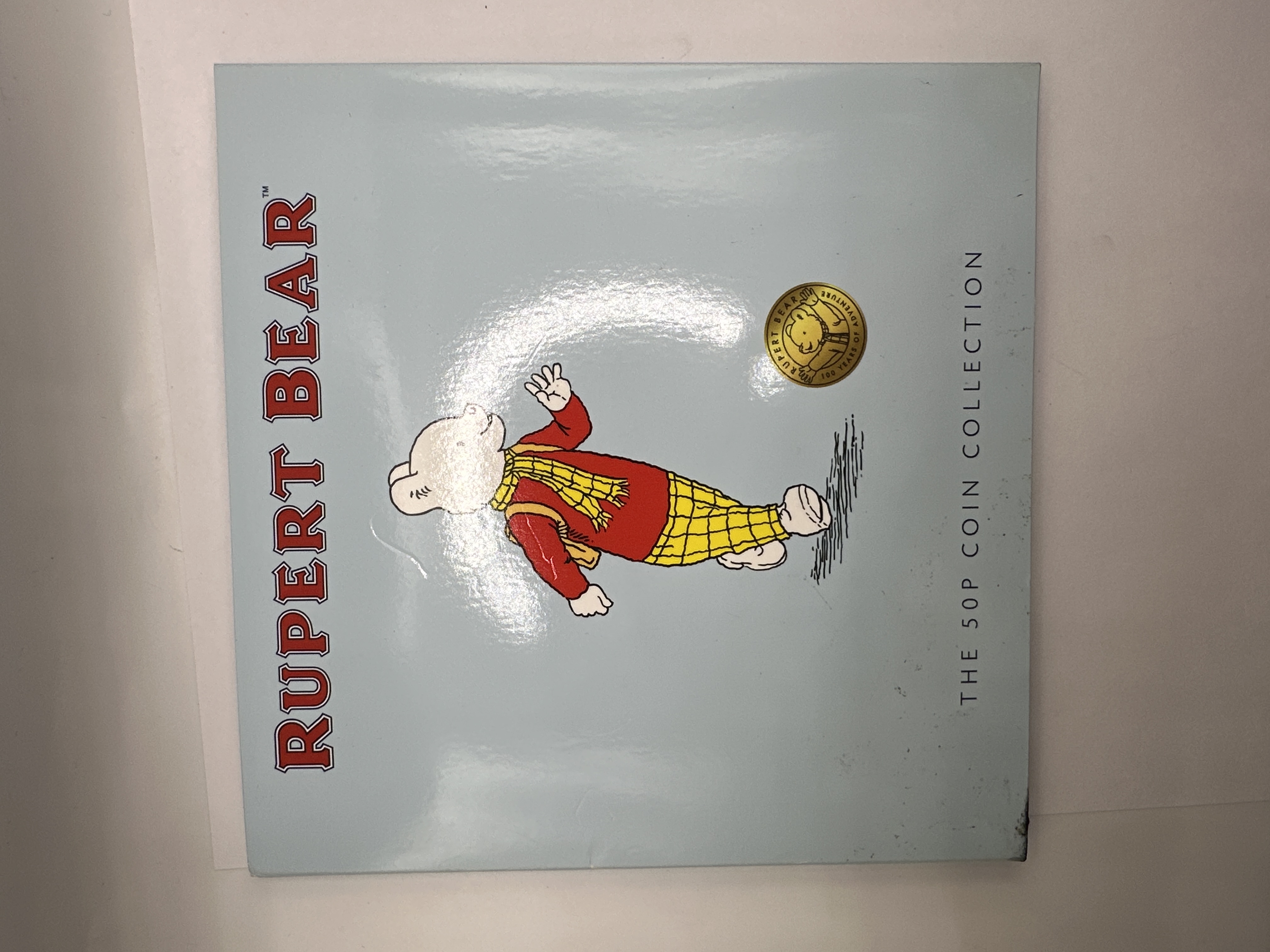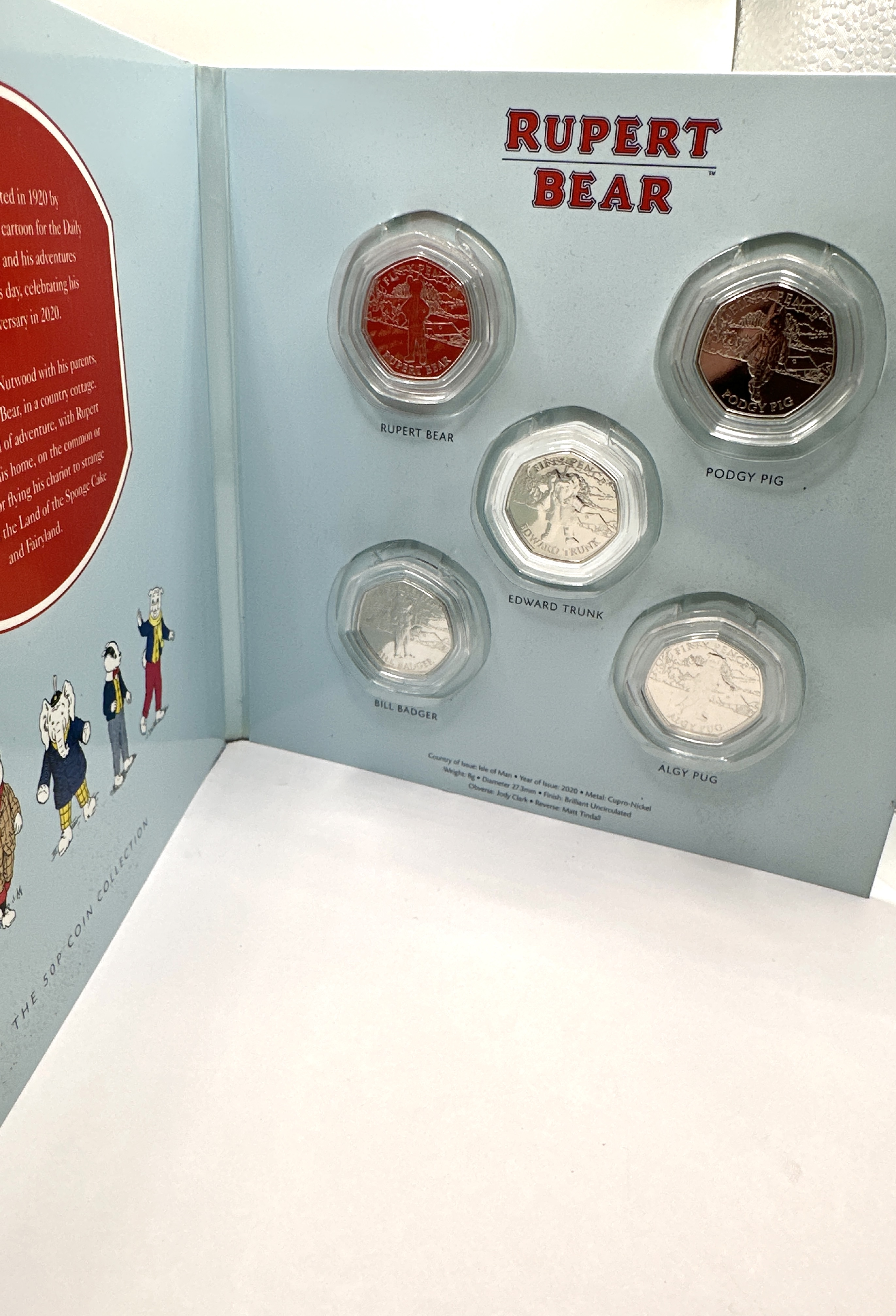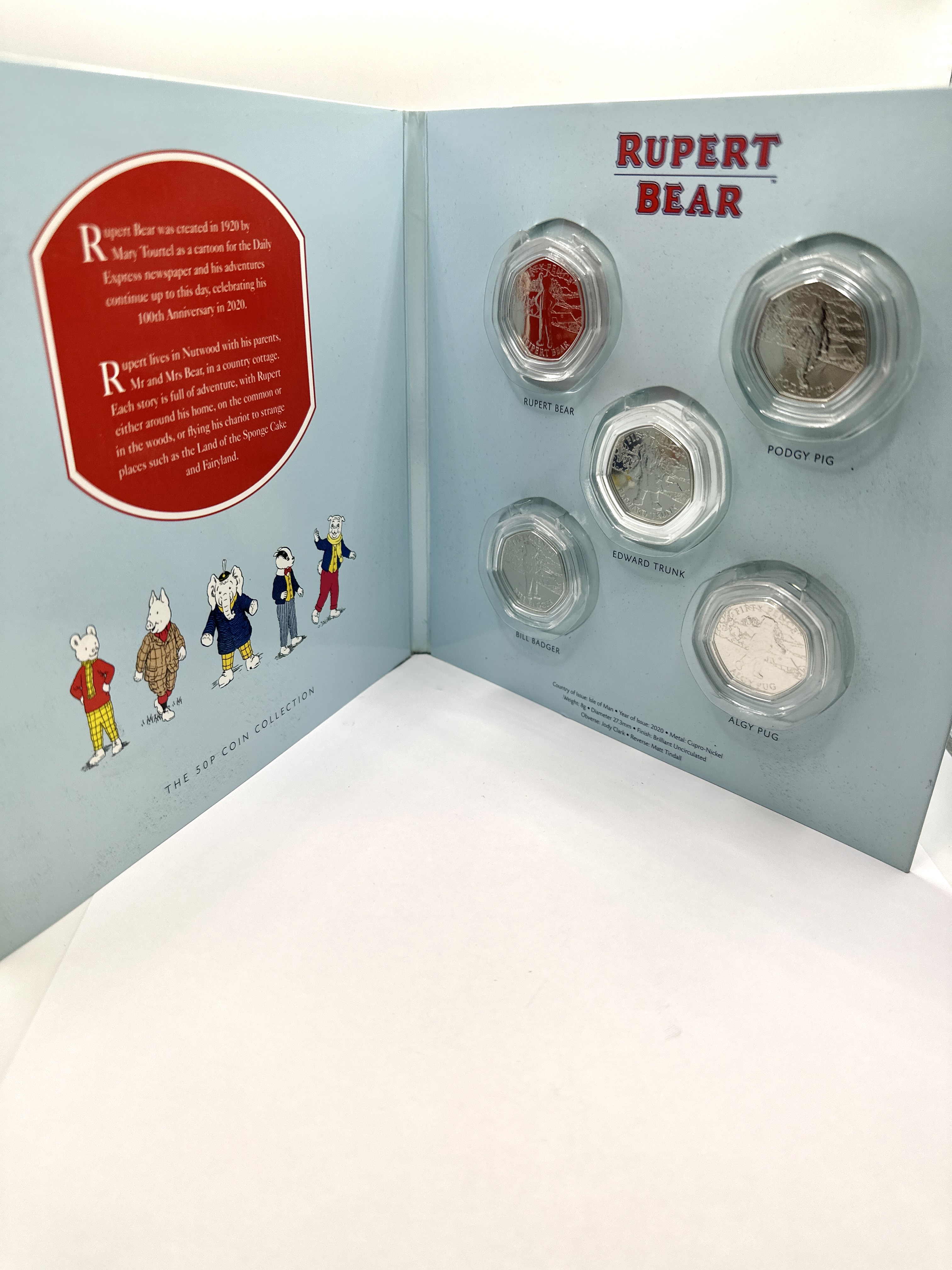 A collection of Isle of Man 50p coins issued in 2020 to mark the 100th anniversary of the character Rupert Bear. The set is presented in the original light blue illustrated folder and contains cupro-nickel coins with a brilliant uncirculated finish. The reverse designs, created by Matt Tindall, depict Rupert Bear, Podgy Pig, Edward Trunk, Bill Badger, and Algy Pug. One coin features a colourised depiction of Rupert Bear in his signature red jumper. The obverse of each coin features the Jody Clark effigy of Queen Elizabeth II.