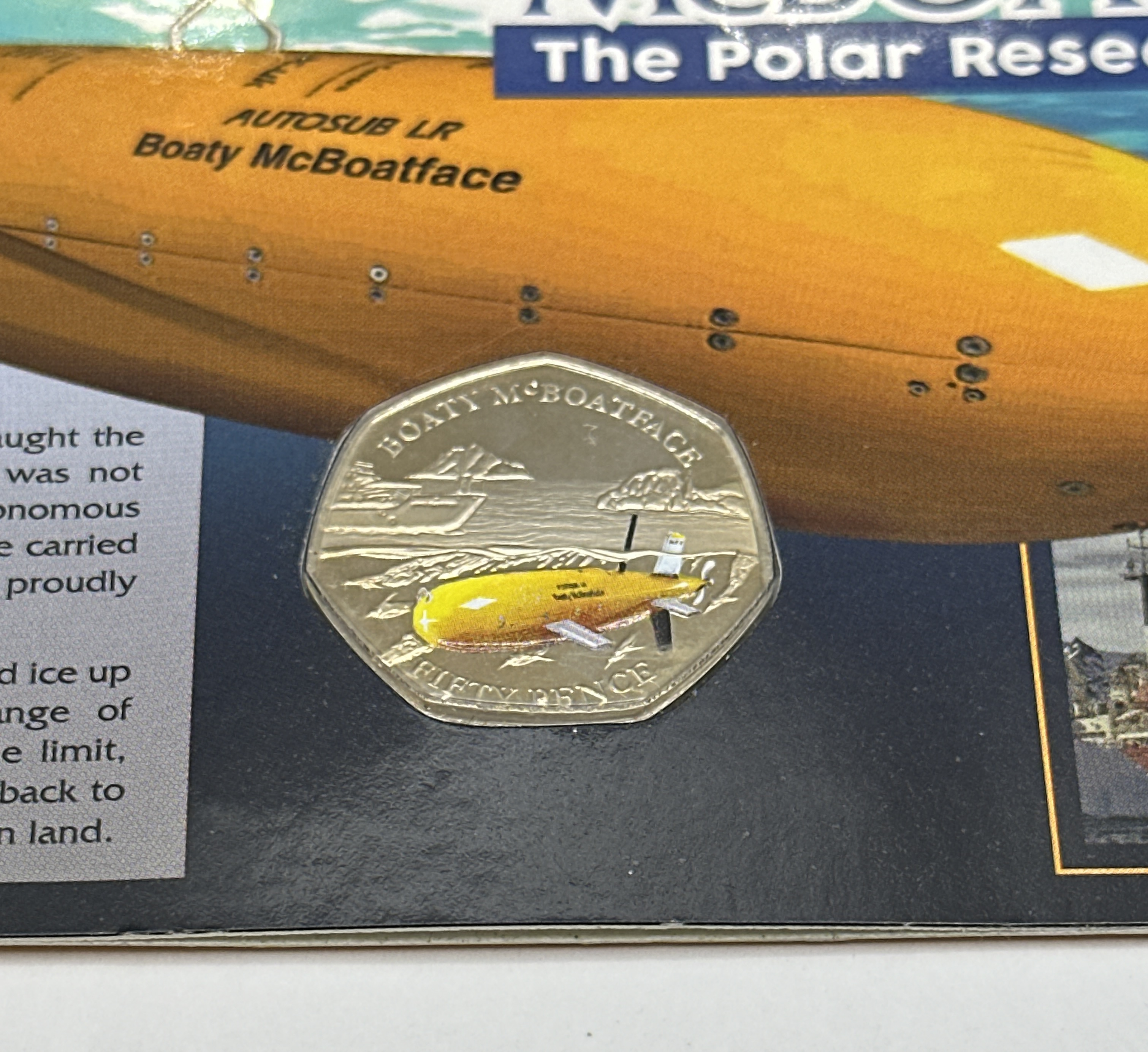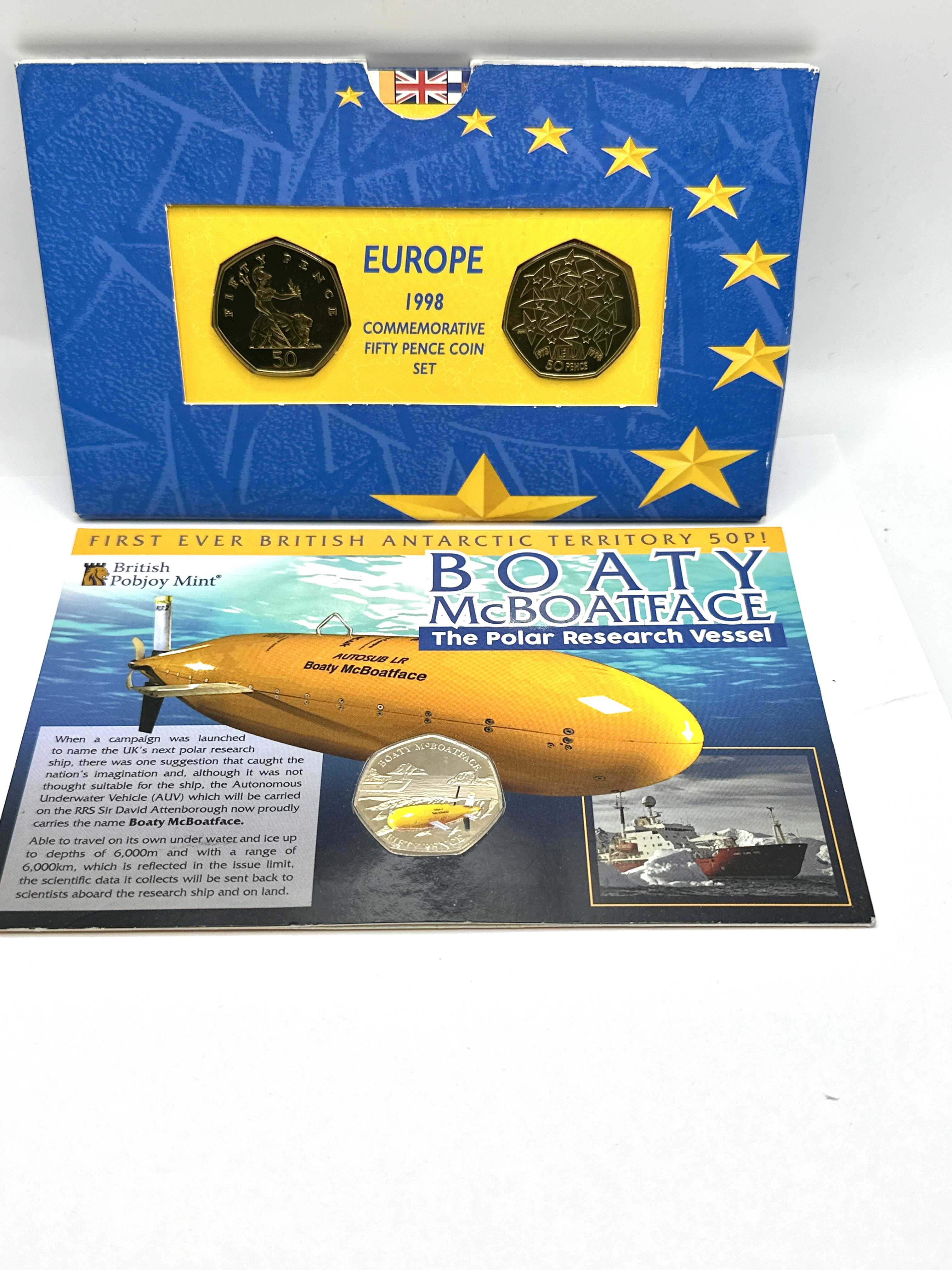 Two commemorative numismatic sets featuring fifty-pence denominations. The first set is the Europe 1998 Commemorative Fifty Pence Coin Set, which contains two coins. One coin displays the seated figure of Britannia, and the other features a ring of stars with the text 1973 EU 1998. These are housed in a blue and yellow cardboard presentation folder. The second item is a British Antarctic Territory 50p coin issued by the British Pobjoy Mint, commemorating the autonomous underwater vehicle Boaty McBoatface. The coin reverse features a partial-colour illustration of the yellow submersible. This coin is mounted on an illustrated informational display card.