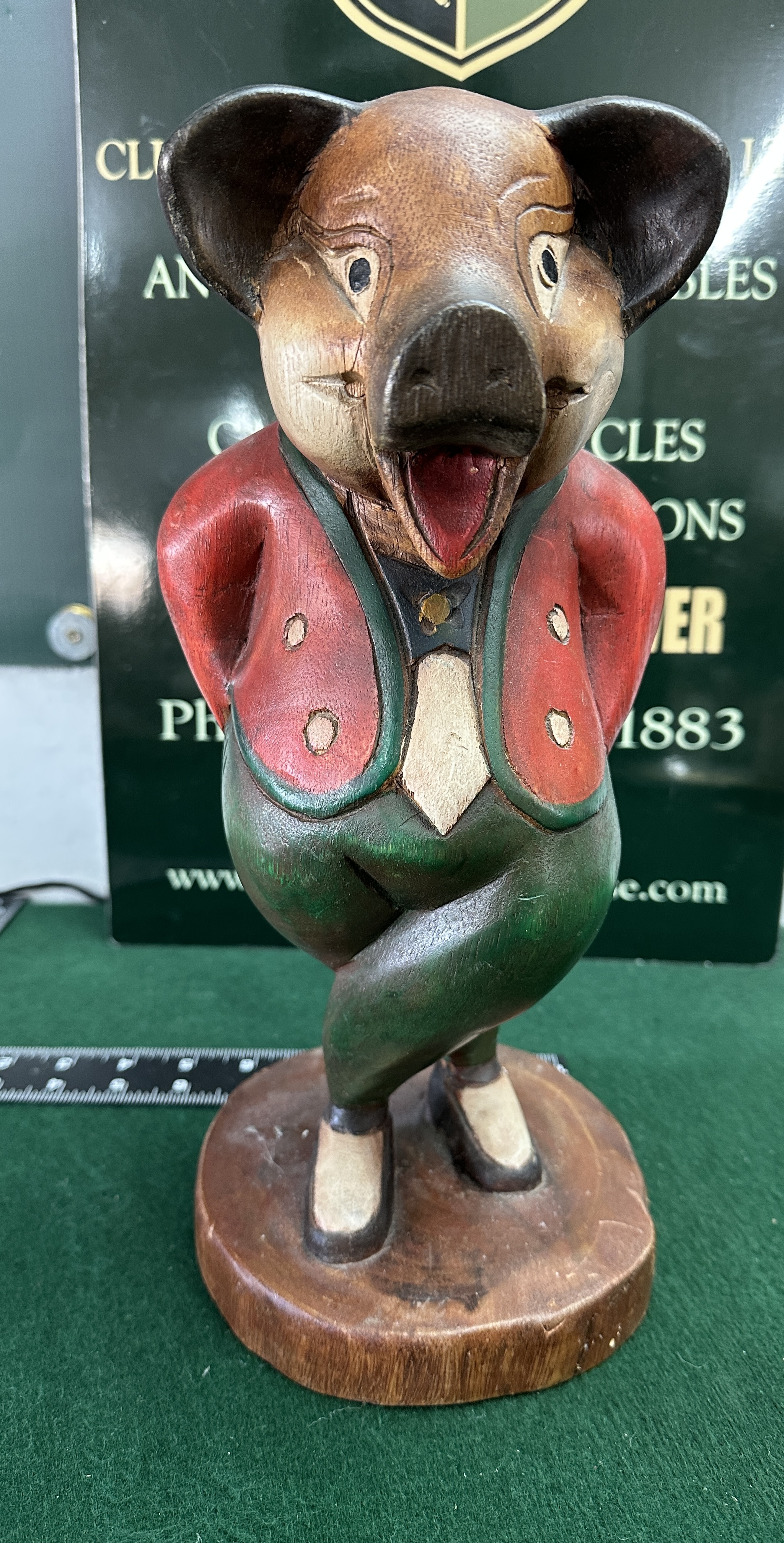wooden figure of an anthropomorphic pig in the French folk art style, depicted in a standing posture with legs crossed and hands positioned behind the back. The figure is finished with polychrome paint and stain, allowing the natural wood grain to remain visible across the body and base. The pig is dressed in formal attire consisting of a red frock-style jacket with green lapels and white buttons, a white cravat, green trousers, and white shoes with black soles. The head features an open mouth and carved facial details. The figure is mounted on an integral circular wooden base.