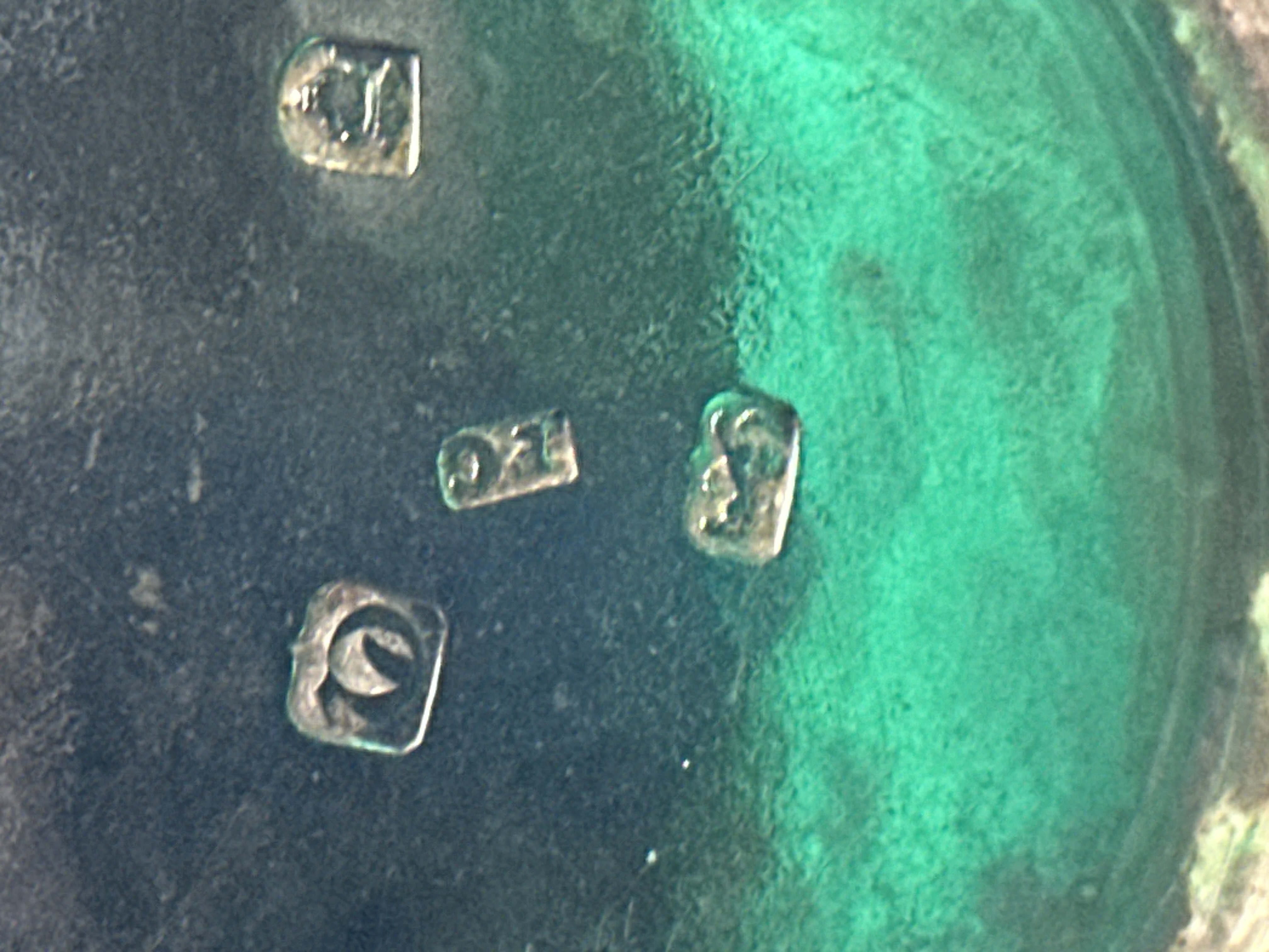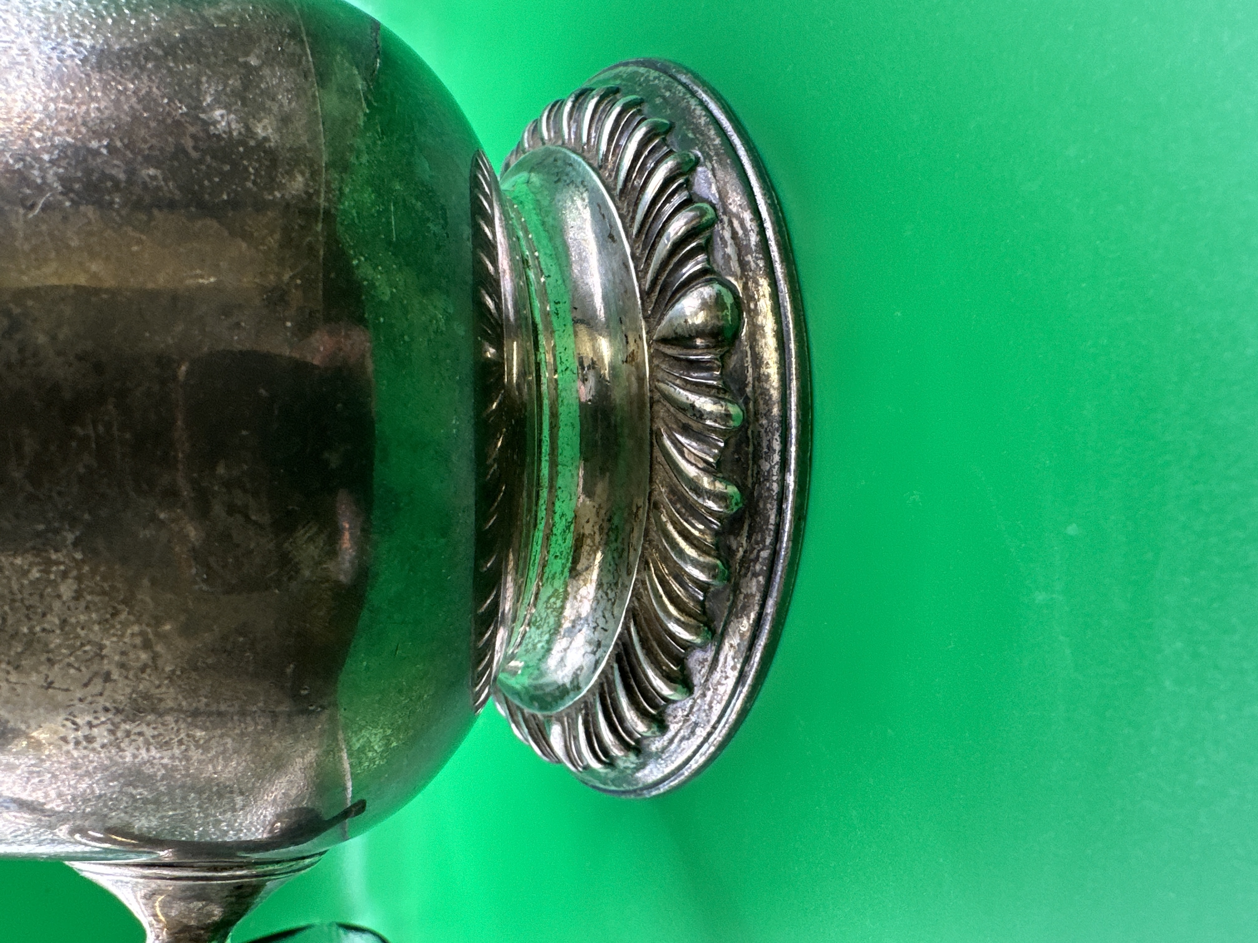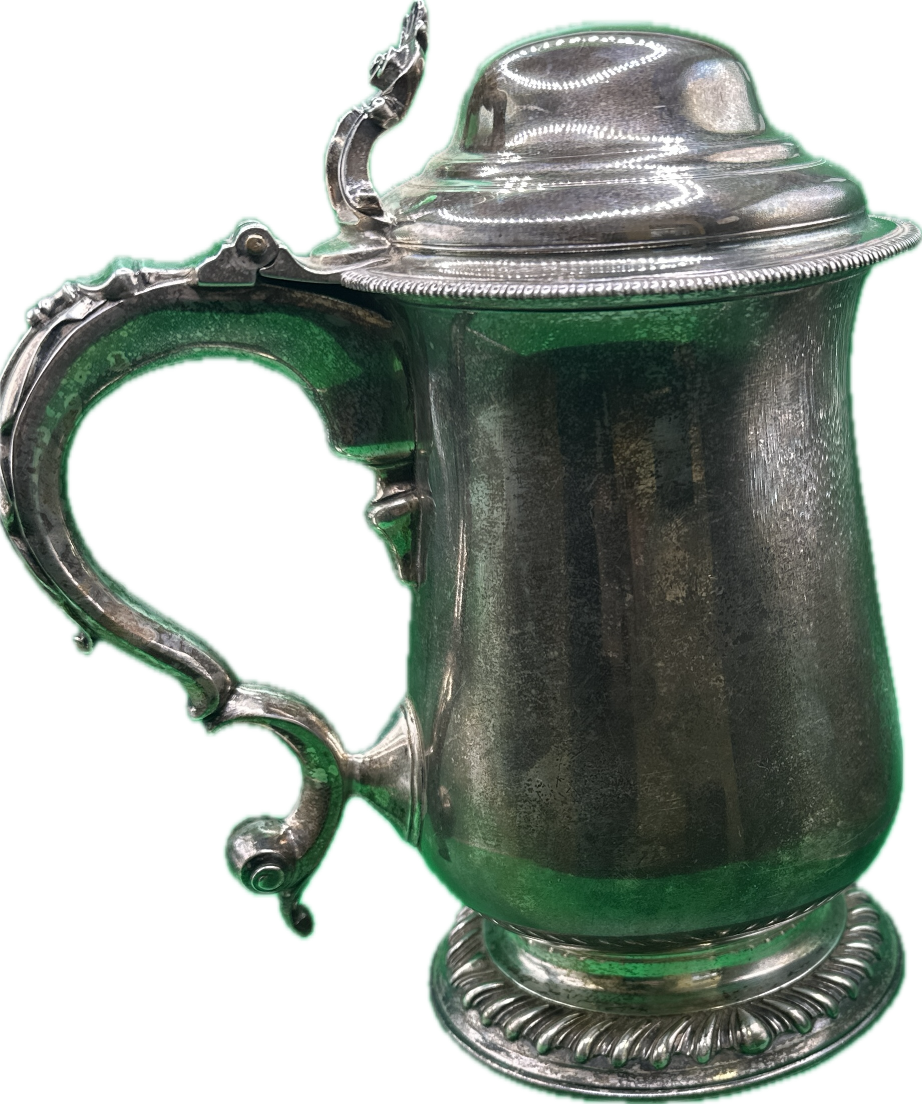 The item exhibits significant surface tarnish and a dark patina consistent with age. There is visible green residue around the joints and handle. The tankard appears structurally sound.