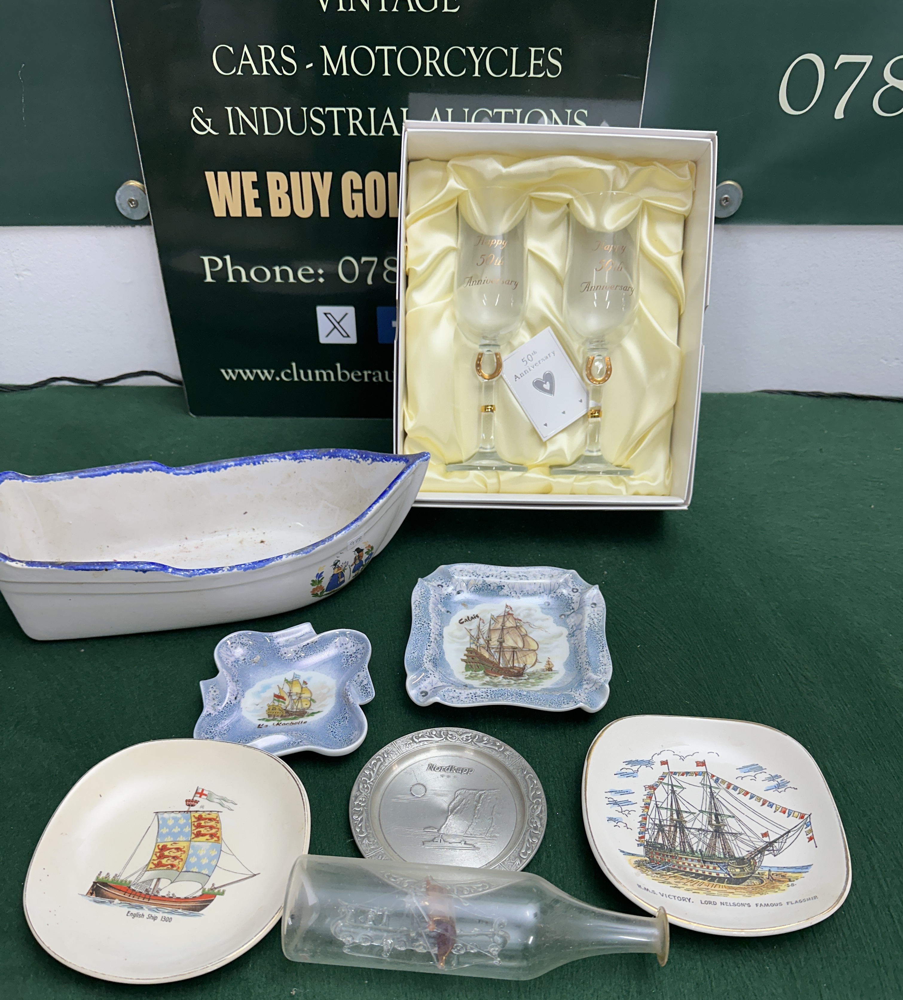 This collection features a boxed pair of glass champagne flutes with gold-coloured inscriptions reading Happy 50th Anniversary and gold-toned horseshoe-shaped motifs to the stems. The flutes are presented in a white satin-lined gift box with an anniversary card. The lot includes several nautical-themed ceramic items, notably a large bowl shaped like a boat hull with a blue-painted rim and transfer-printed figures. Also present are two shaped souvenir ashtrays depicting sailing ships for La Rochelle and Calais, a round decorative plate titled English Ship 1300, and a square-form plate titled H.M.S. VICTORY. LORD NELSON’S FAMOUS FLAGSHIP. The group is completed by a small embossed metal plate featuring a coastal scene inscribed Nordkapp and a model sailing ship housed within a clear glass bottle. No manufacturer marks are visible on the primary surfaces of the items.