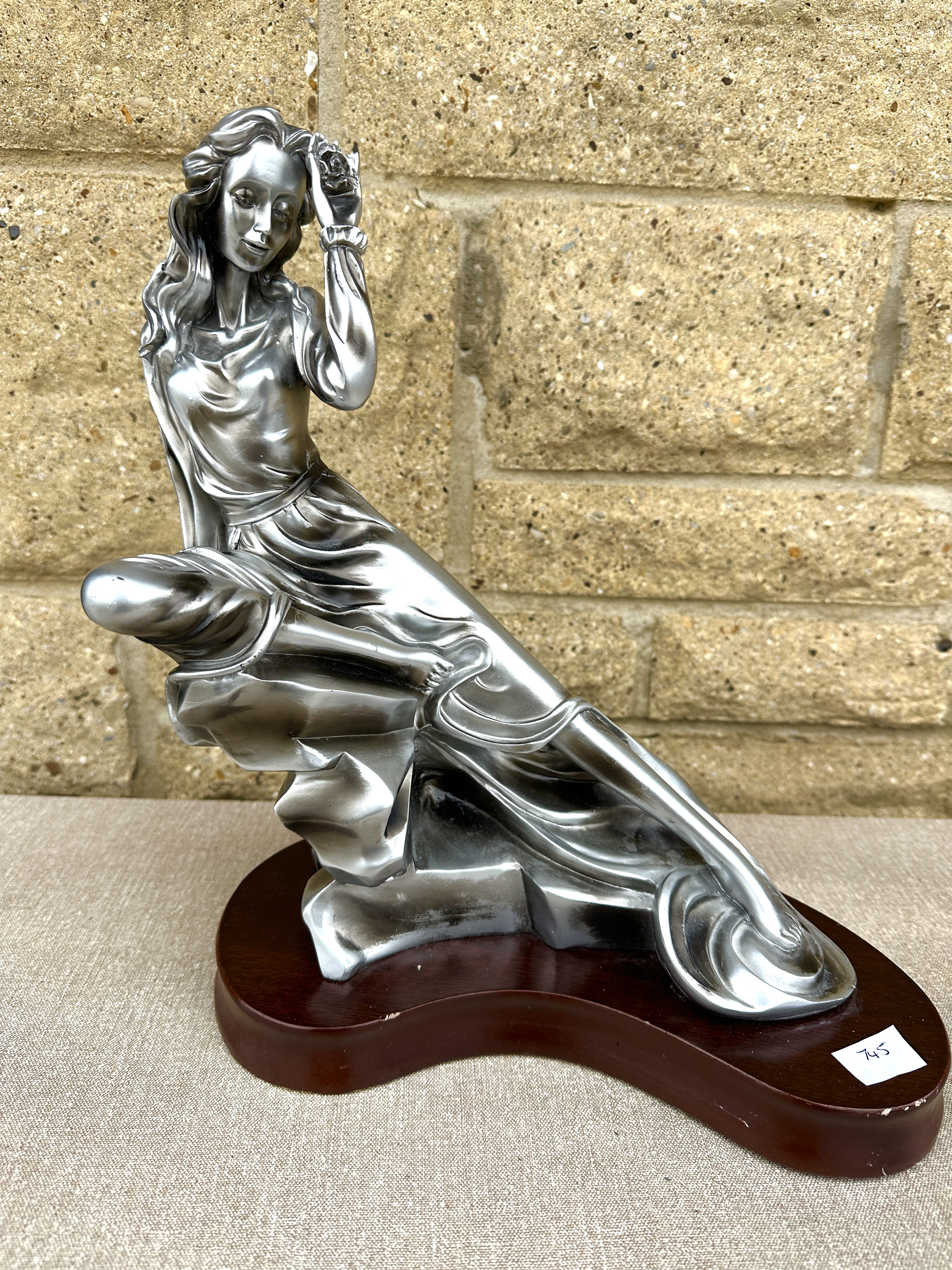 A contemporary silver-coloured figure of a seated female in flowing garments, attributed to Alice Heath for Austin Productions. The figure is finished with a metallic silver effect and mounted upon a contoured dark wood-finish plinth. The subject is depicted in a reclining pose with draped attire and hair swept back. A small white rectangular sticker is present on the base with the handwritten characters 745. No other marks or signatures are visible on the body or the base.