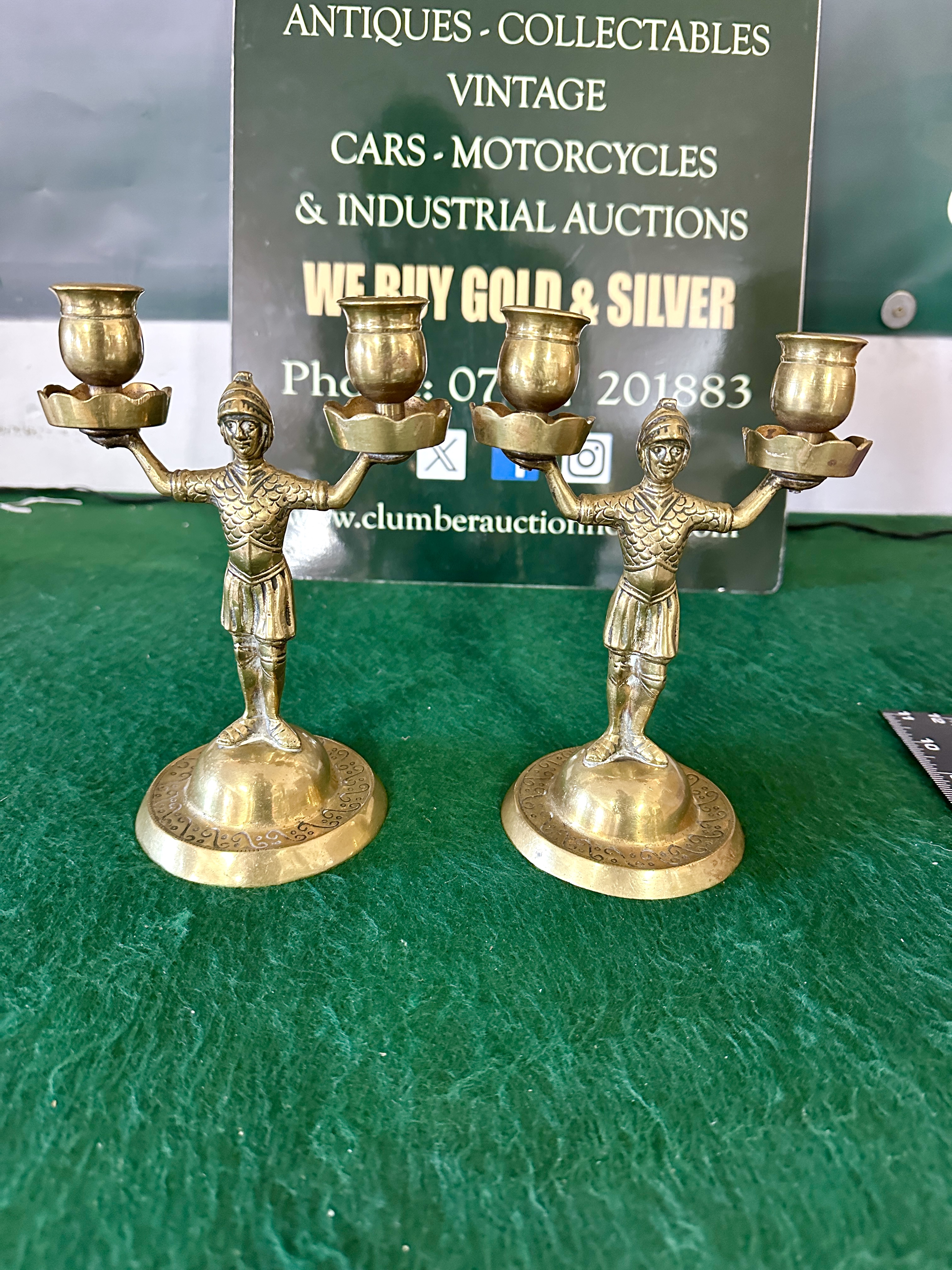 A pair of brass two-light candelabra in the Neoclassical style. Each piece features a central figure of a classical warrior wearing a helmet and scale-patterned tunic. The figures stand with arms outstretched, supporting two cup-form candle nozzles with scalloped drip pans. The figures are mounted on circular domed bases decorated with a border of incised scrollwork and geometric motifs. There are no legible manufacturer marks or characters present within the decoration. The items are constructed from cast brass with a golden-toned patina.