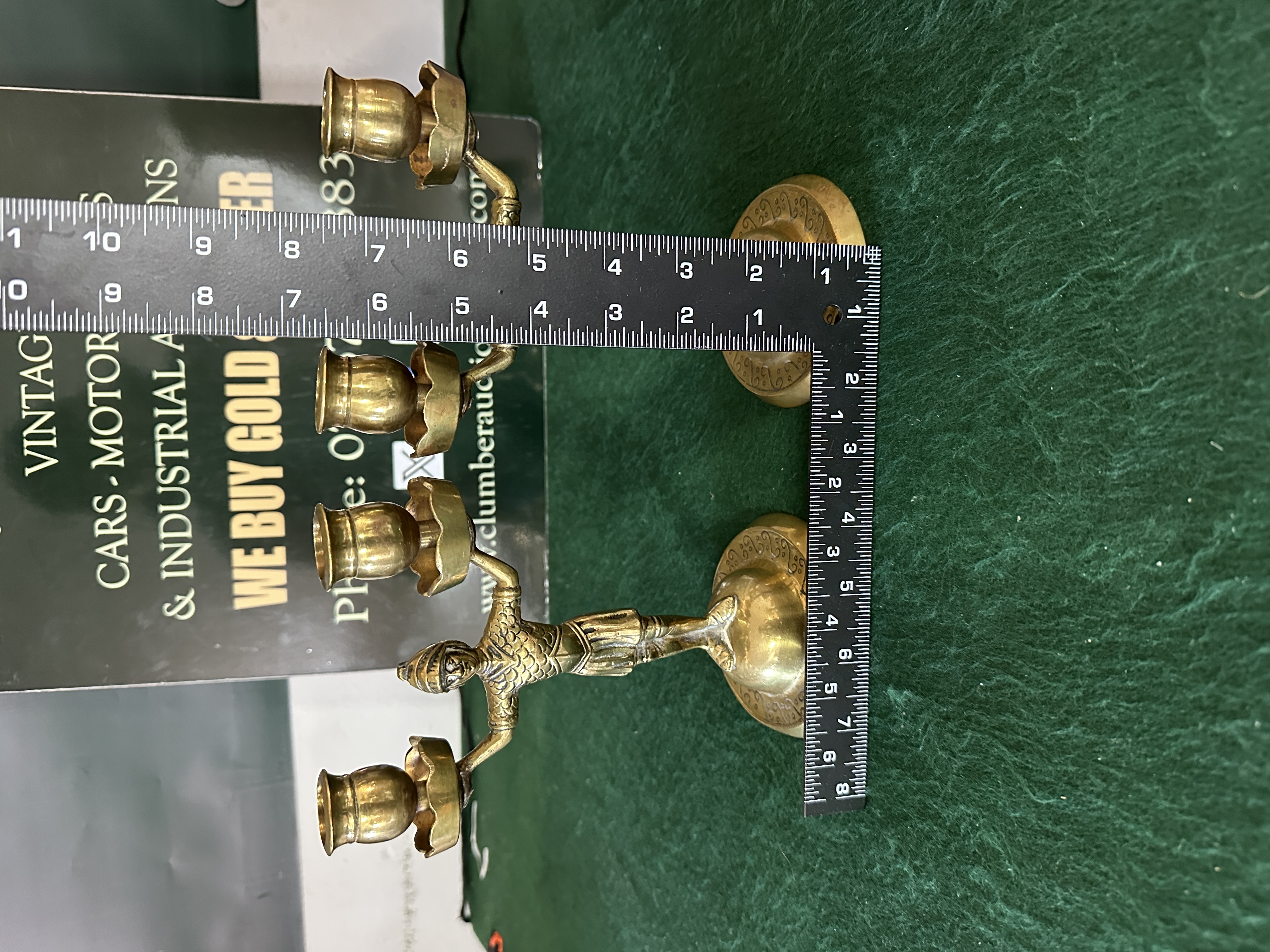 The pair shows surface oxidation and minor wear consistent with age. The golden-toned patina is intact with some darkening in the recessed details of the casting. No structural repairs or damage are evident.