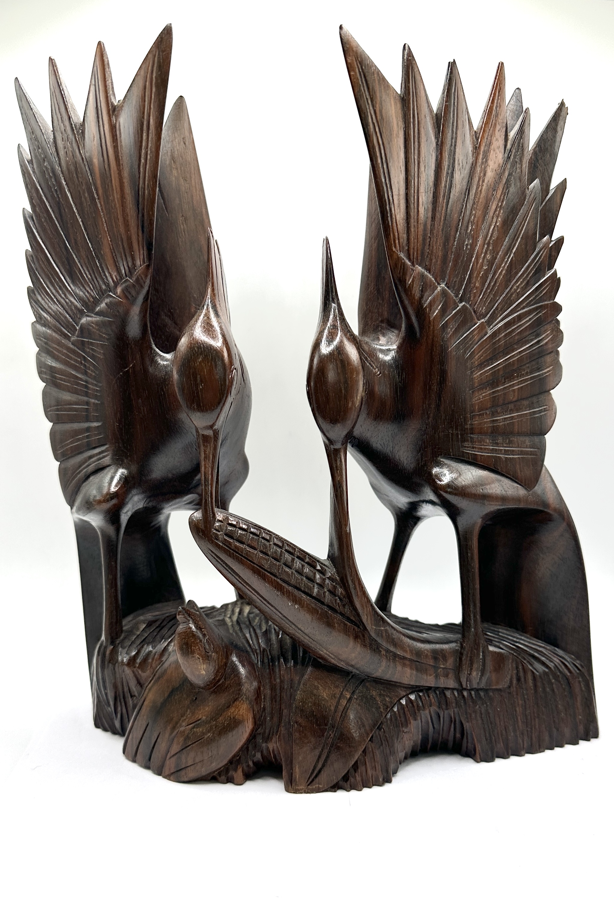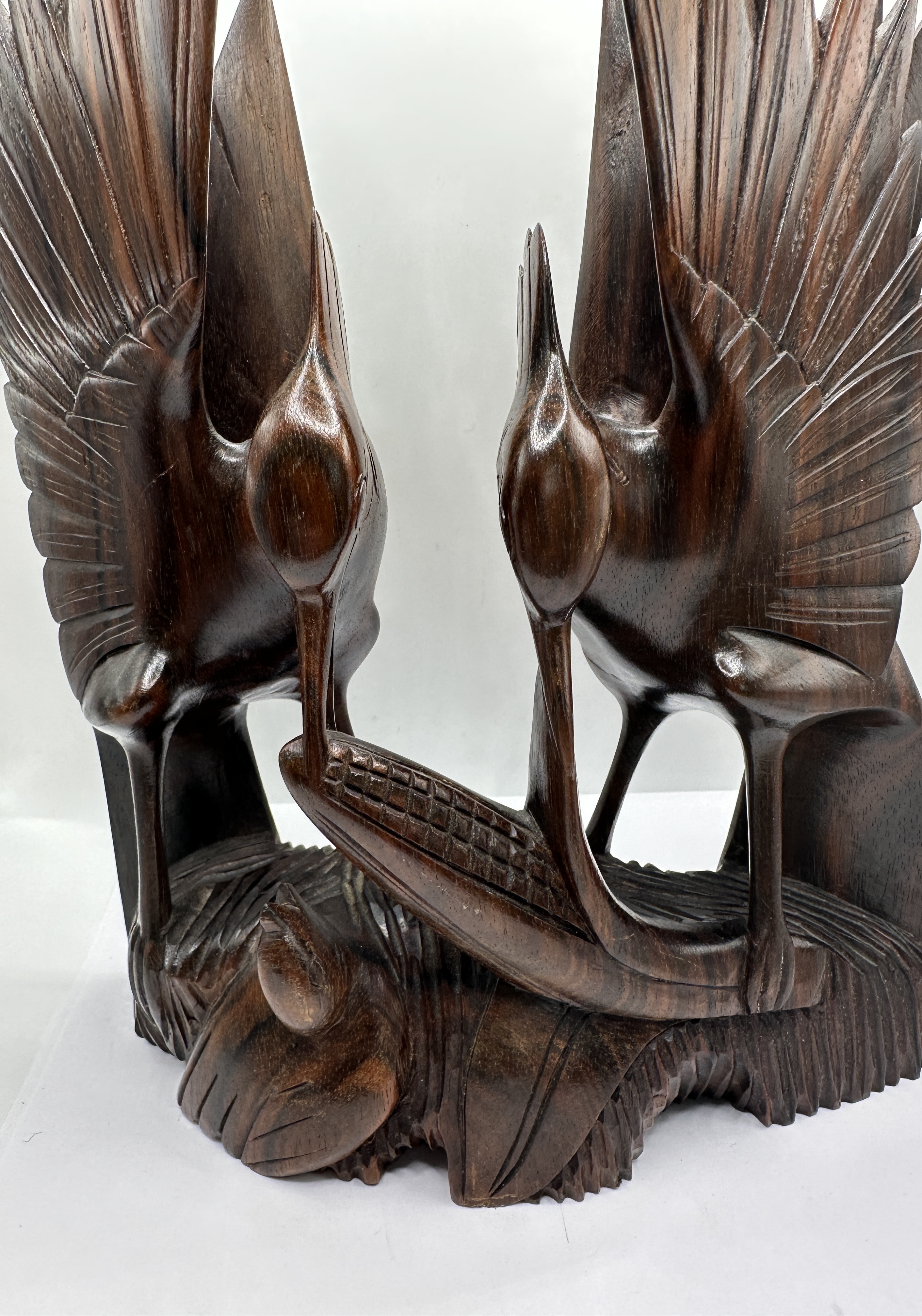 A large hand-carved wood sculpture depicting two herons with outstretched wings, their beaks directed towards a central ear of corn. The piece is fashioned from a dark, dense hardwood featuring a polished finish and a visible patina. The birds are positioned upon a textured naturalist base, intricately carved with patterns representing reeds and broad leaves. The style of carving and subject matter are consistent with mid-20th century Balinese artisan work. No maker’s marks or signatures are visible on the sculpture.