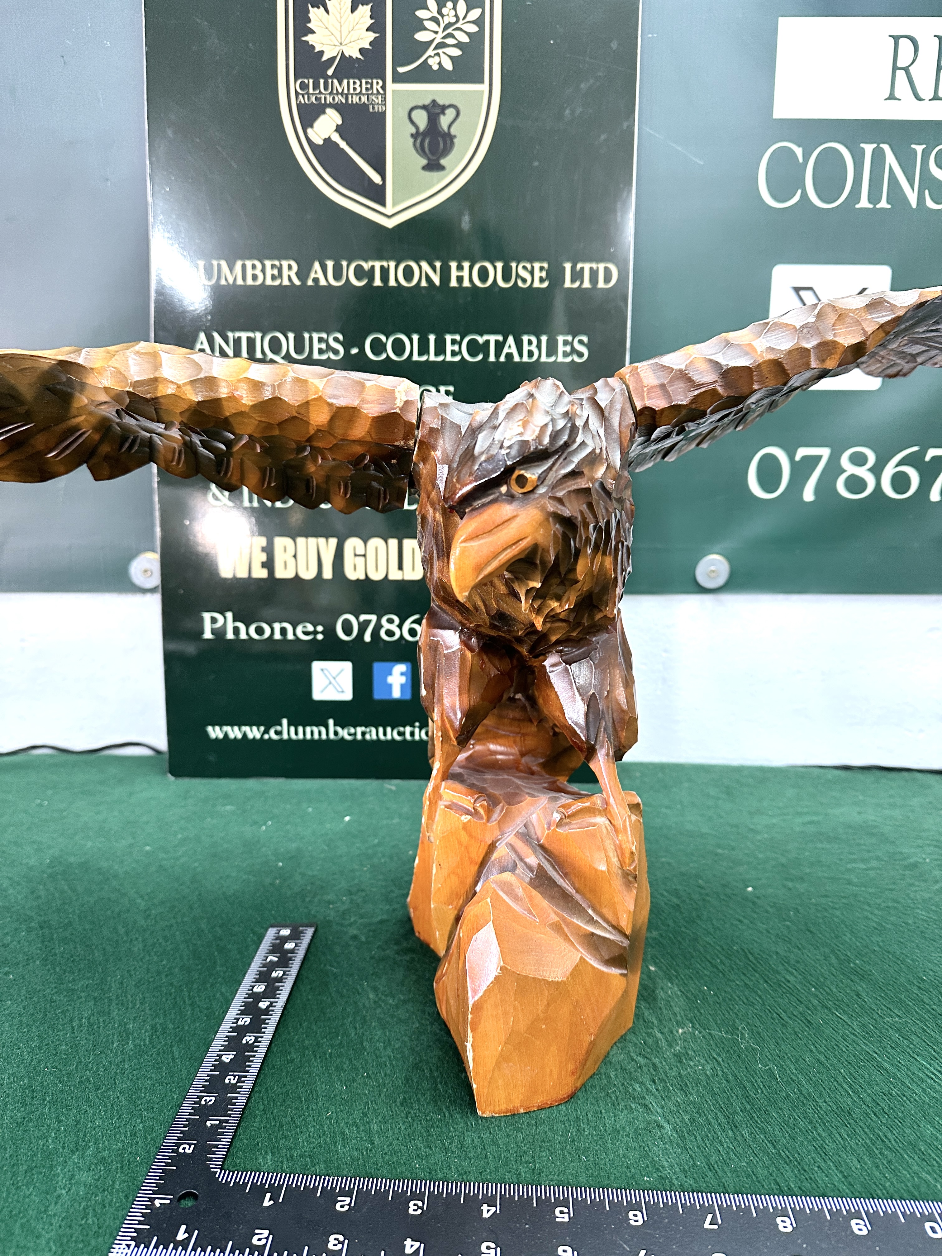 A large hand-carved wooden sculpture depicting an eagle with wings outstretched, perched upon a craggy rock-form base. The figure is executed in a rustic, faceted style with prominent chisel marks defining the feathers, talons, and head. The wood is finished in a multi-toned brown stain, highlighting the textured surface. The wings are separate components attached to the central body. No maker’s marks or signatures are visible.
